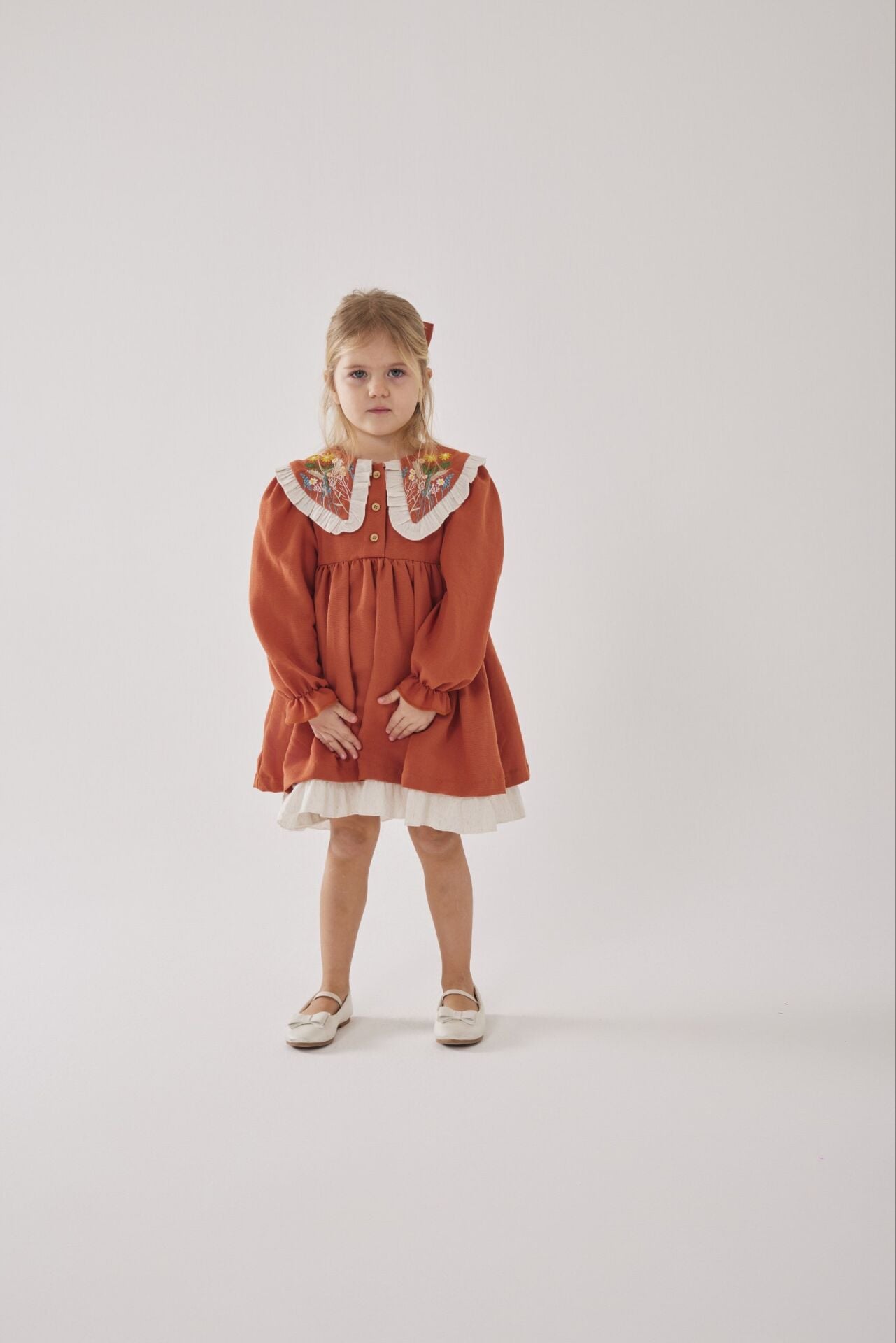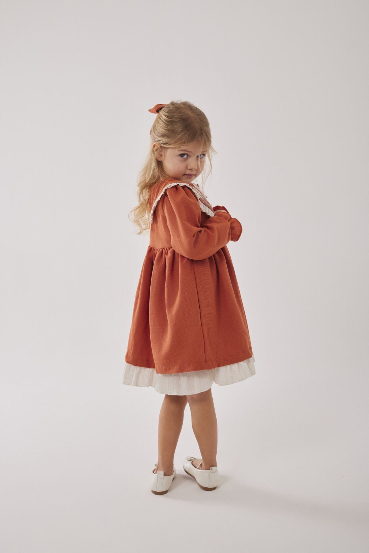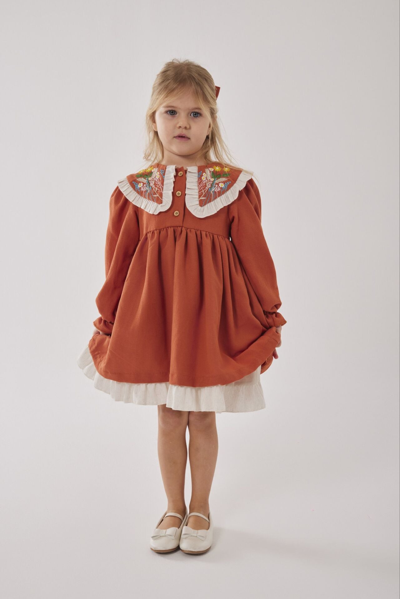Asar Kids Alaçatı Yaka Nakış Elbise - Turuncu