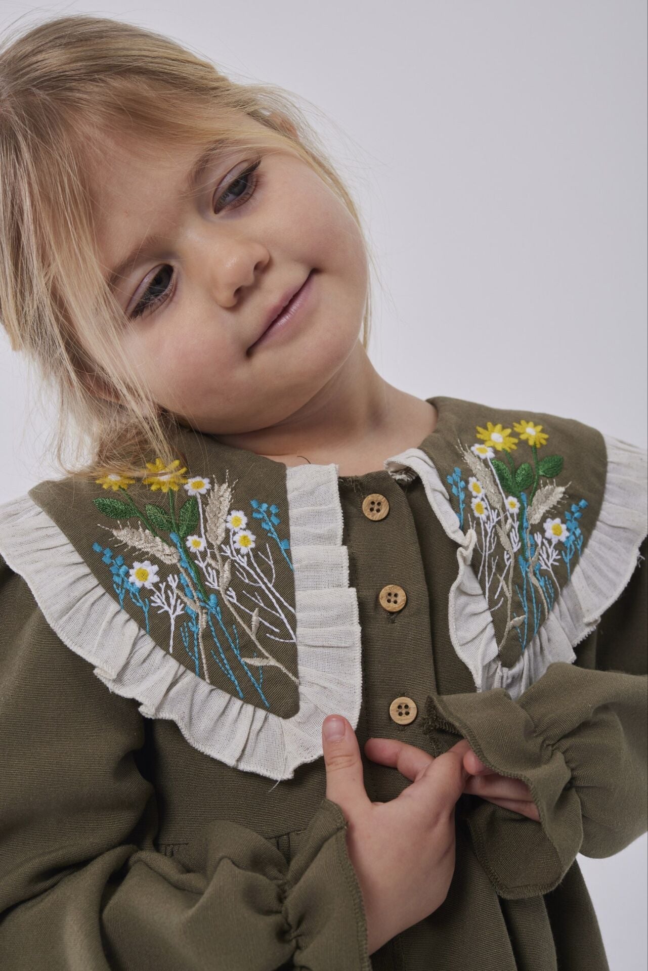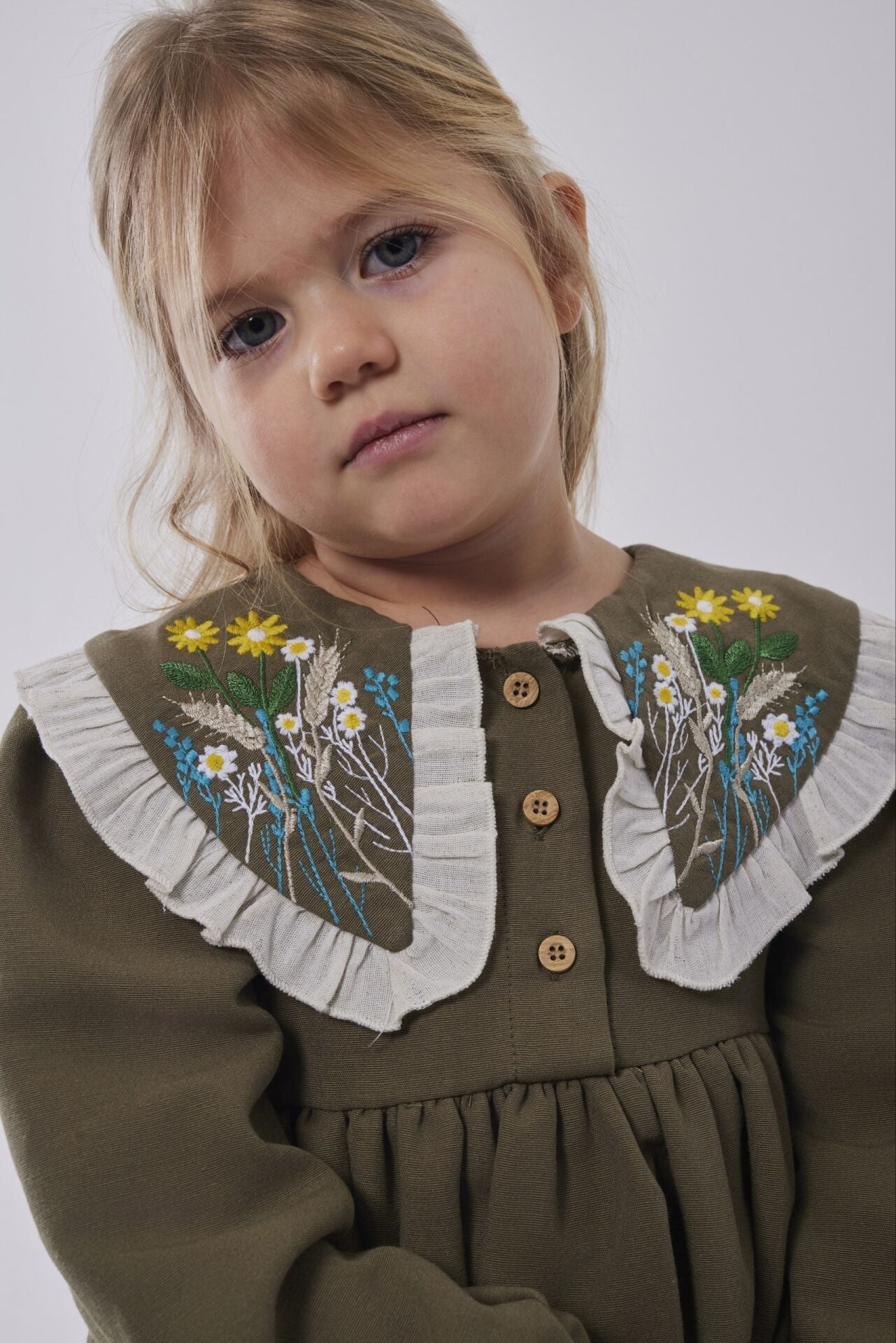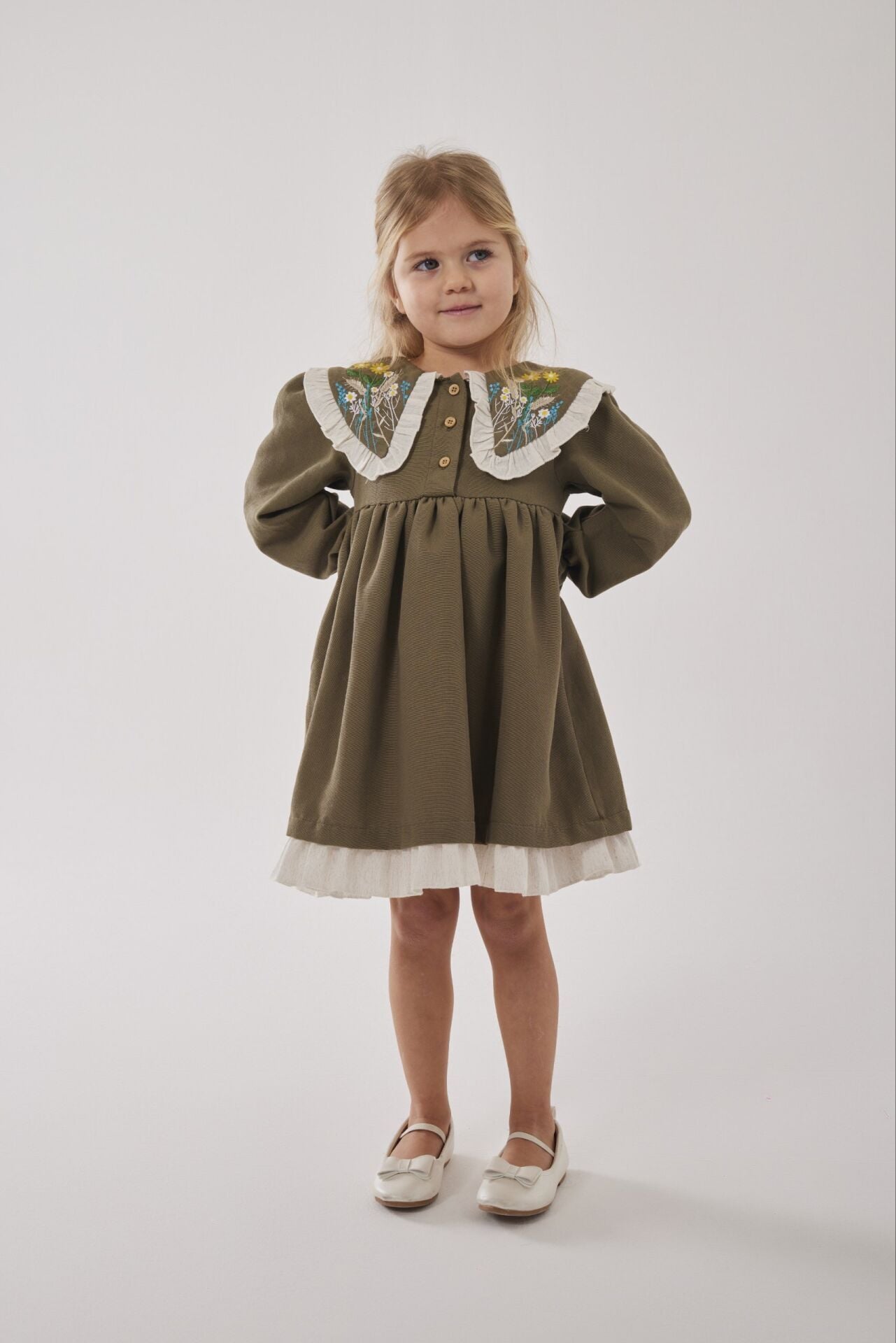 Asar Kids Alaçatı Yaka Nakış Elbise - Yeşil