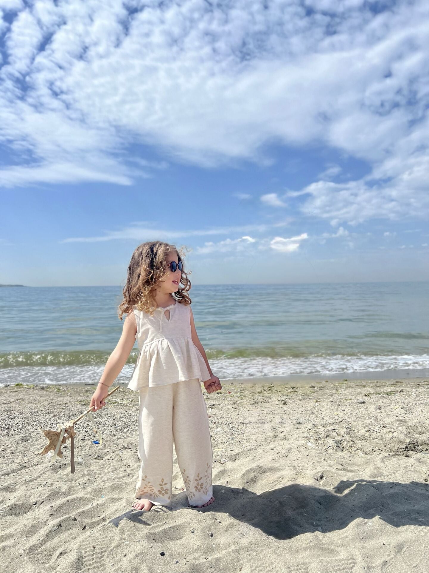 Asar Kids Çiçek Nakışlı Keten 2'li Takım - Krem