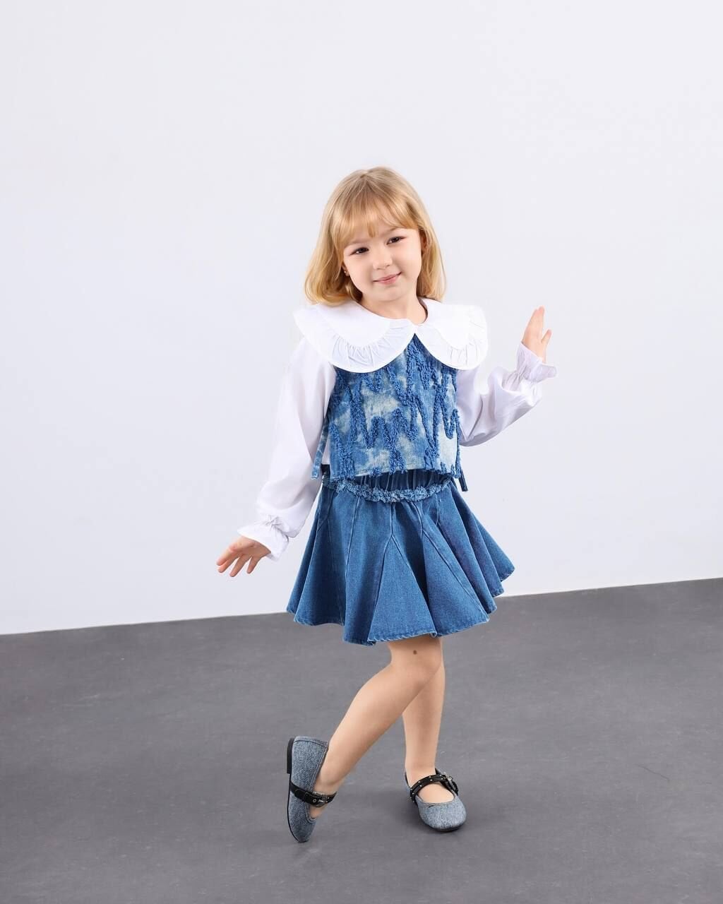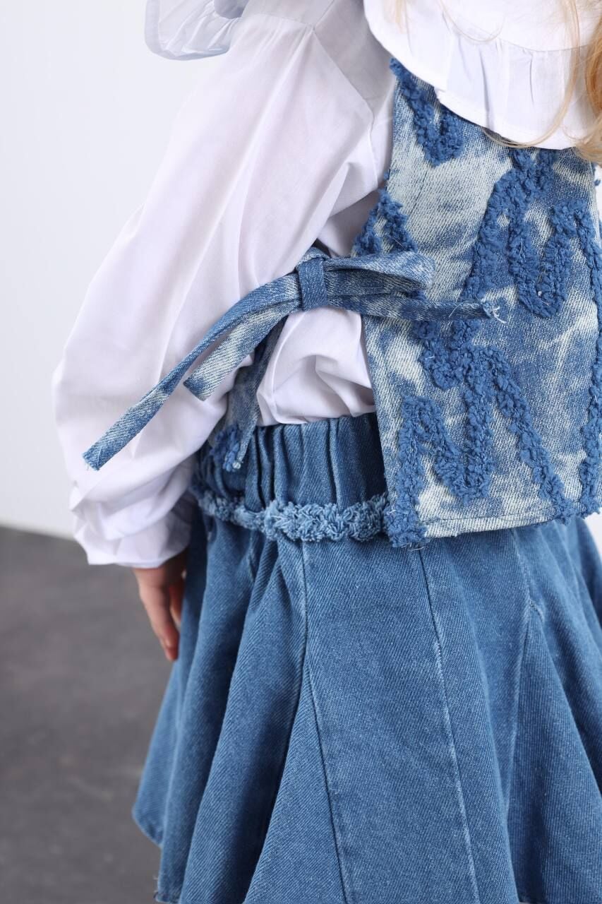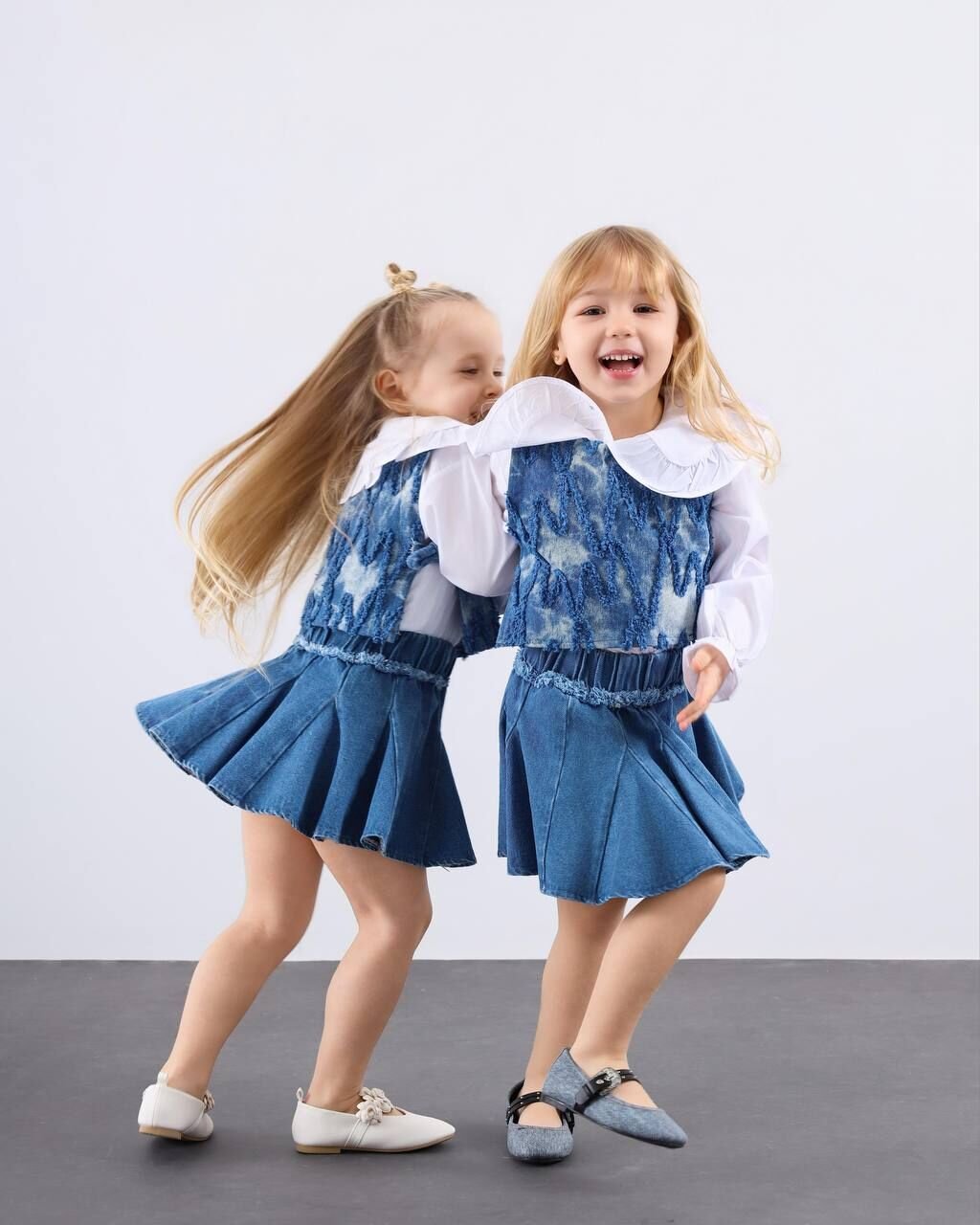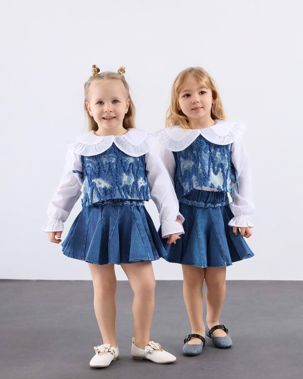 Asar Kids Denim Etek ve Süveter Gömlek 3'lü Takım - Mavi