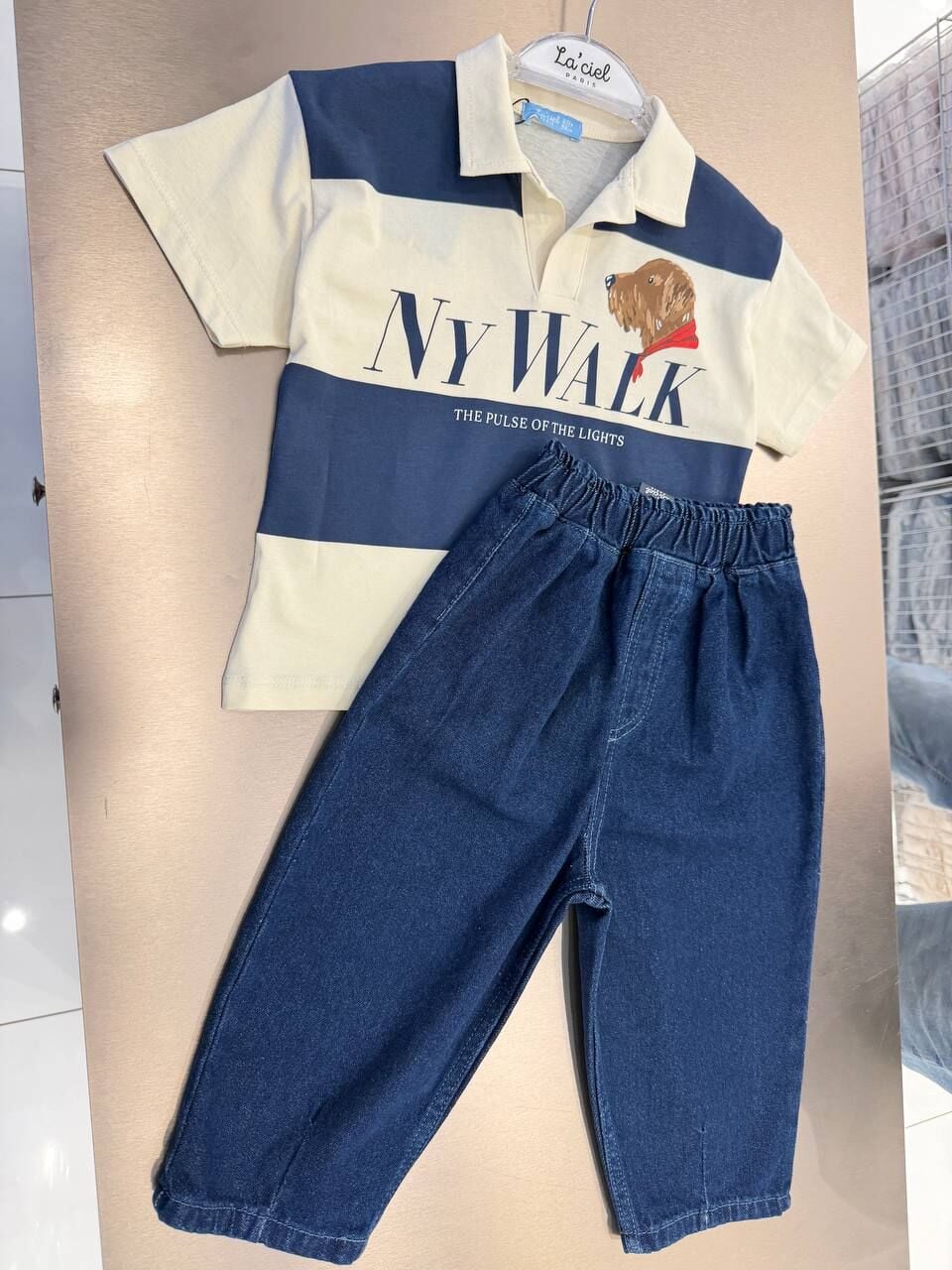 Asar Kids NY Walk Sloganlo Polo Yaka Tişört - Krem Koyu Mavi