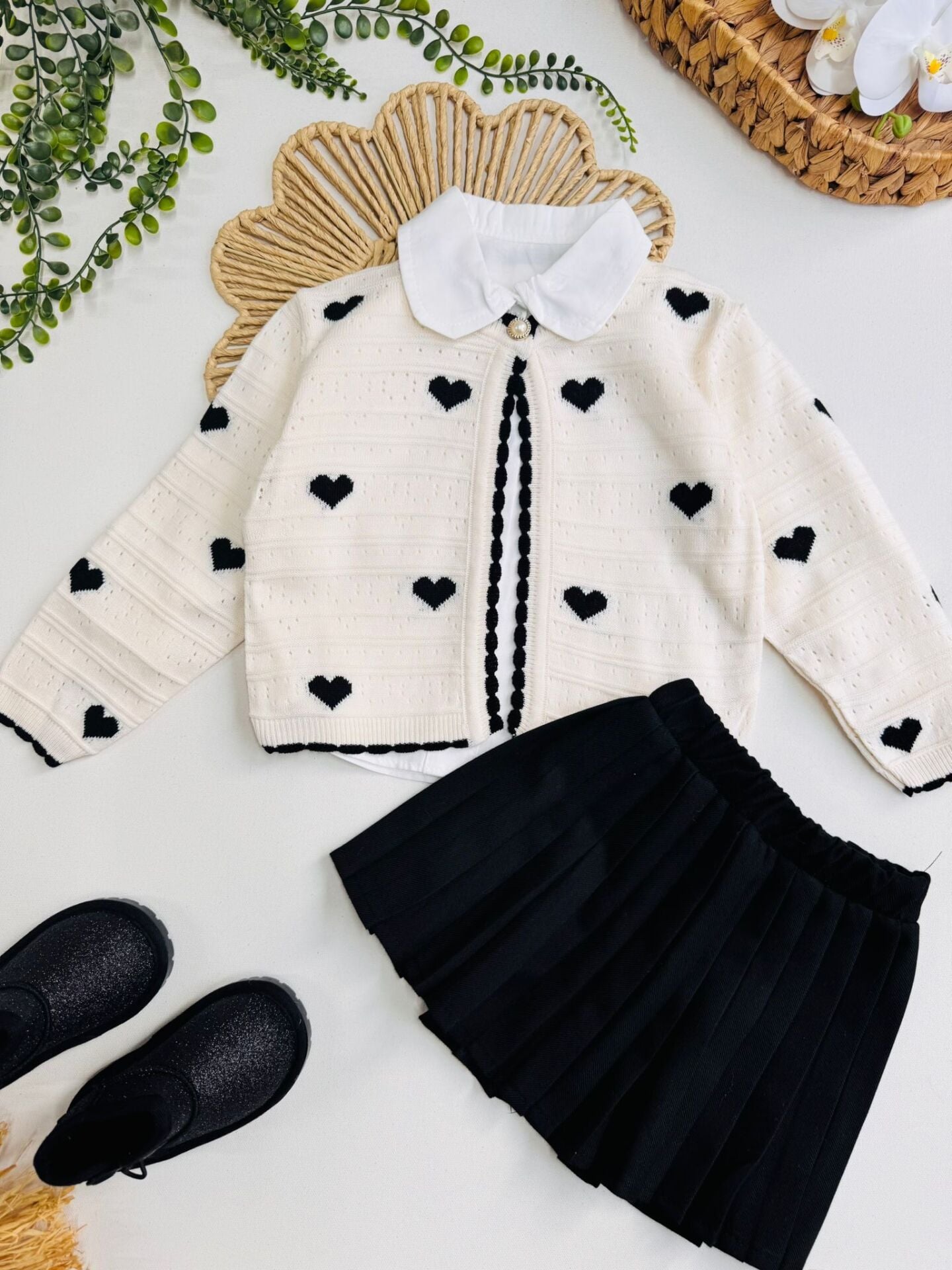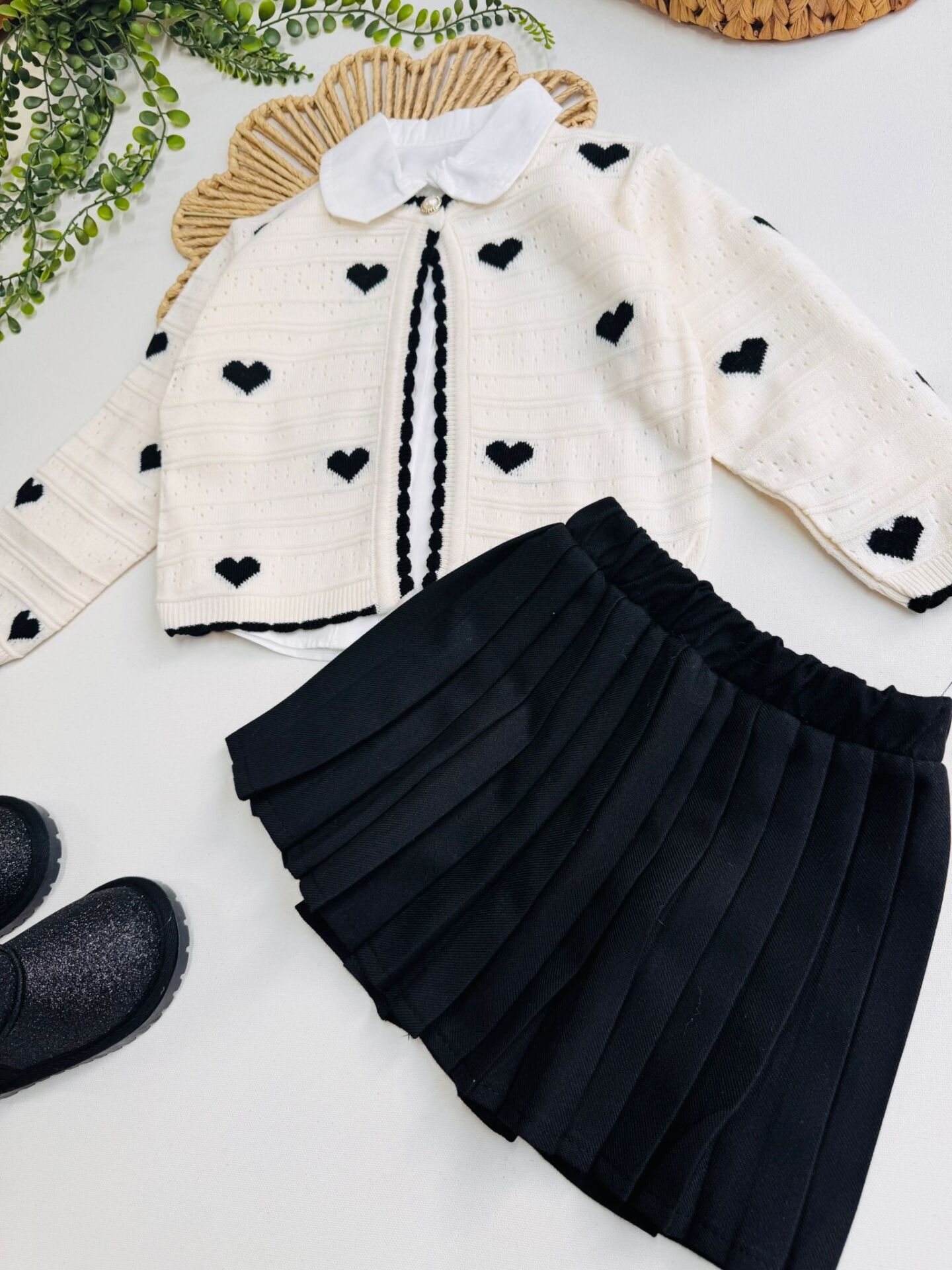 ‣ Triko hırka, dokuma piliseli etek ve pamuklu gömlek