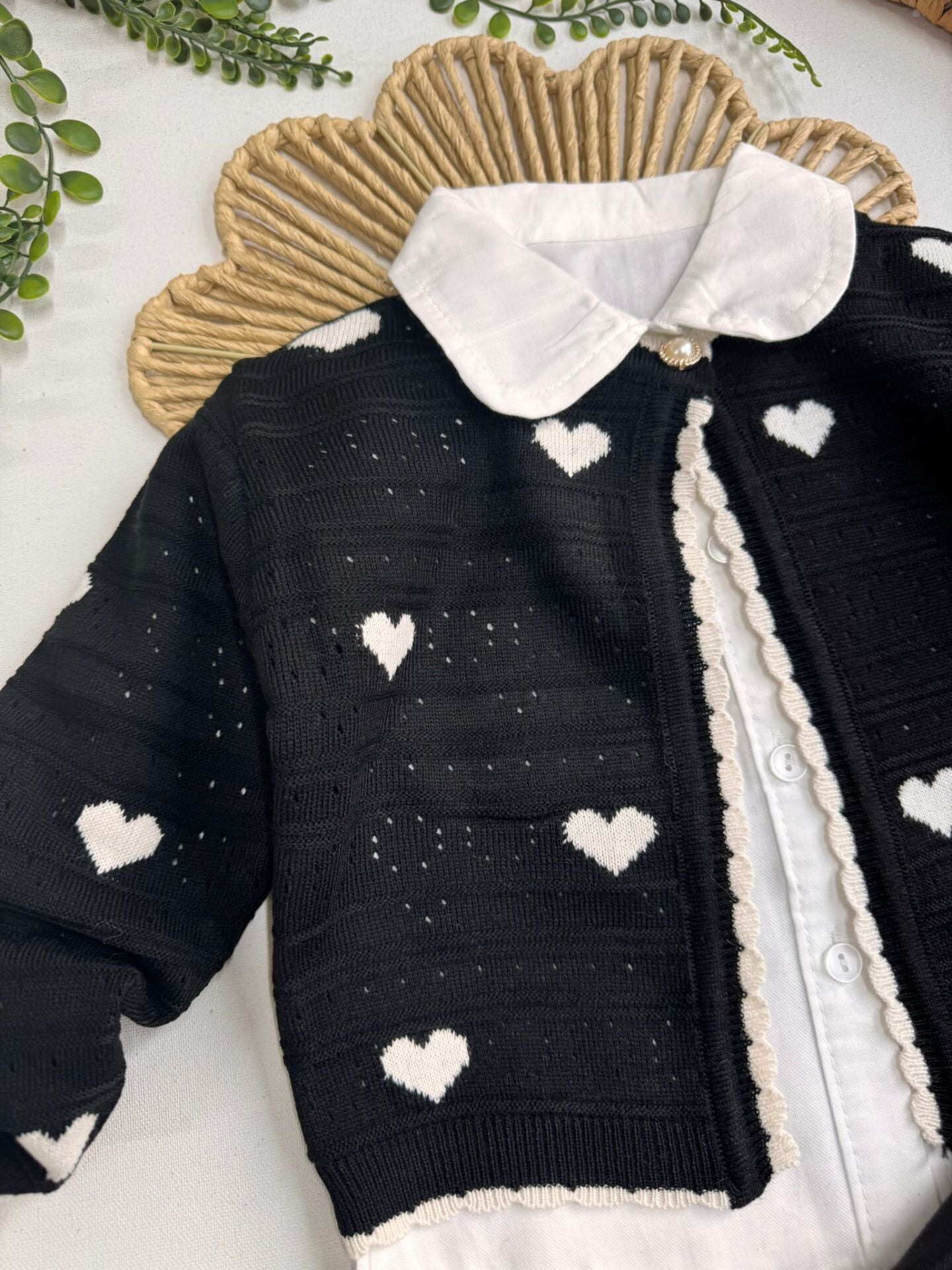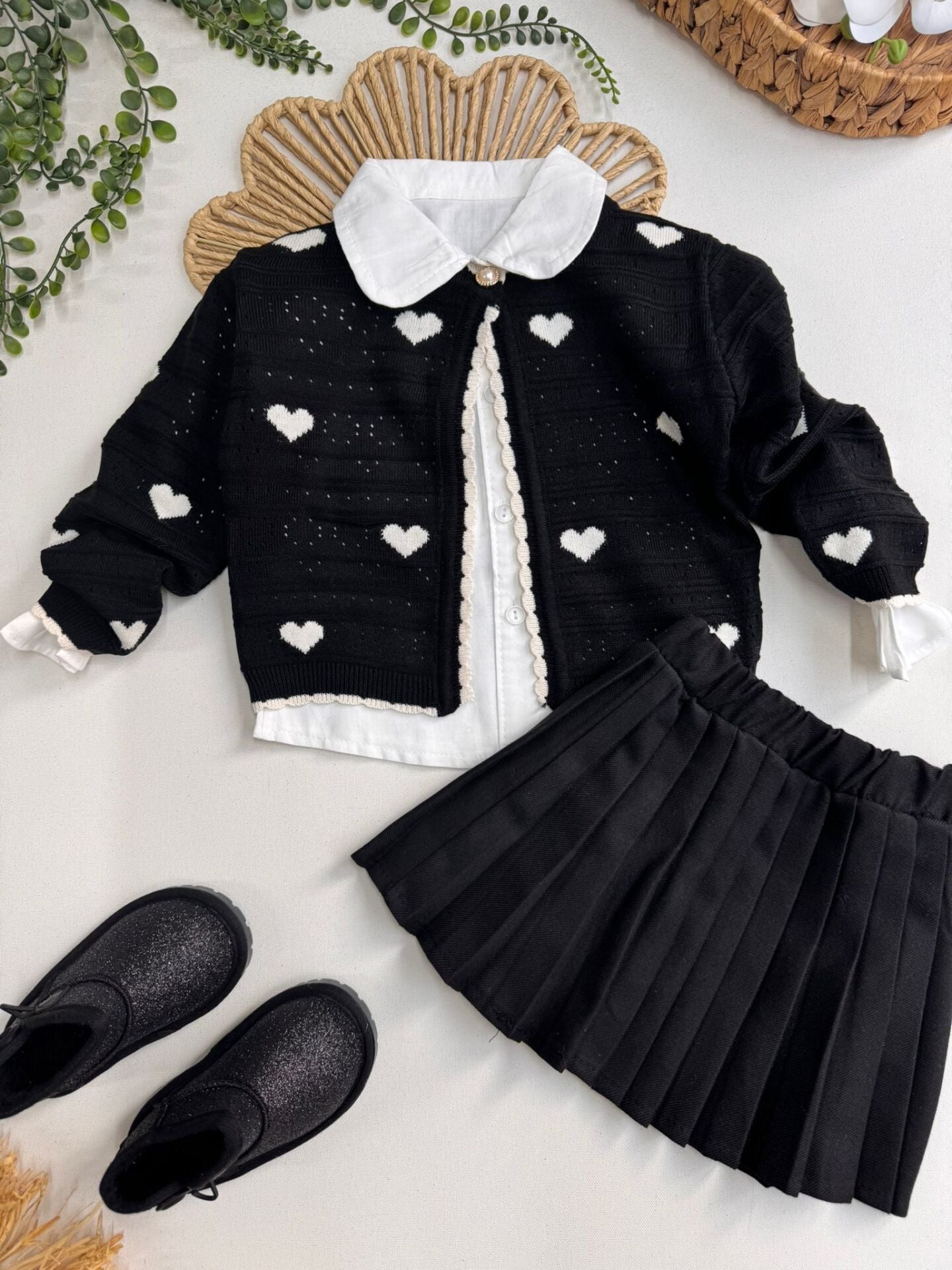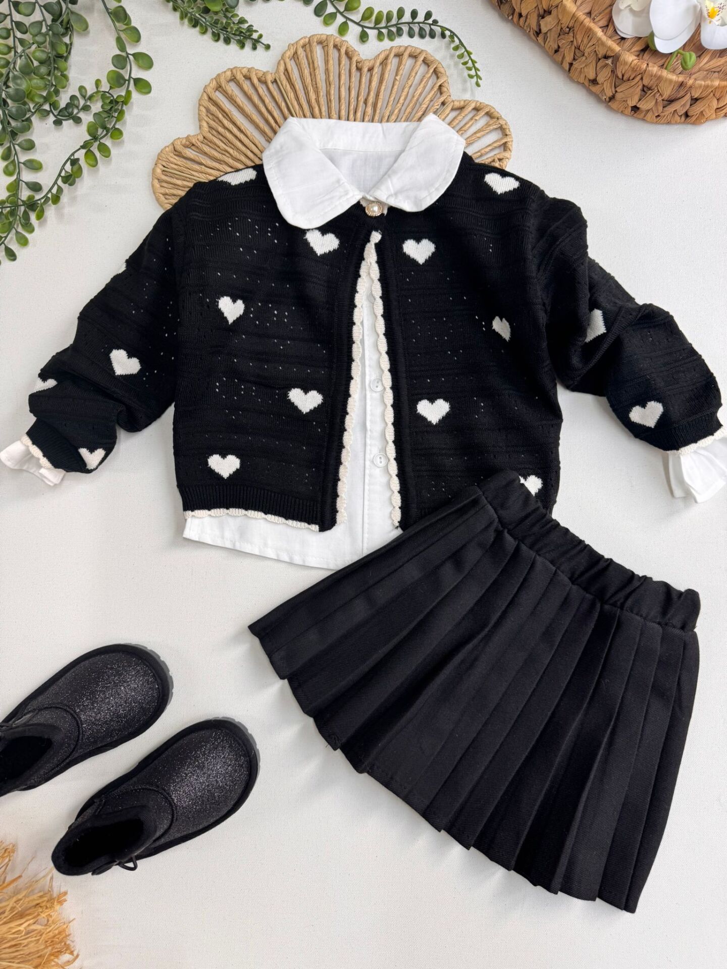 ‣ Triko hırka, dokuma piliseli etek ve pamuklu gömlek