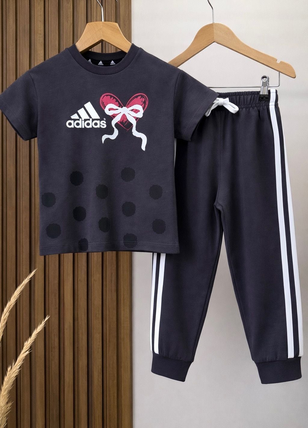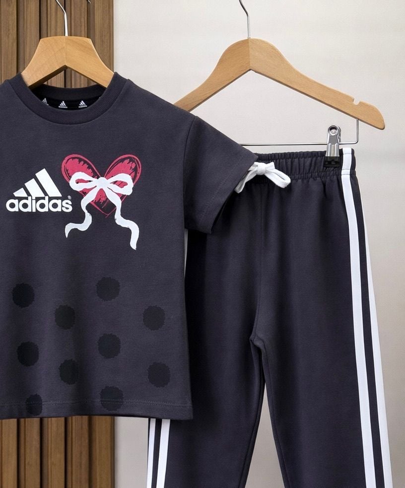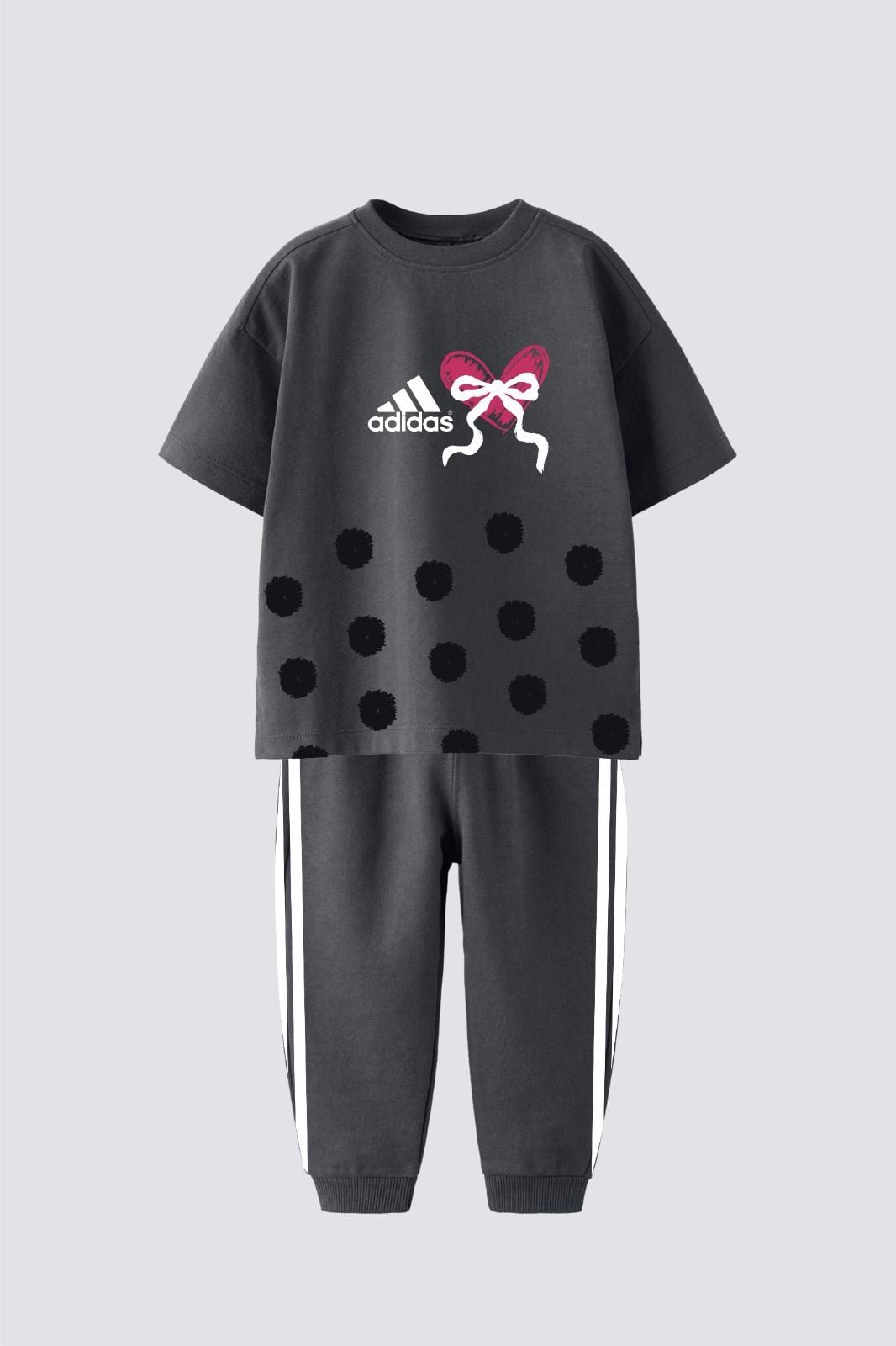 Asarkids 3 Çizgili Puantiyeli Tişört Eşofman 2'li Takım - Füme