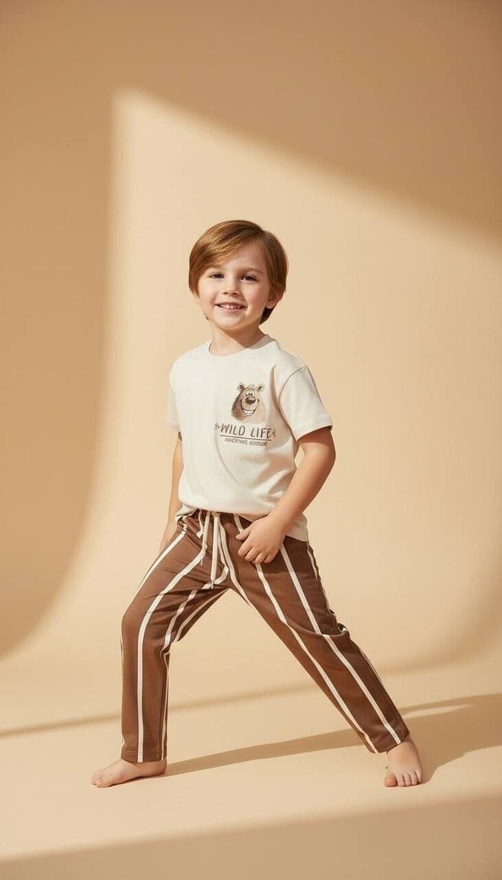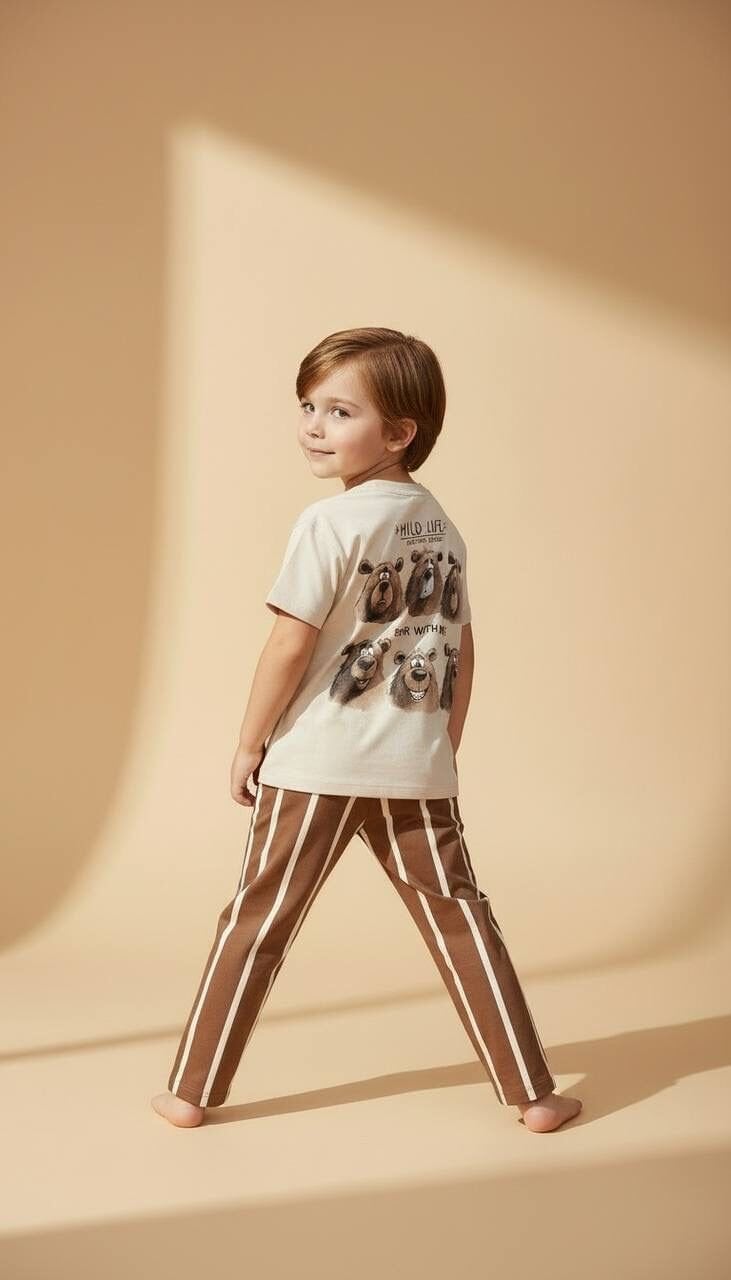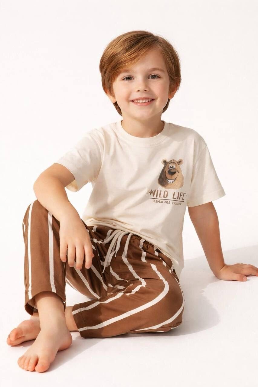 Asarkids Ayıcık Baskılı Çizgili Takım - Kahve