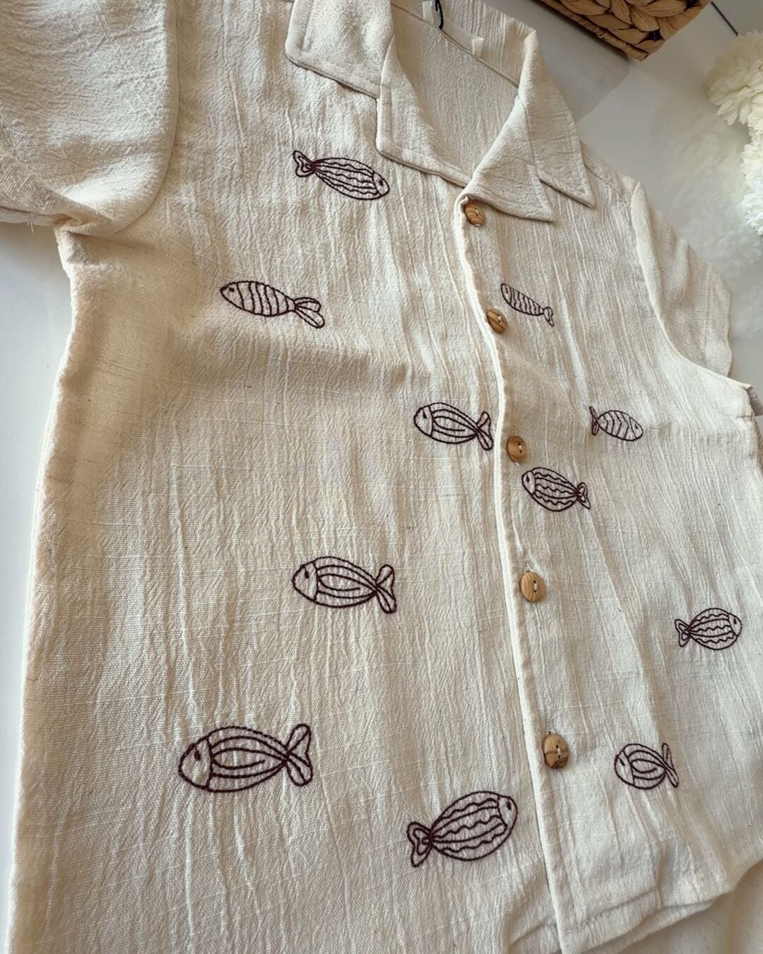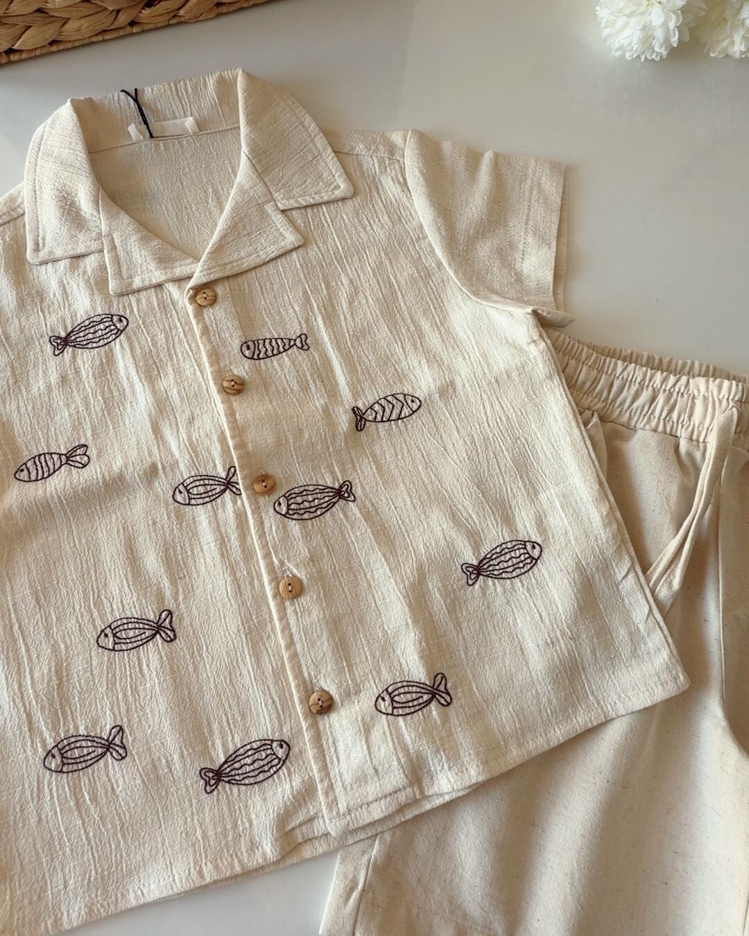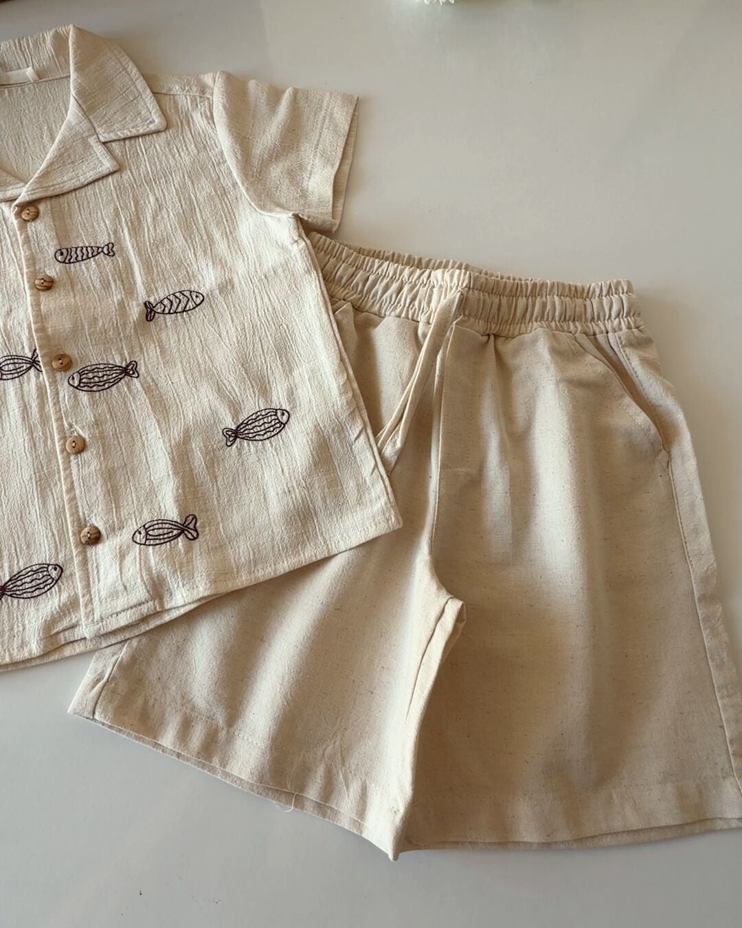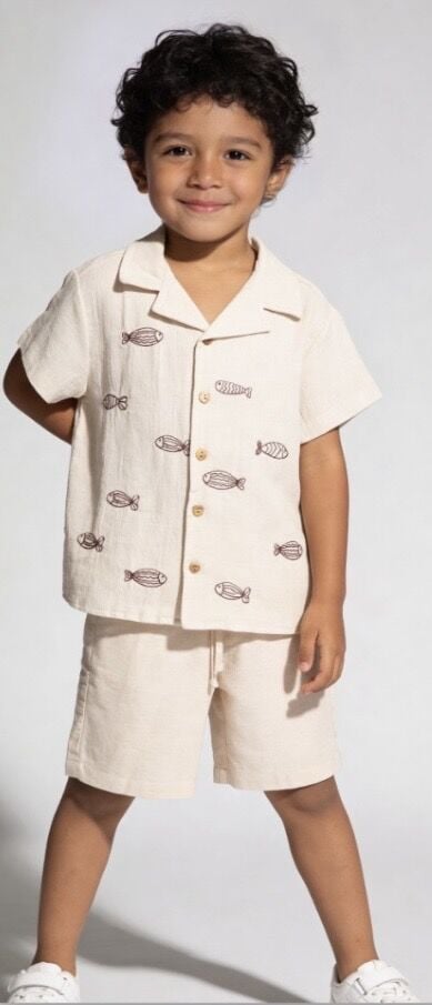 Asarkids Balık Nakışlı Tamamı Keten Gömlek 2'li Set - Kahve Krem