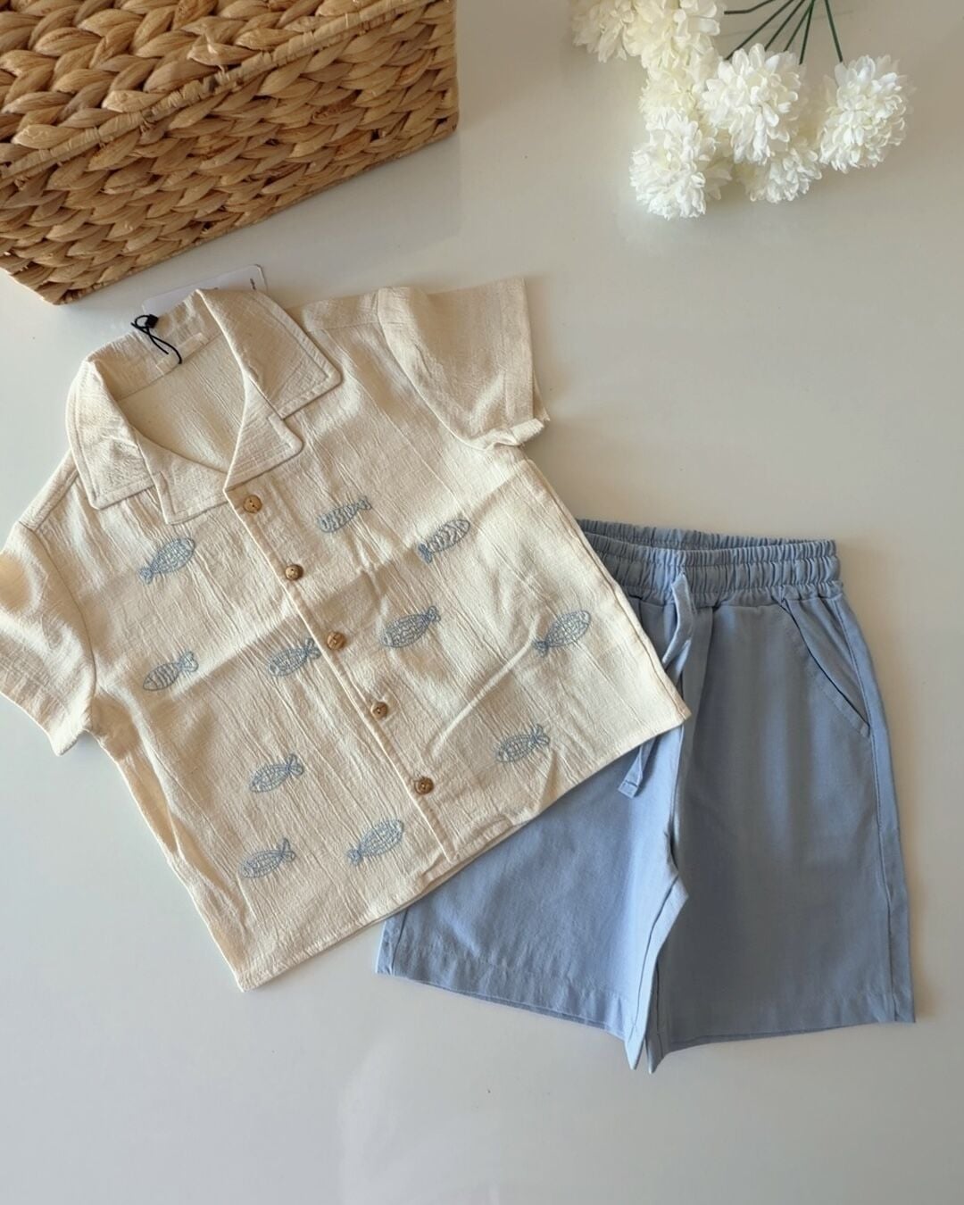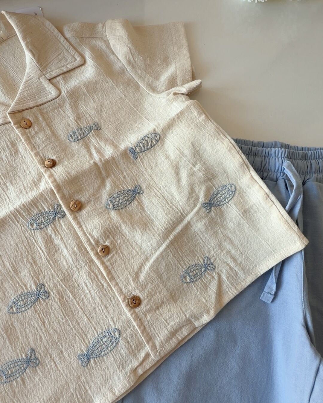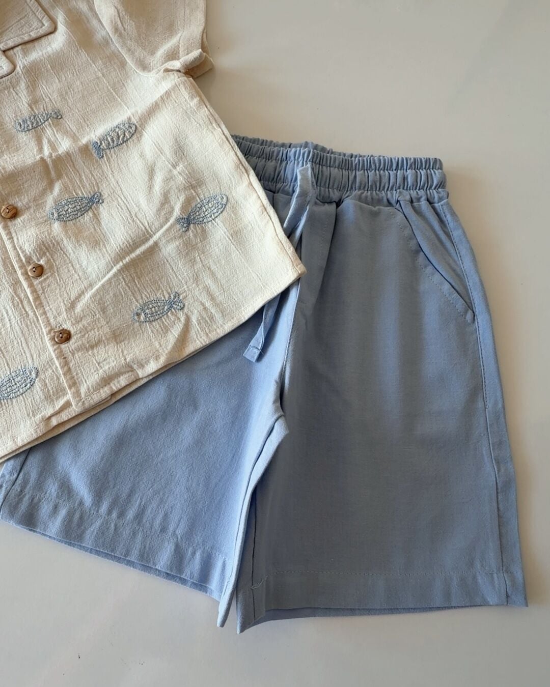 Asarkids Balık Nakışlı Tamamı Keten Gömlek 2'li Set - Mavi Krem