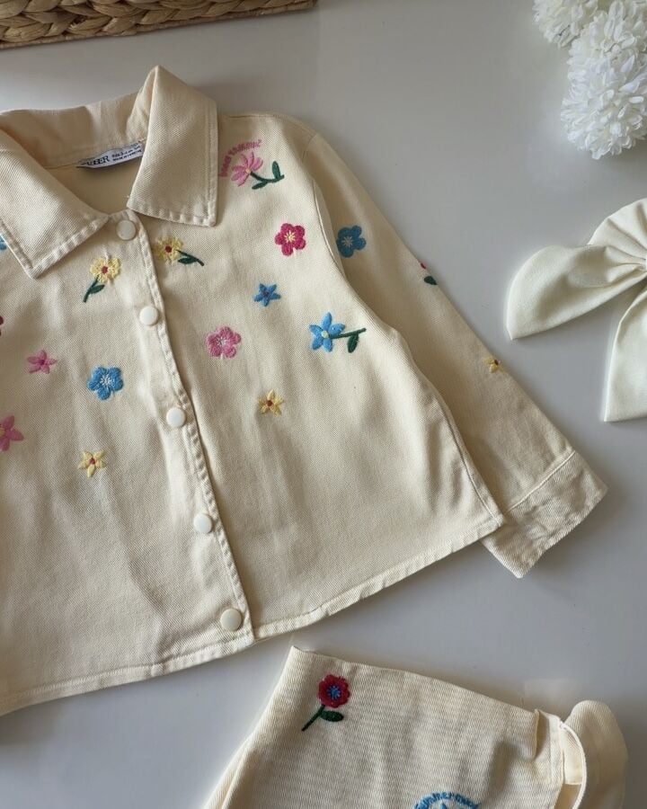 Asarkids Çiçek Nakışlı Şort Etekli Ceketli Takım - Krem