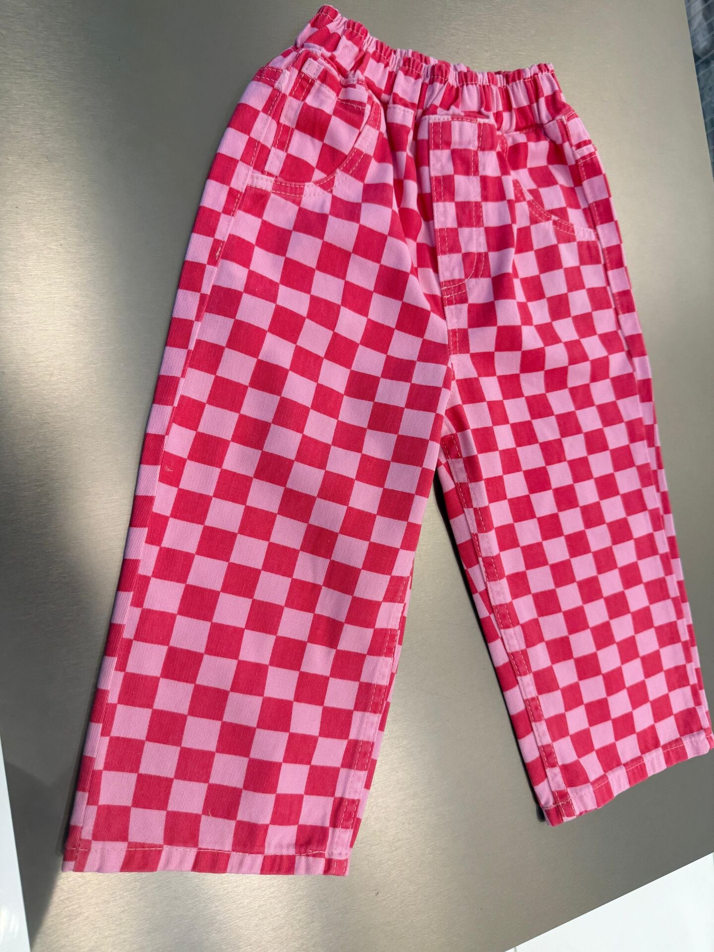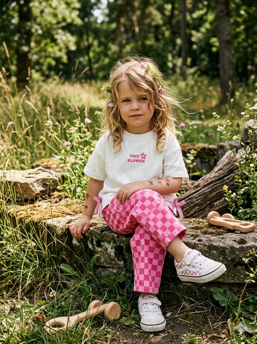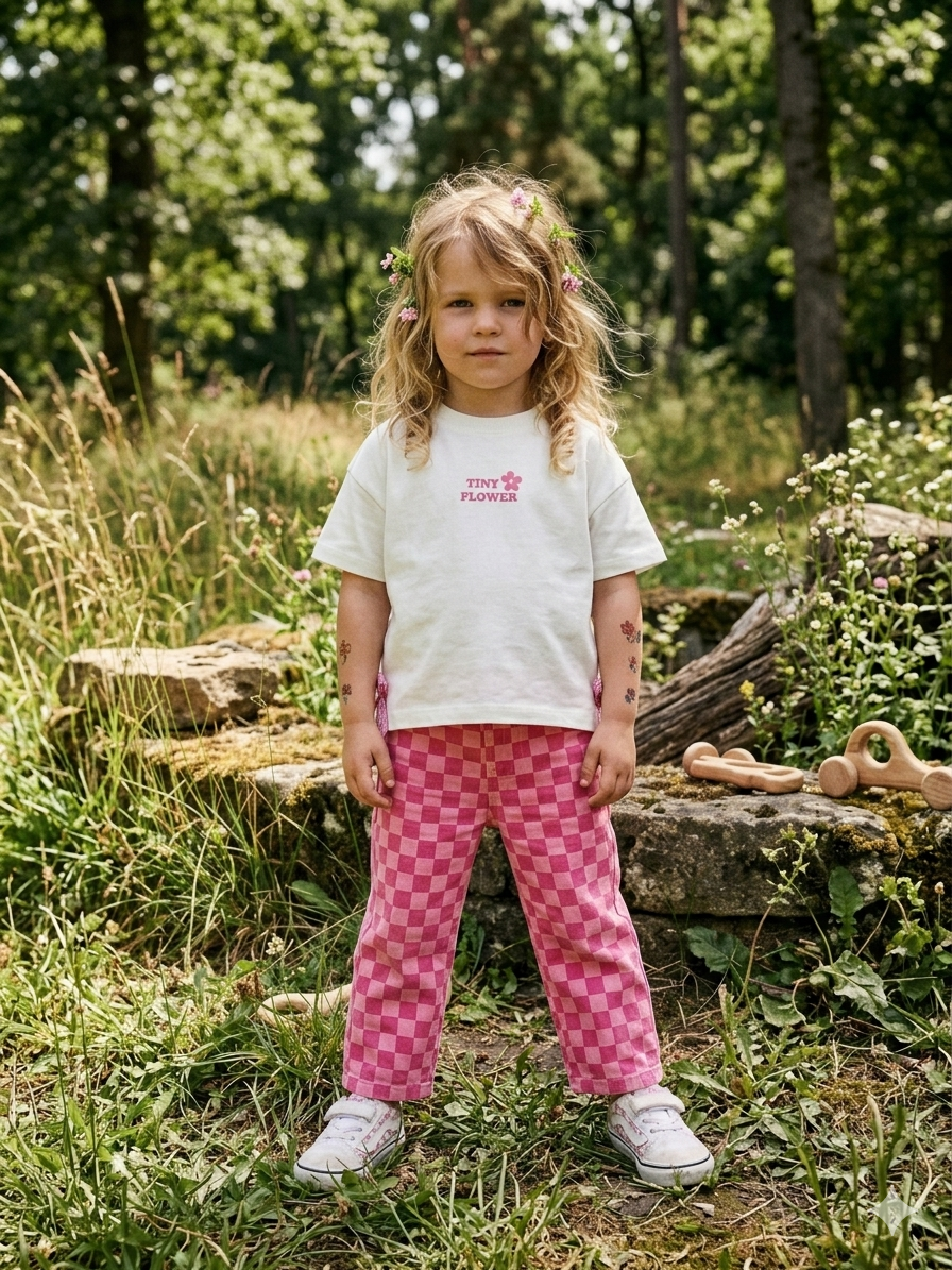 Asarkids Damalı Pantolon Fiyonk Detay Tişört 2'li Takım - Pembe Beyaz