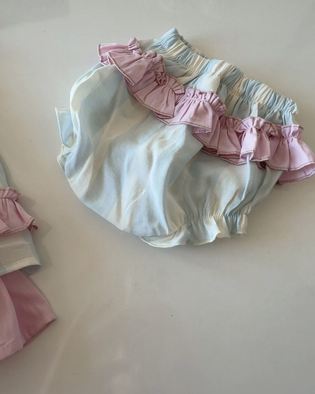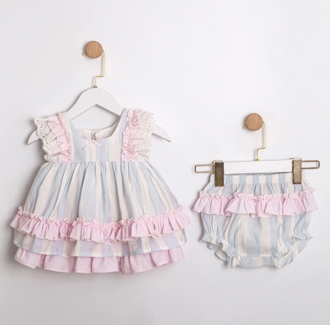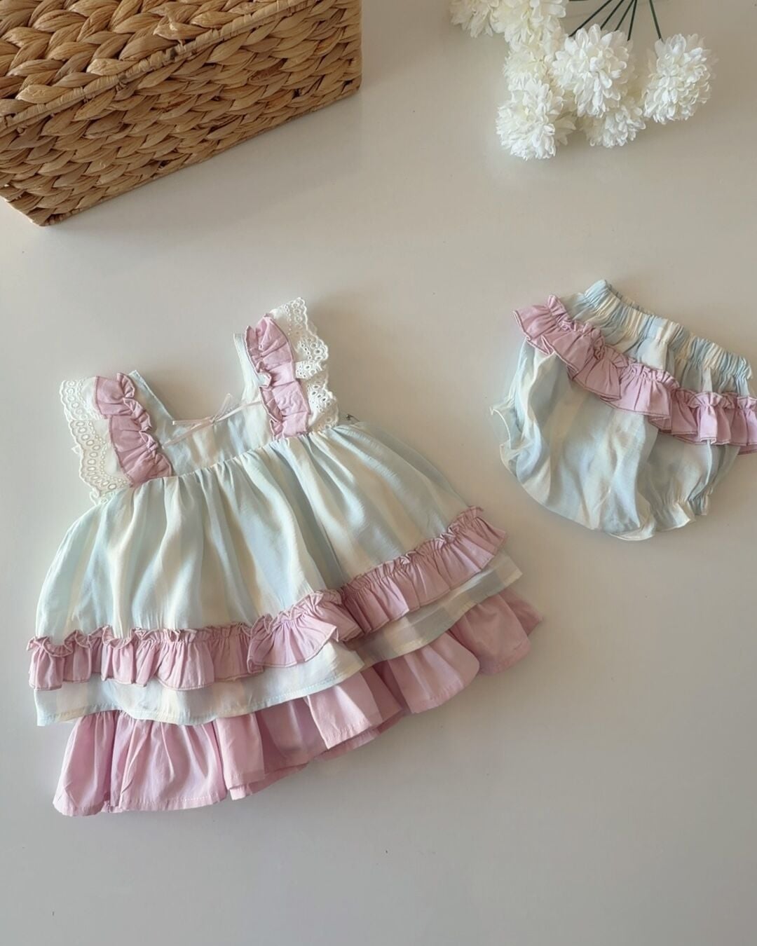 Asarkids Fırfırlı Fiyonk Detaylı Elbise ve Külot 2'li Takım - Pembe Mavi
