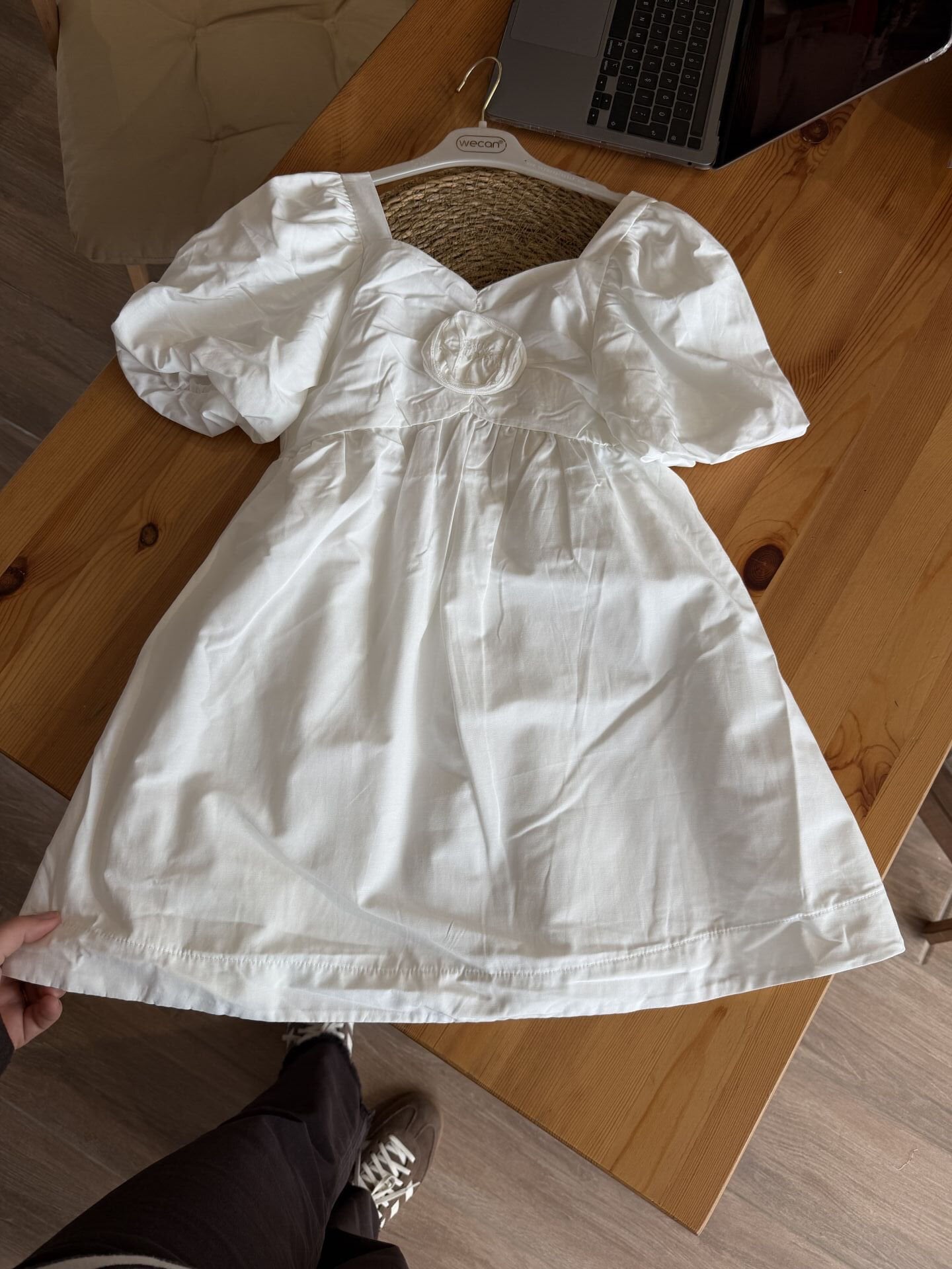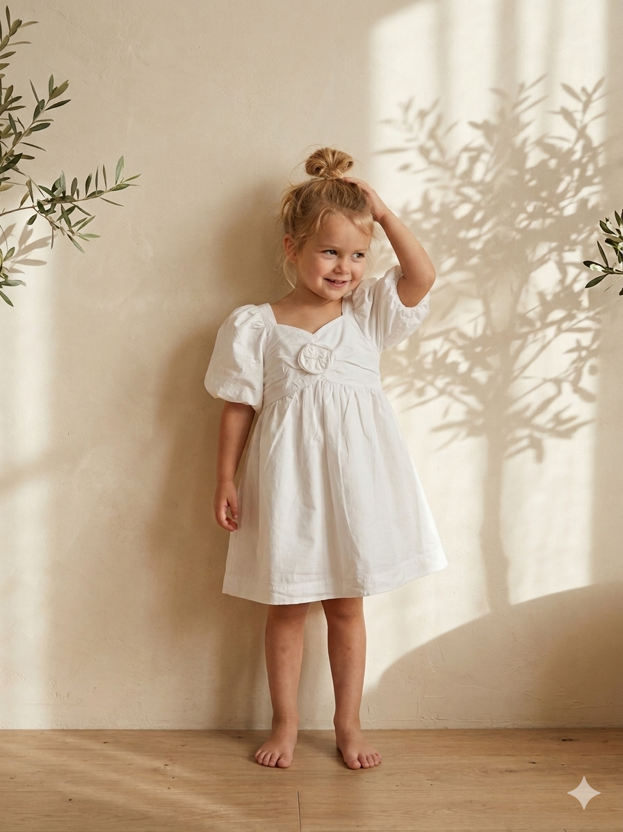 Küçük prenseslerin gardırobuna zamansız bir dokunuş! Saf beyazın masumiyetini modern bir tasarımla birleştiren bu elbise, hem özel günler hem de şık günlük kullanım için mükemmel bir seçim.