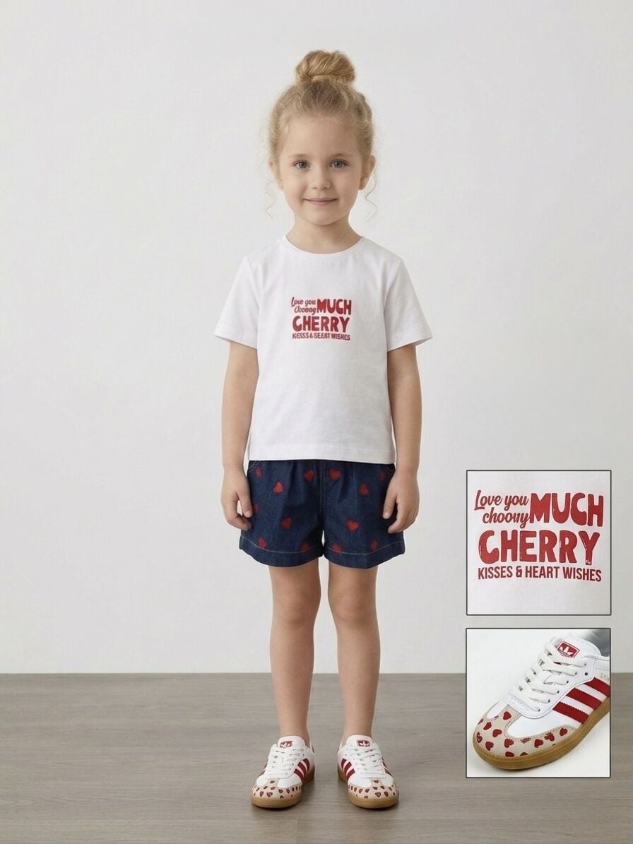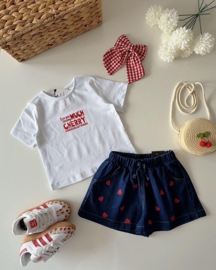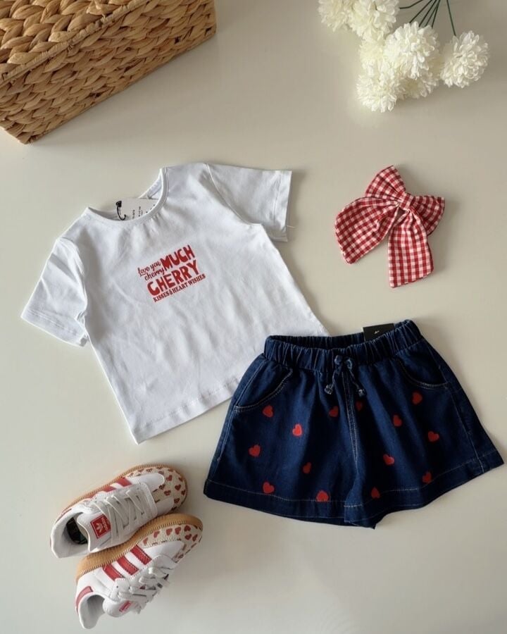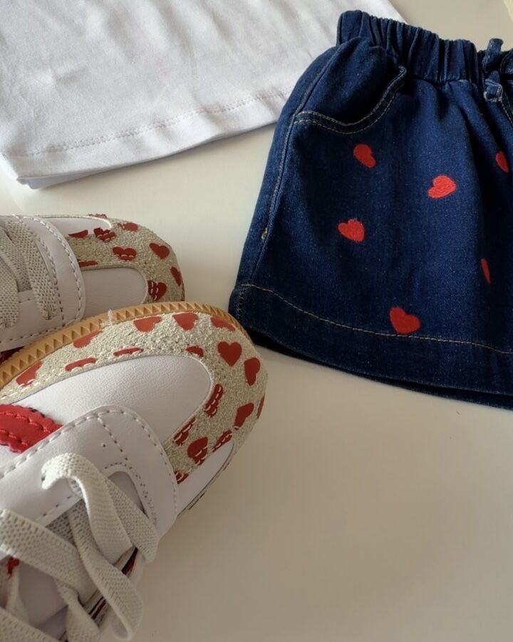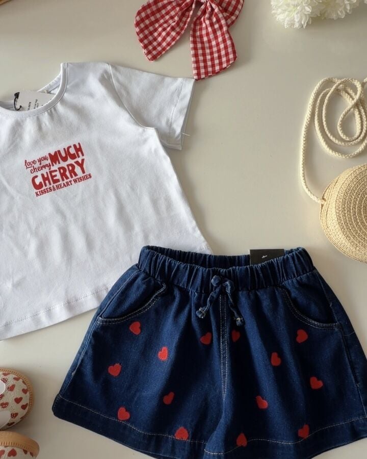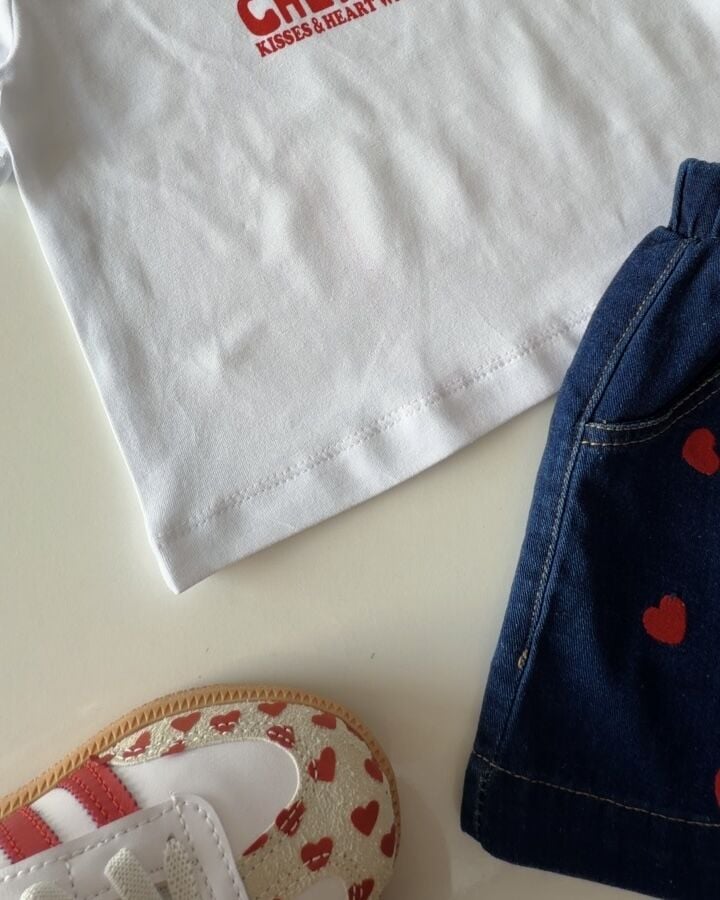 Asarkids Kalp Baskılı Şortlu 2'li Takım - Beyaz Koyu Mavi