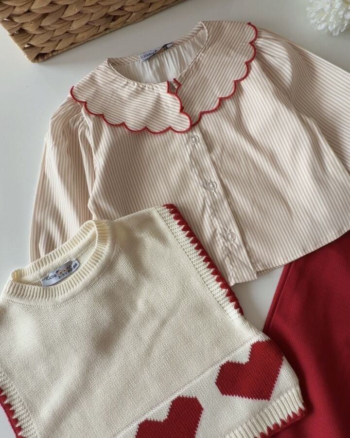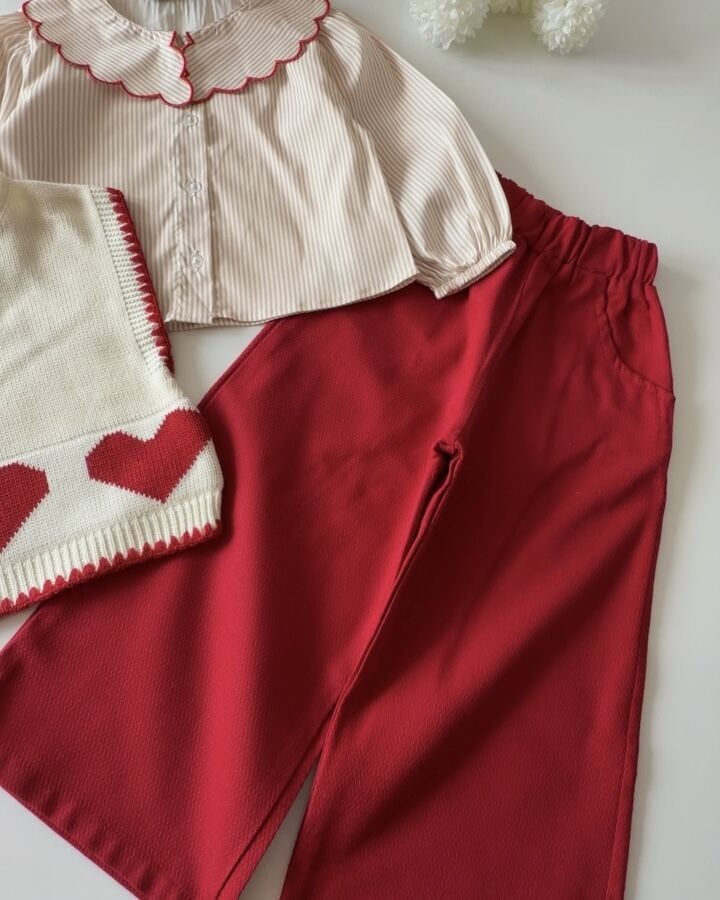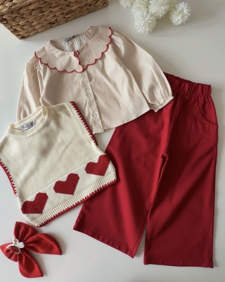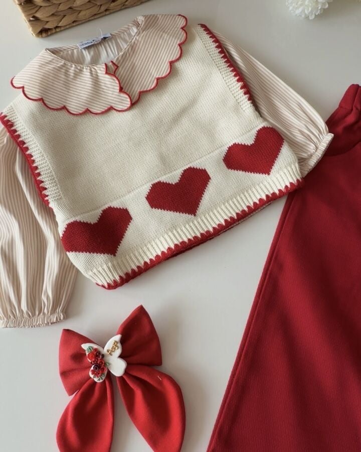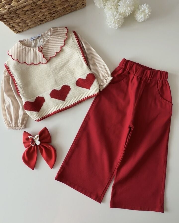 Asarkids Kalp Baskılı Triko Süveter Takım - Kırmızı
