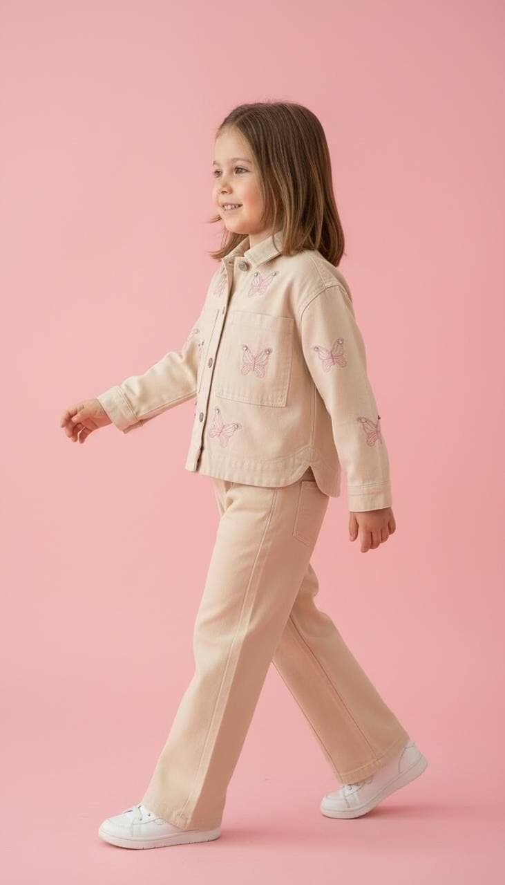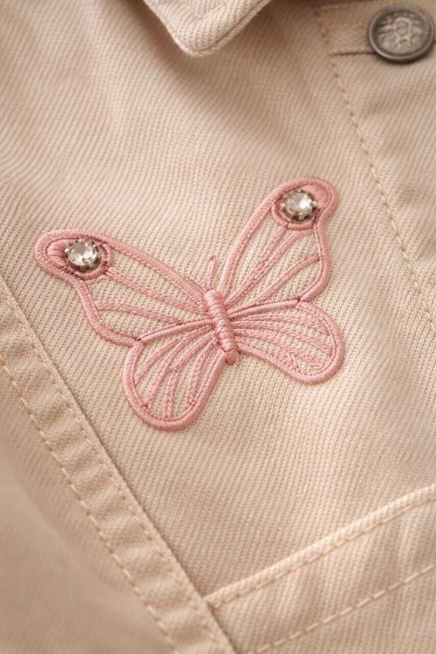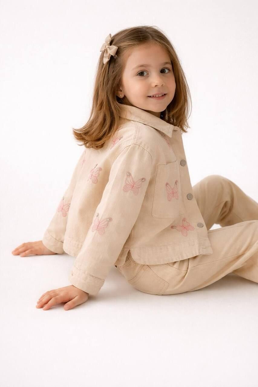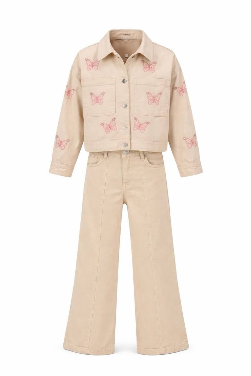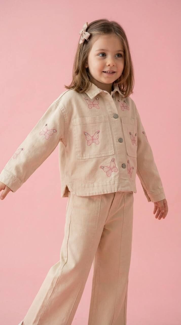Asarkids Kelebek Nakışlı Denim Ceketli Takım - Pembe Krem