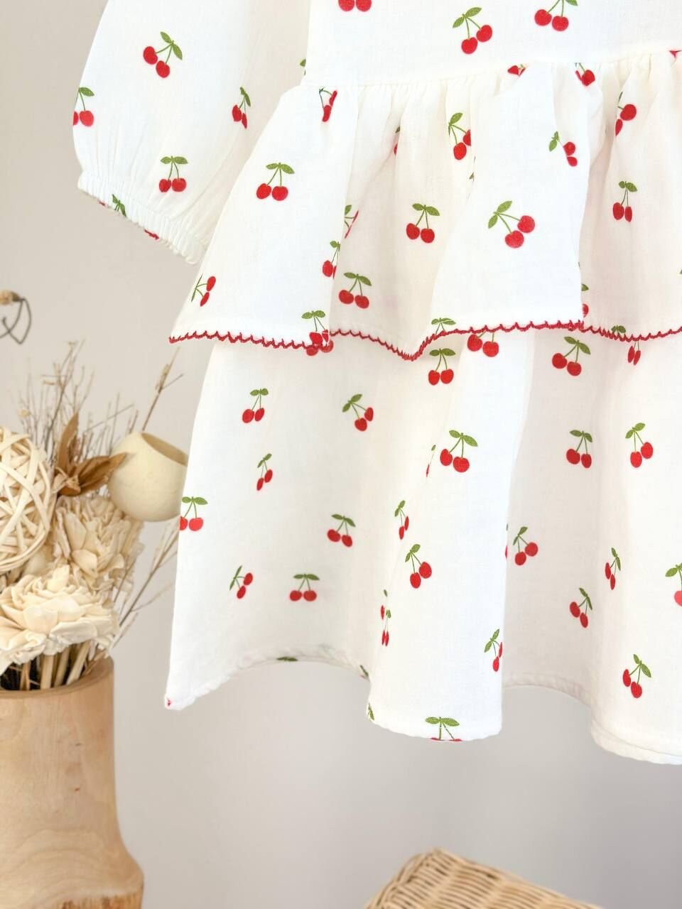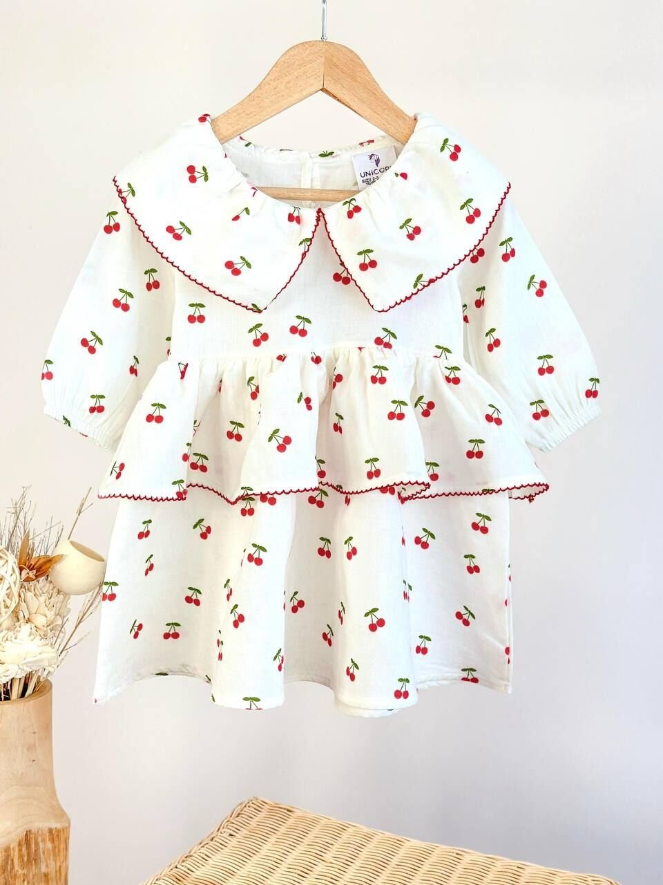 Asarkids Kiraz Baskılı Fırfırlı Elbise - Beyaz
