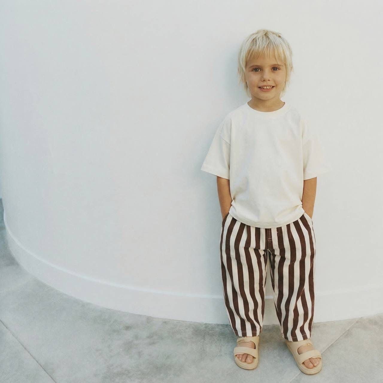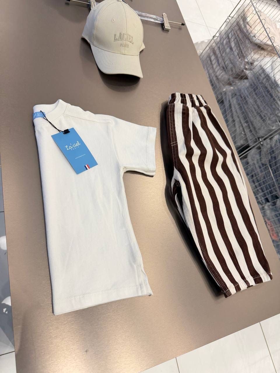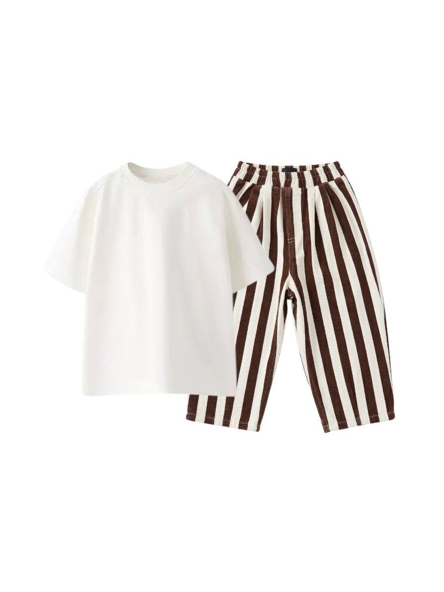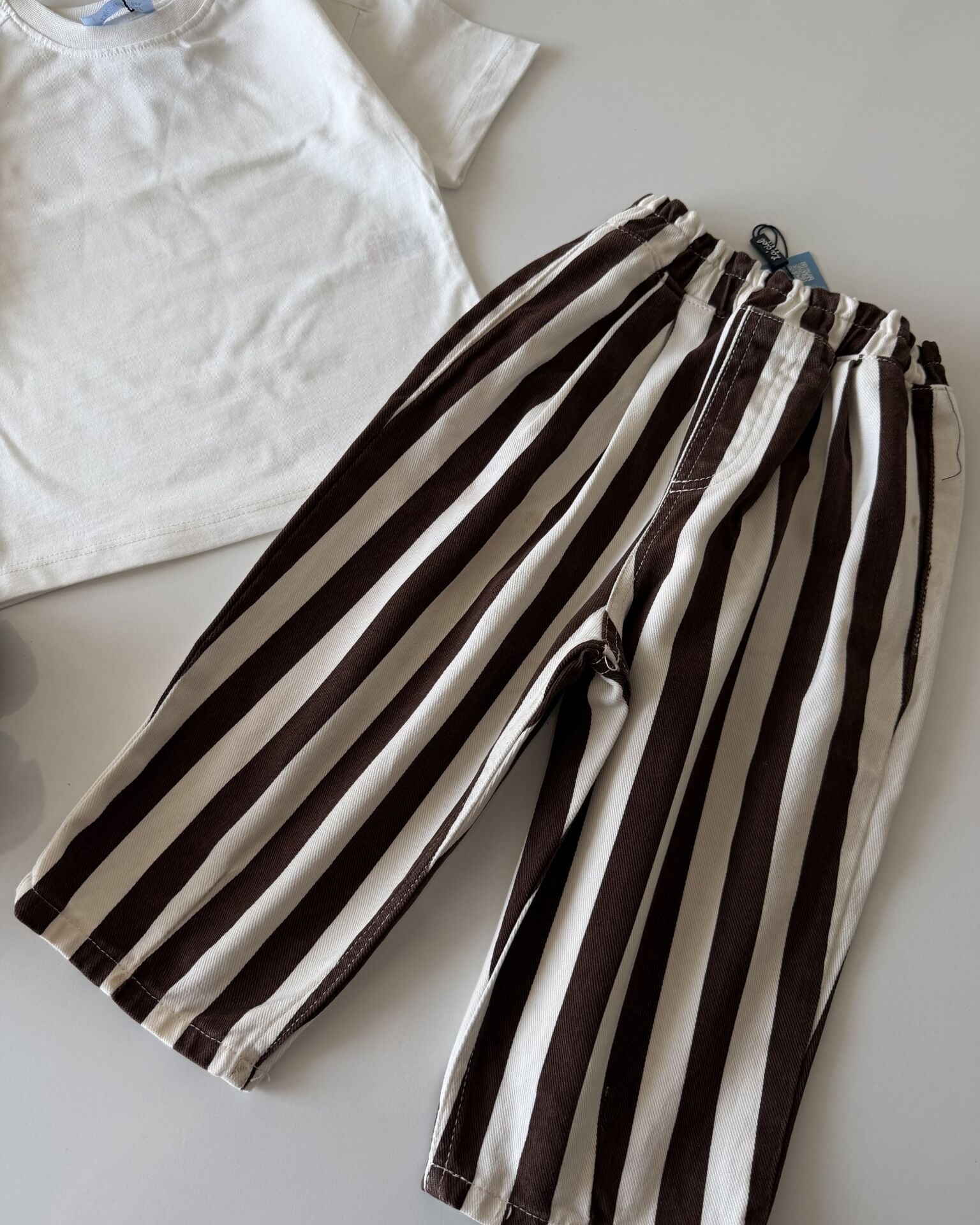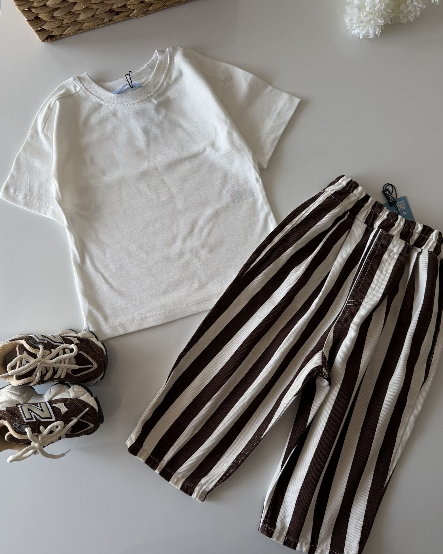 Asarkids La'ciel Paris Çizgili Balon Pantolon Tişört 2'li Set - Kahve Beyaz