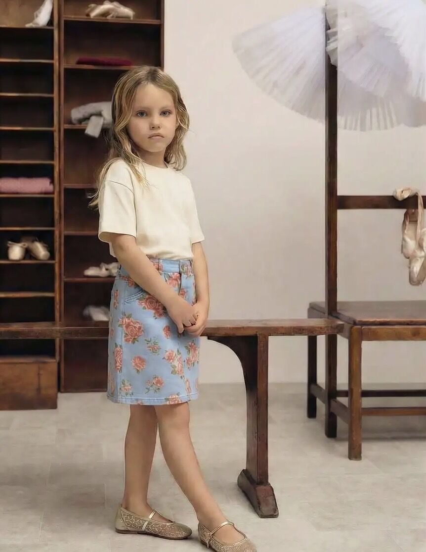 Asarkids La'ciel Paris Esnek Çiçekli Diz Altı Etek Tişört Seti - Krem Mavi Çiçekli