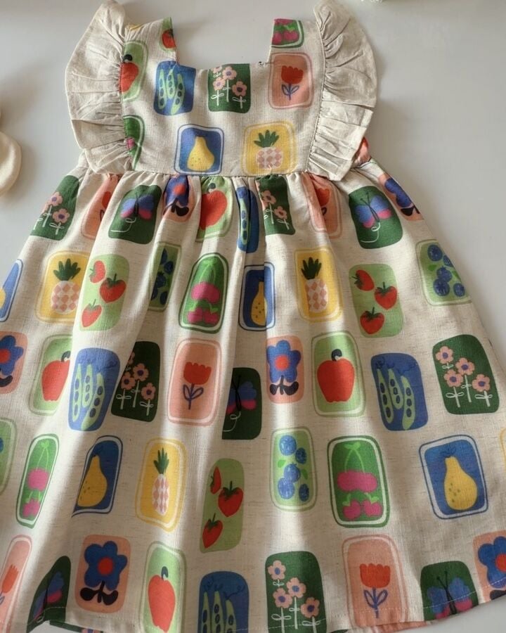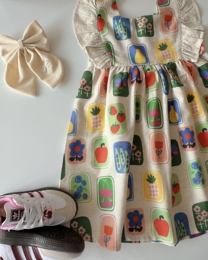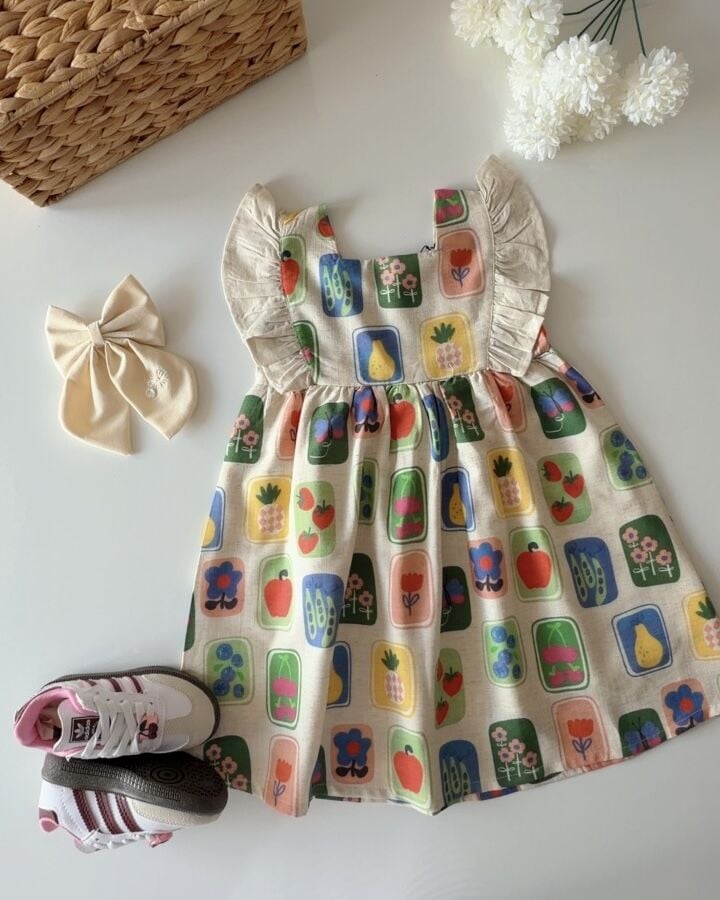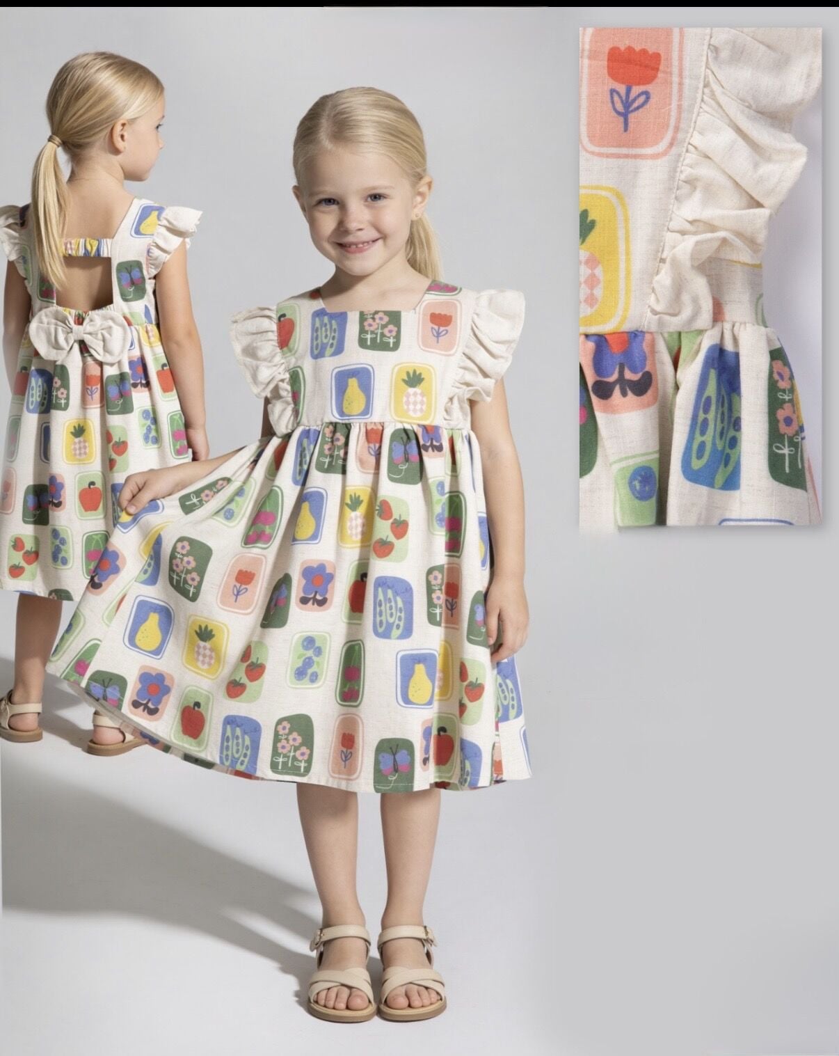 Asarkids Meyve Baskılı Arkası Fiyonk Pencereli Elbise - Krem