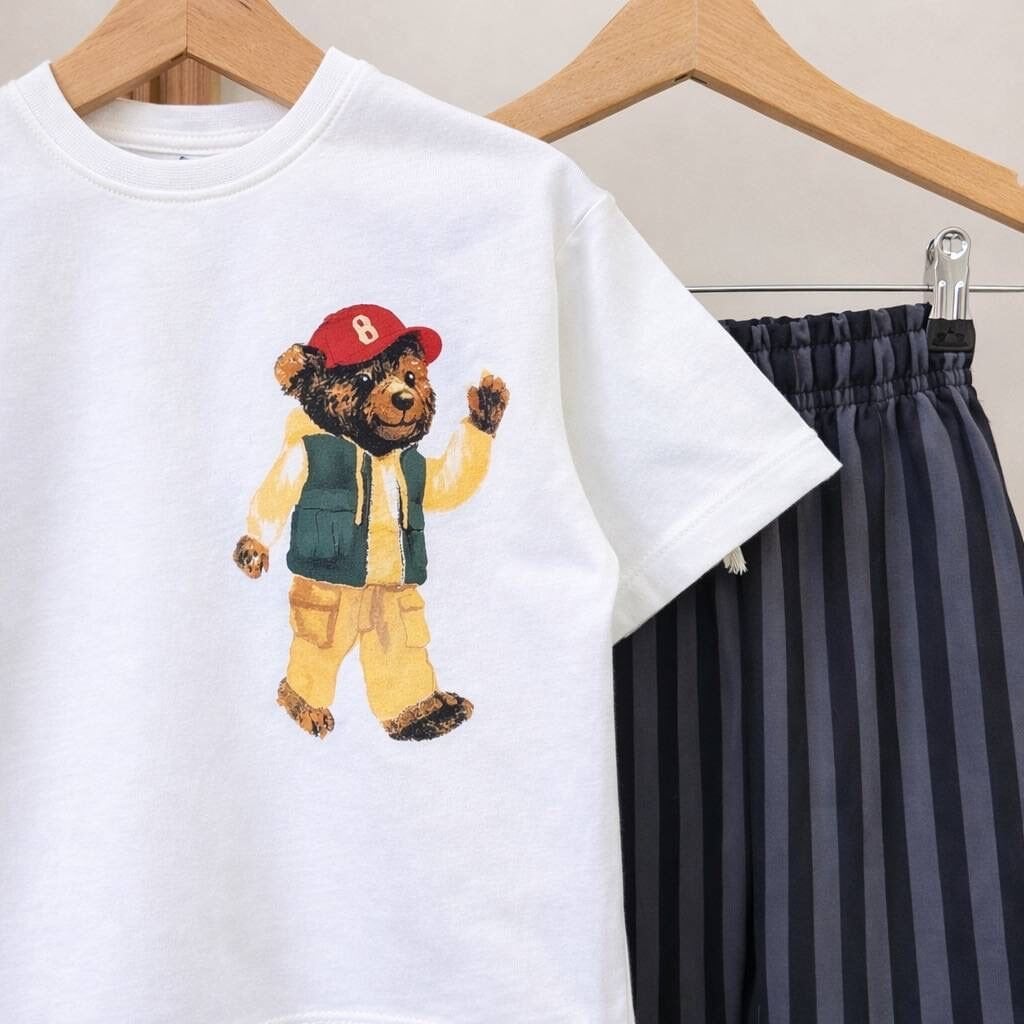 Asarkids New York Ayıcık Baskılı Çizgili 2'li Takım - Beyaz Füme
