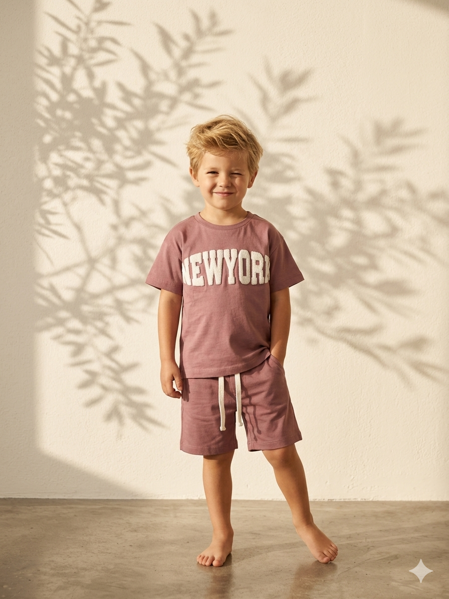 Asarkids New York Punch Nakışlı 2'li Şortlu Takım - Mürdüm