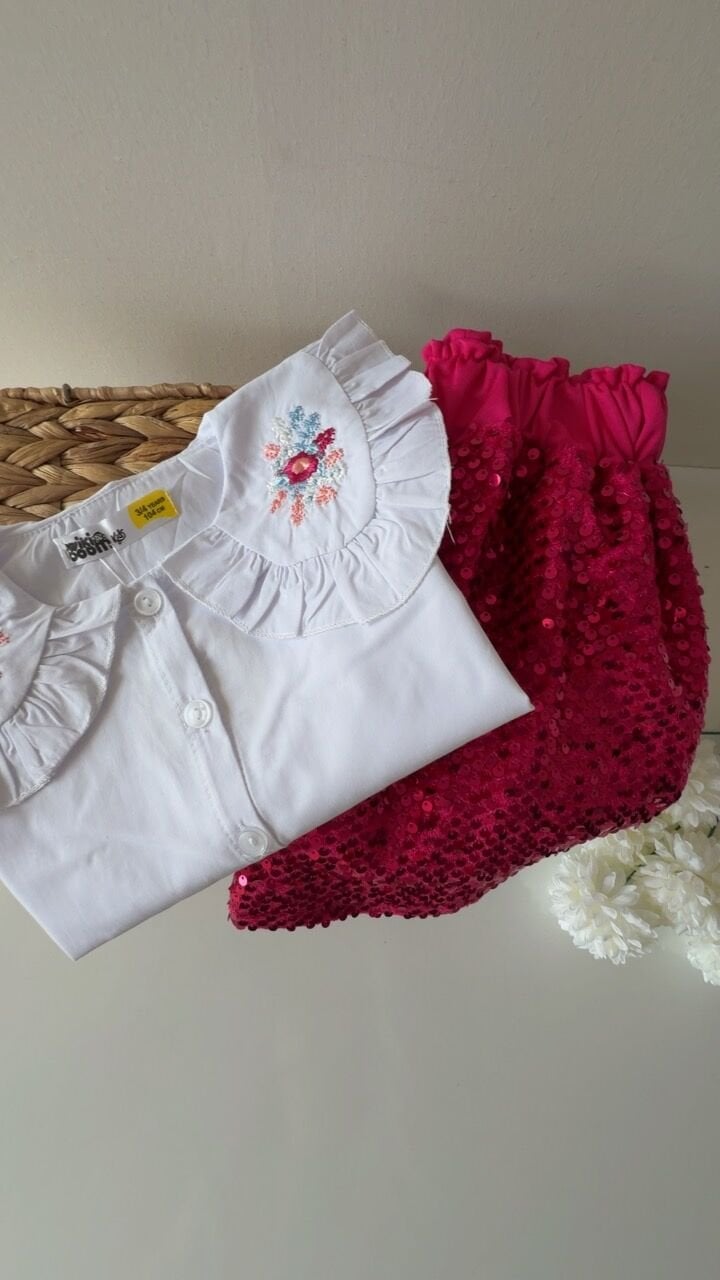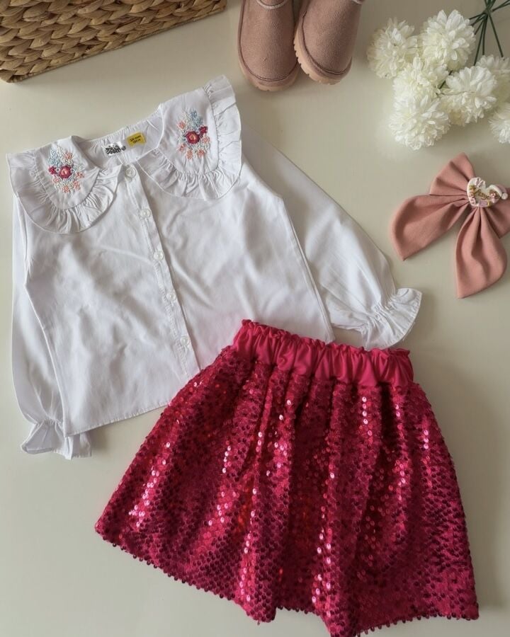 Asarkids Yaka Nakışlı Pul Payet 2'li Takım - Pembe