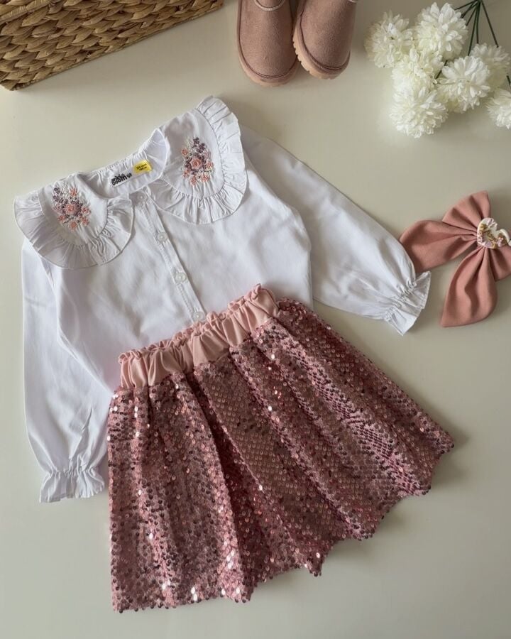 Asarkids Yaka Nakışlı Pul Payet 2'li Takım - Pudra