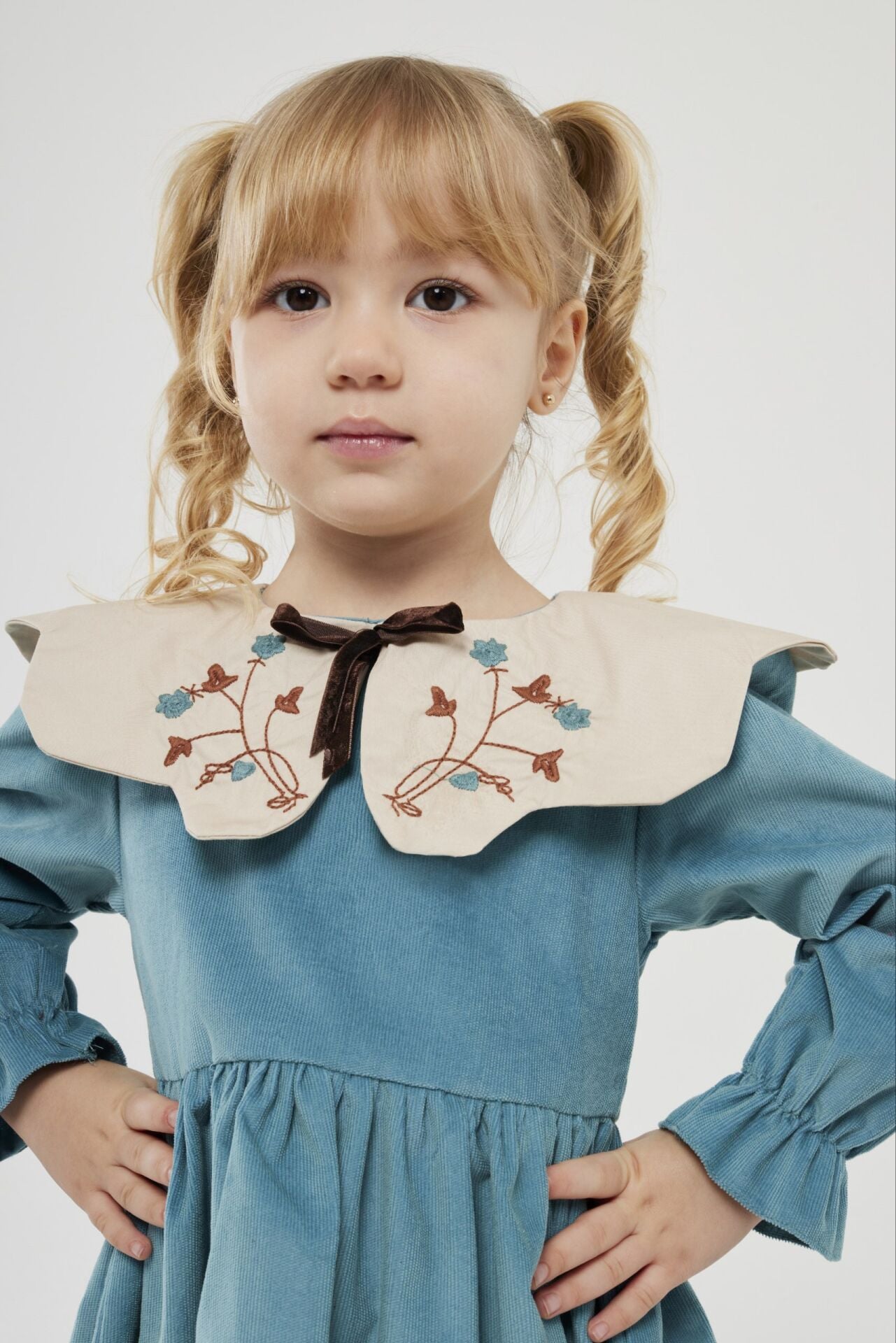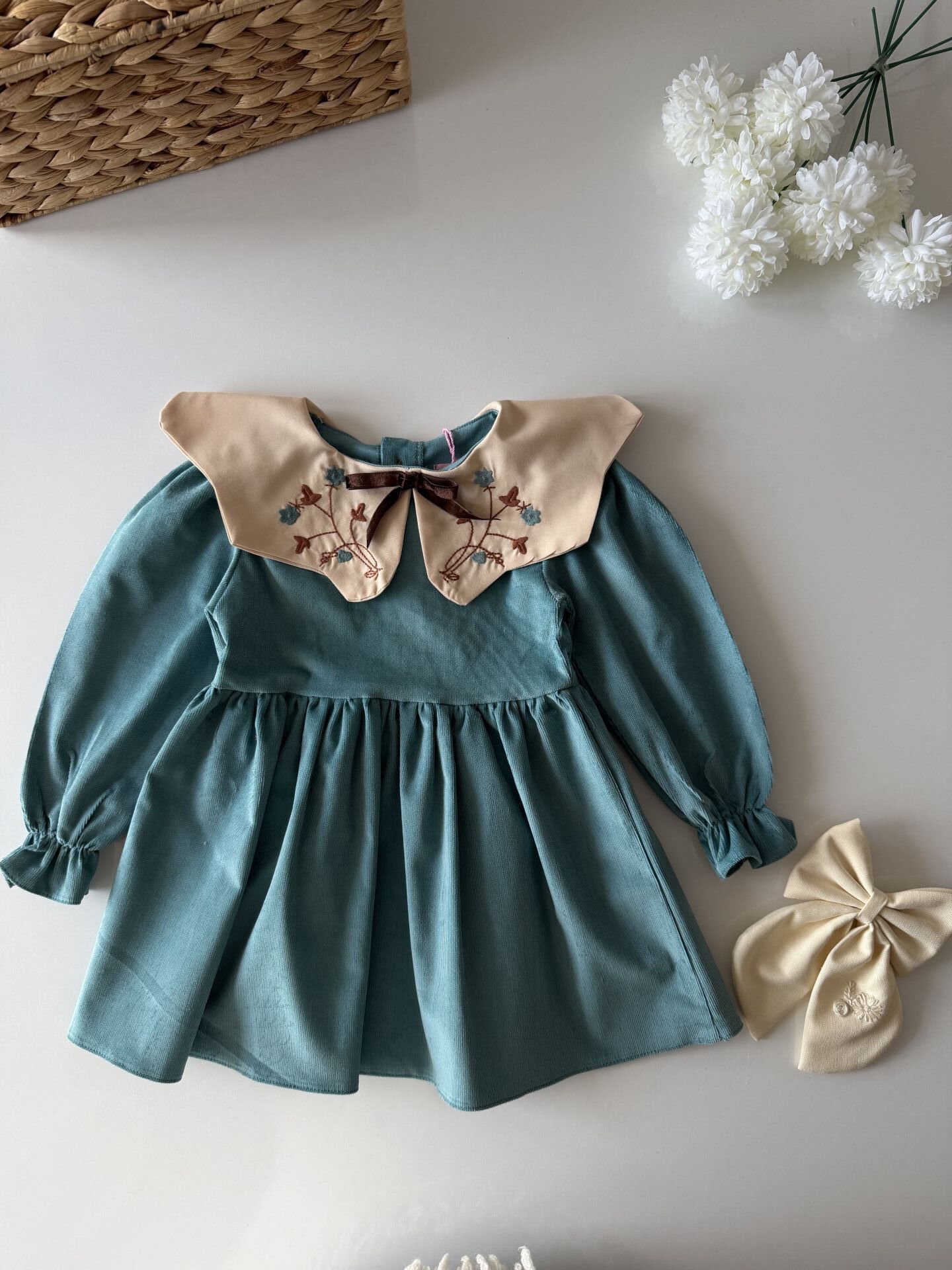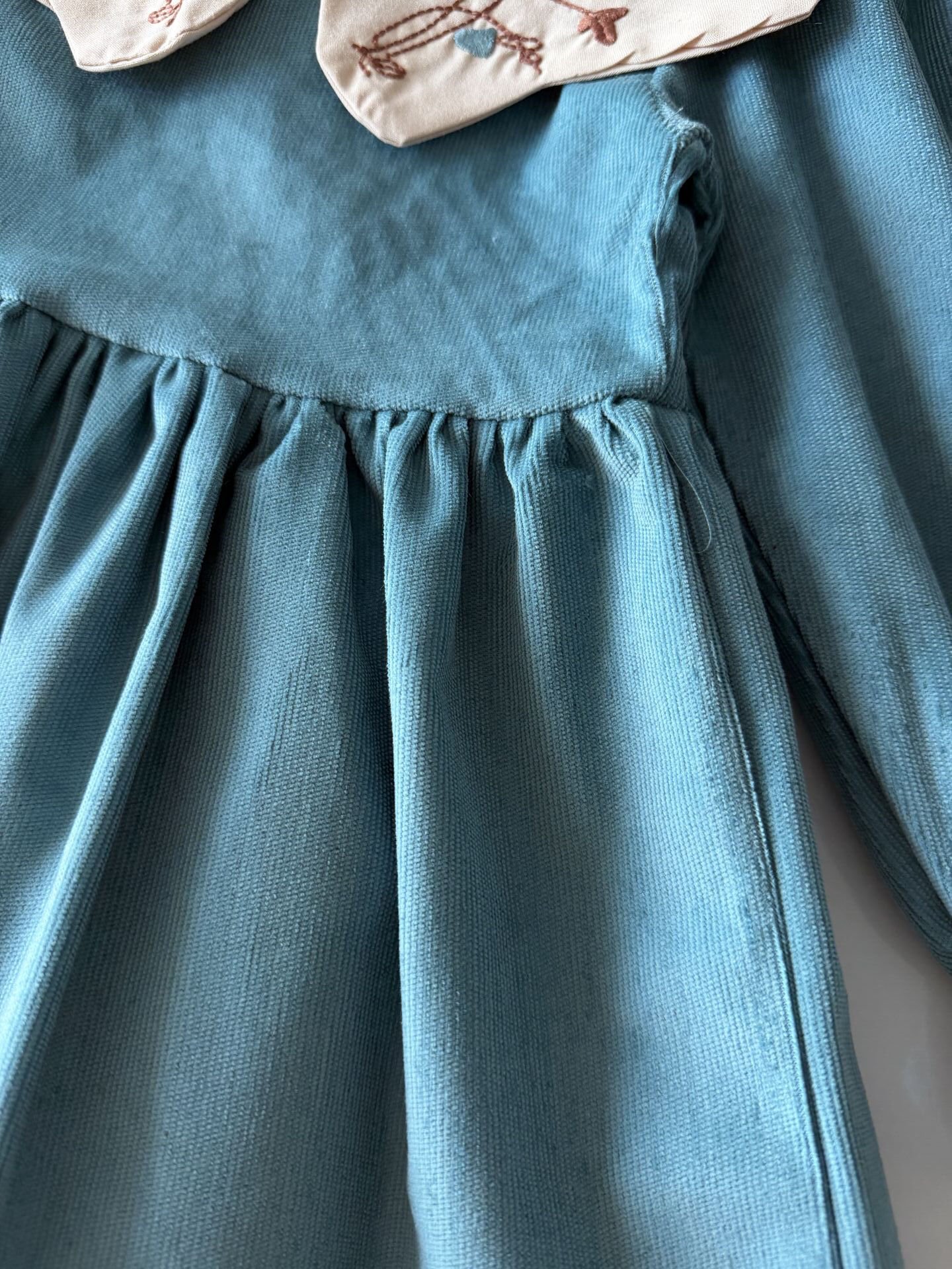Asarkids Yakası Nakışlı Kadife Elbise - Mavi