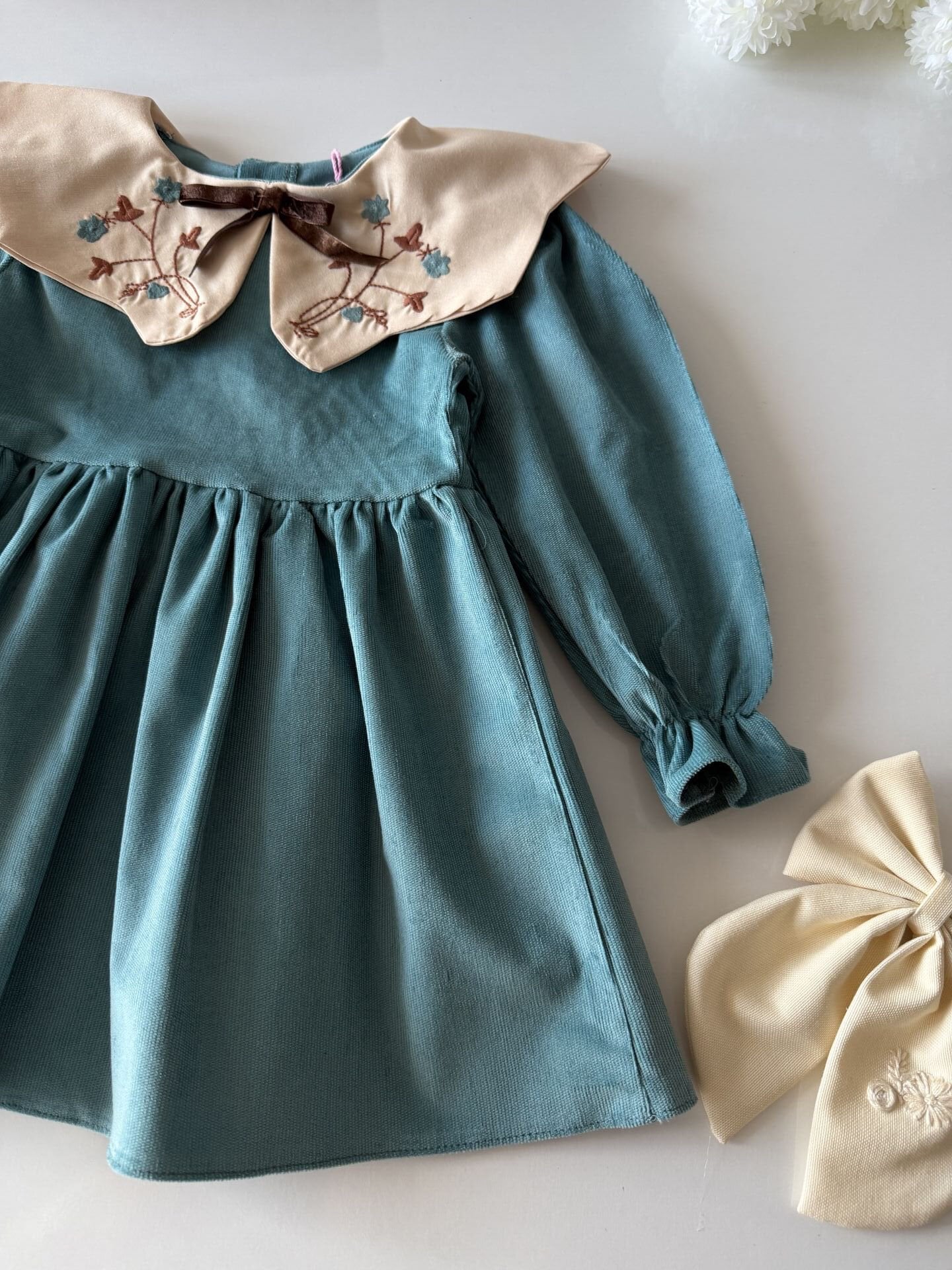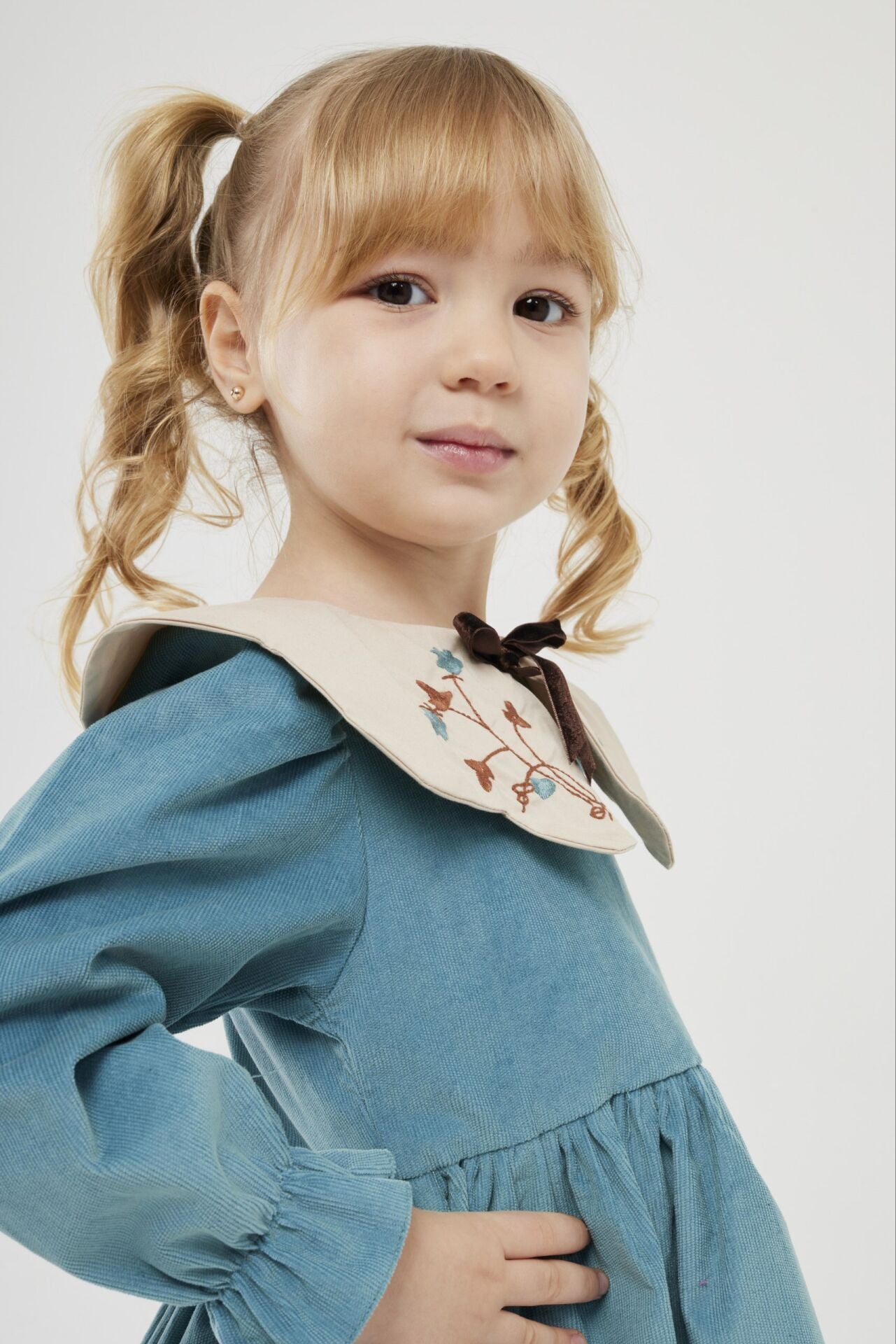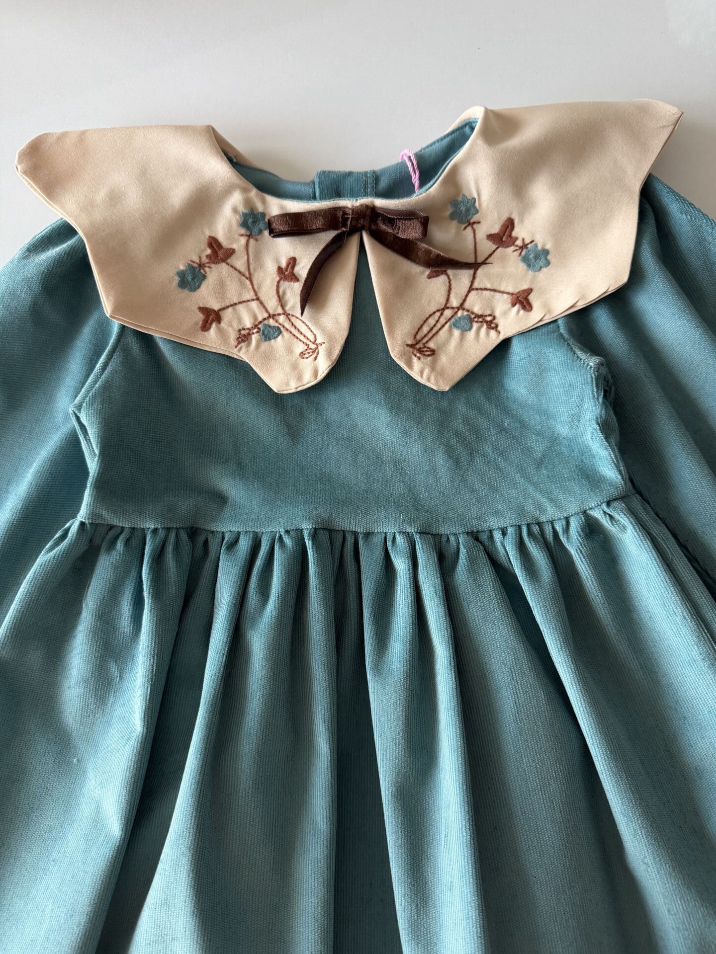 Asarkids Yakası Nakışlı Kadife Elbise - Mavi