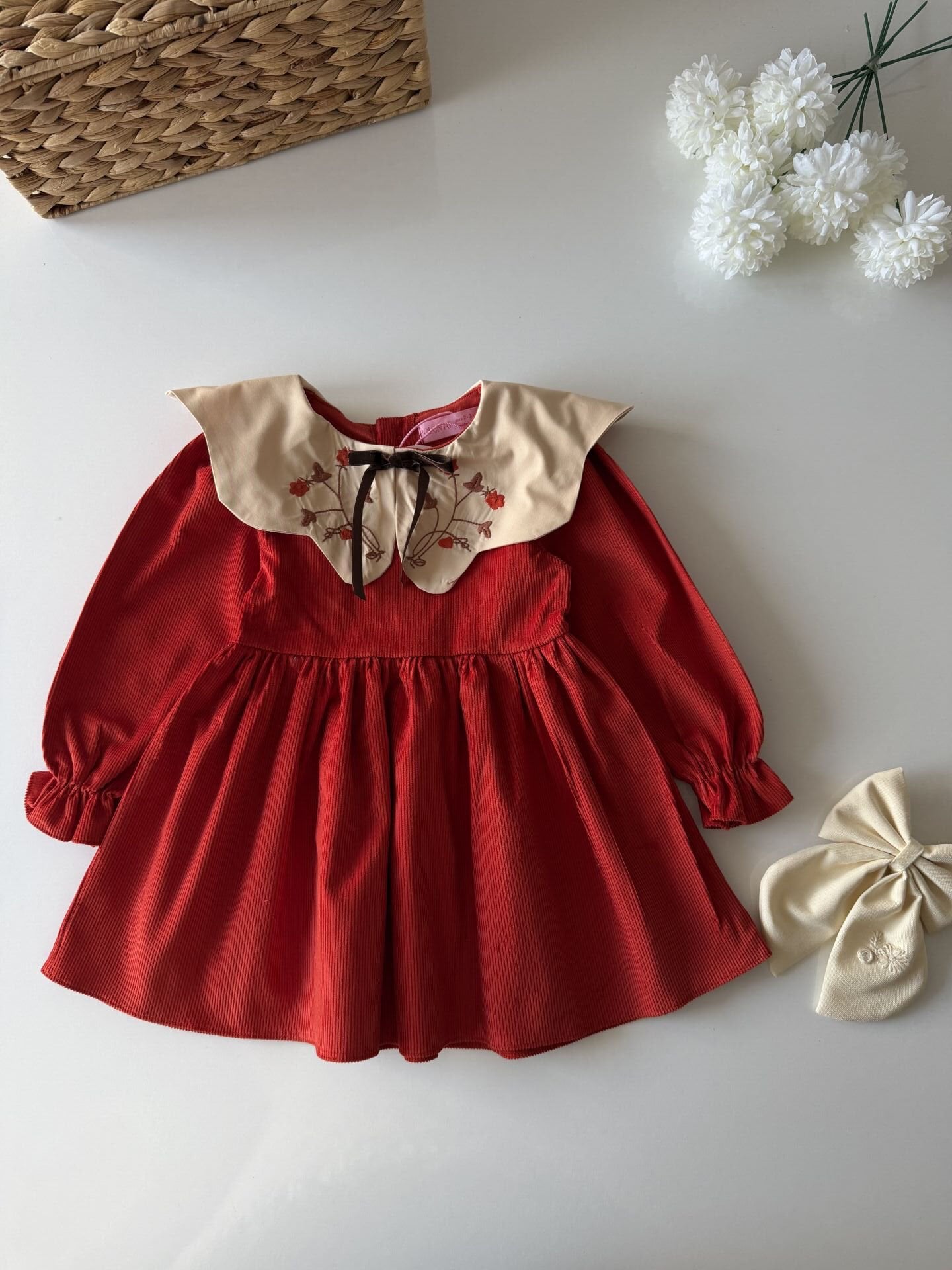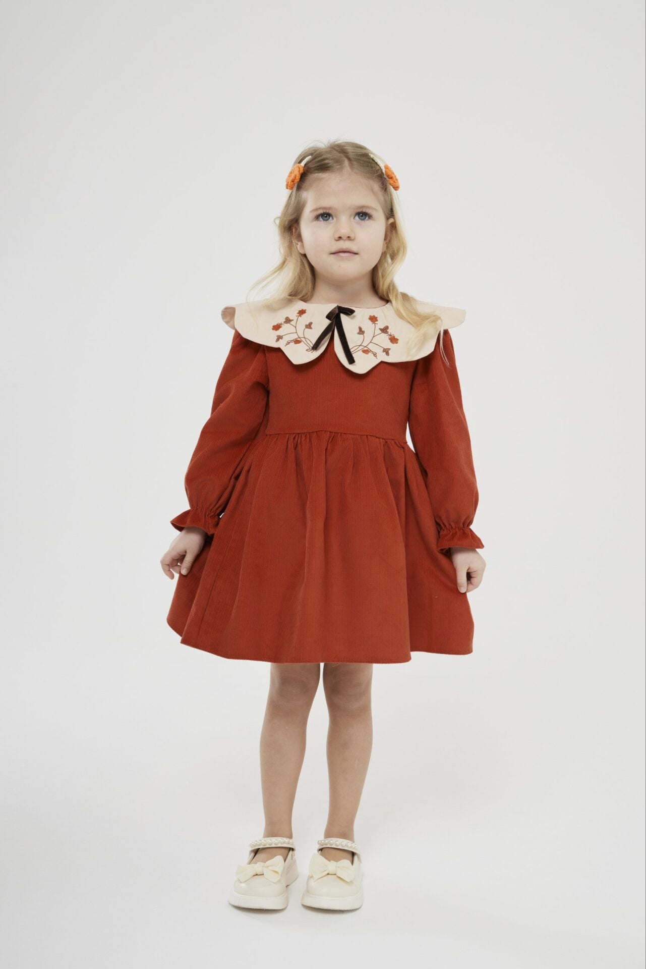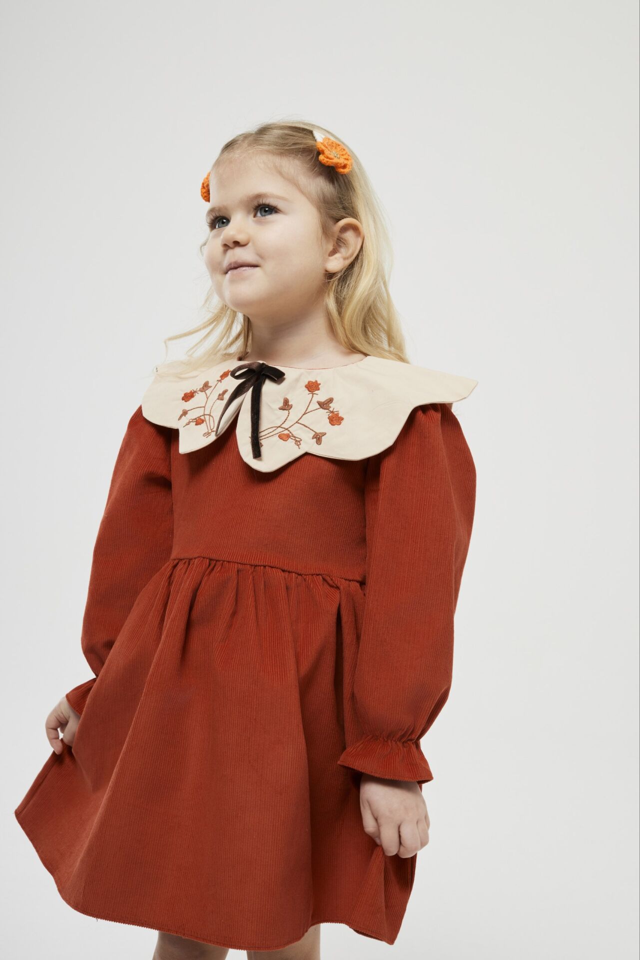 Asarkids Yakası Nakışlı Kadife Elbise - Turuncu