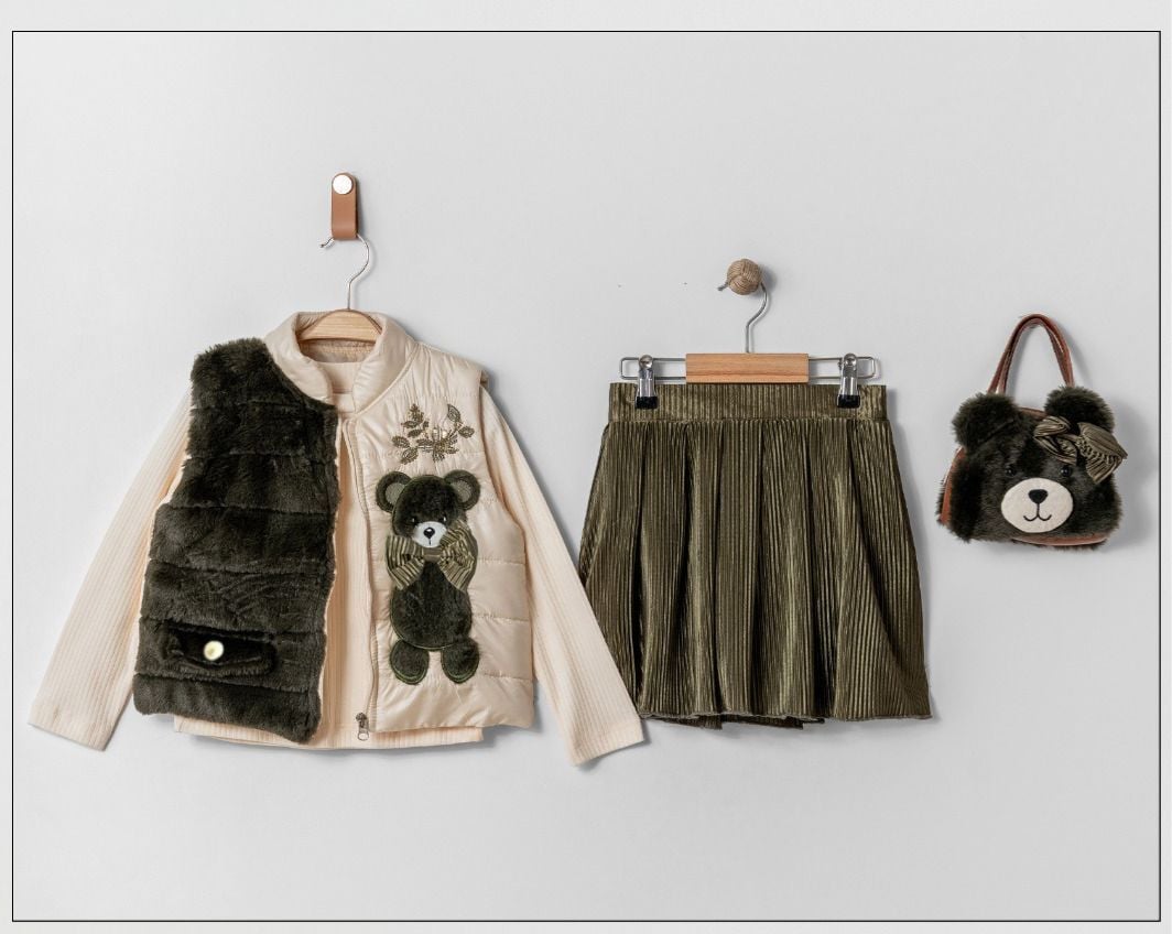 ‣ Kırınkıl kumaş etek, Astarlı Peluş Yelek, ribana kumaş iç badisi ve çantaaıyla