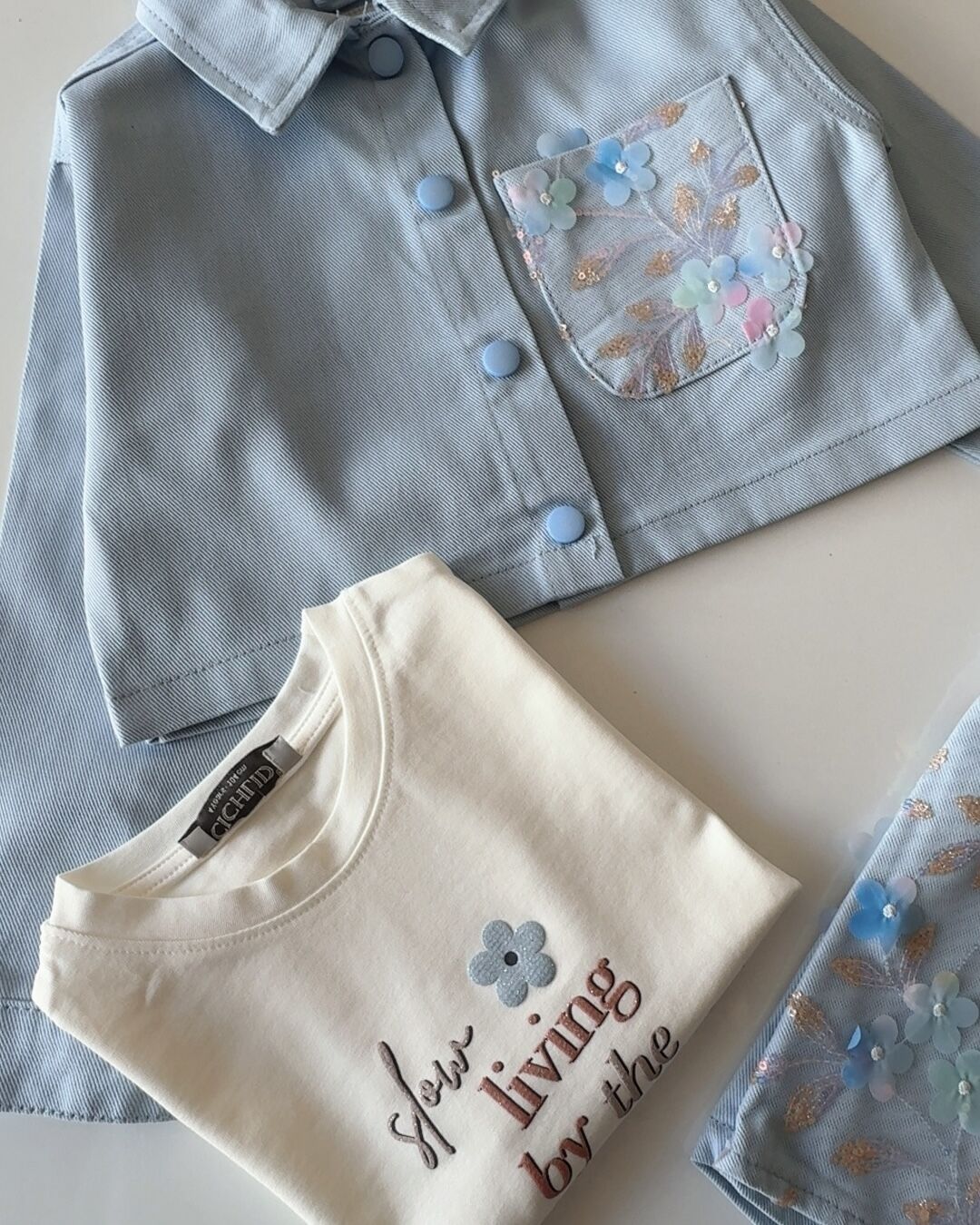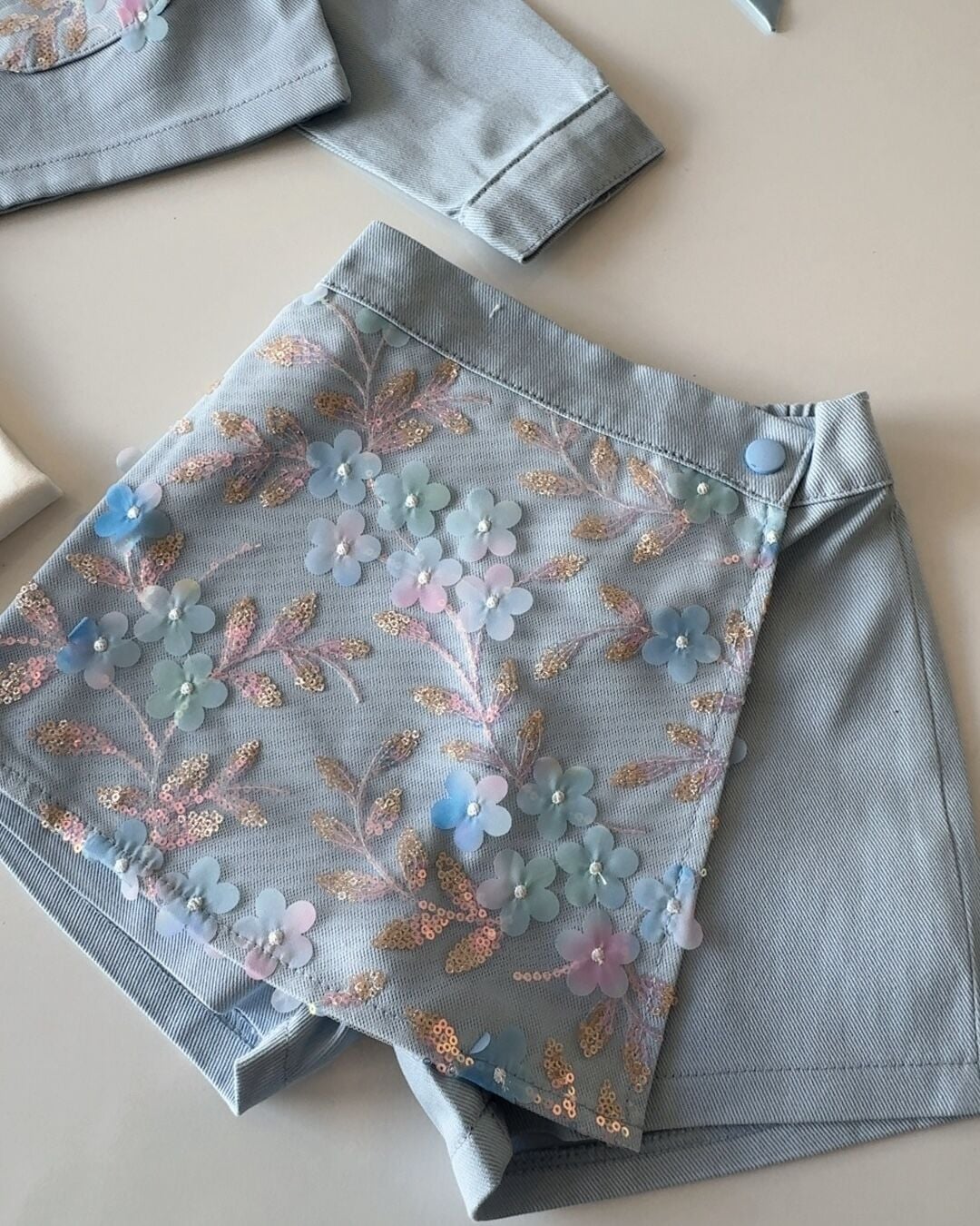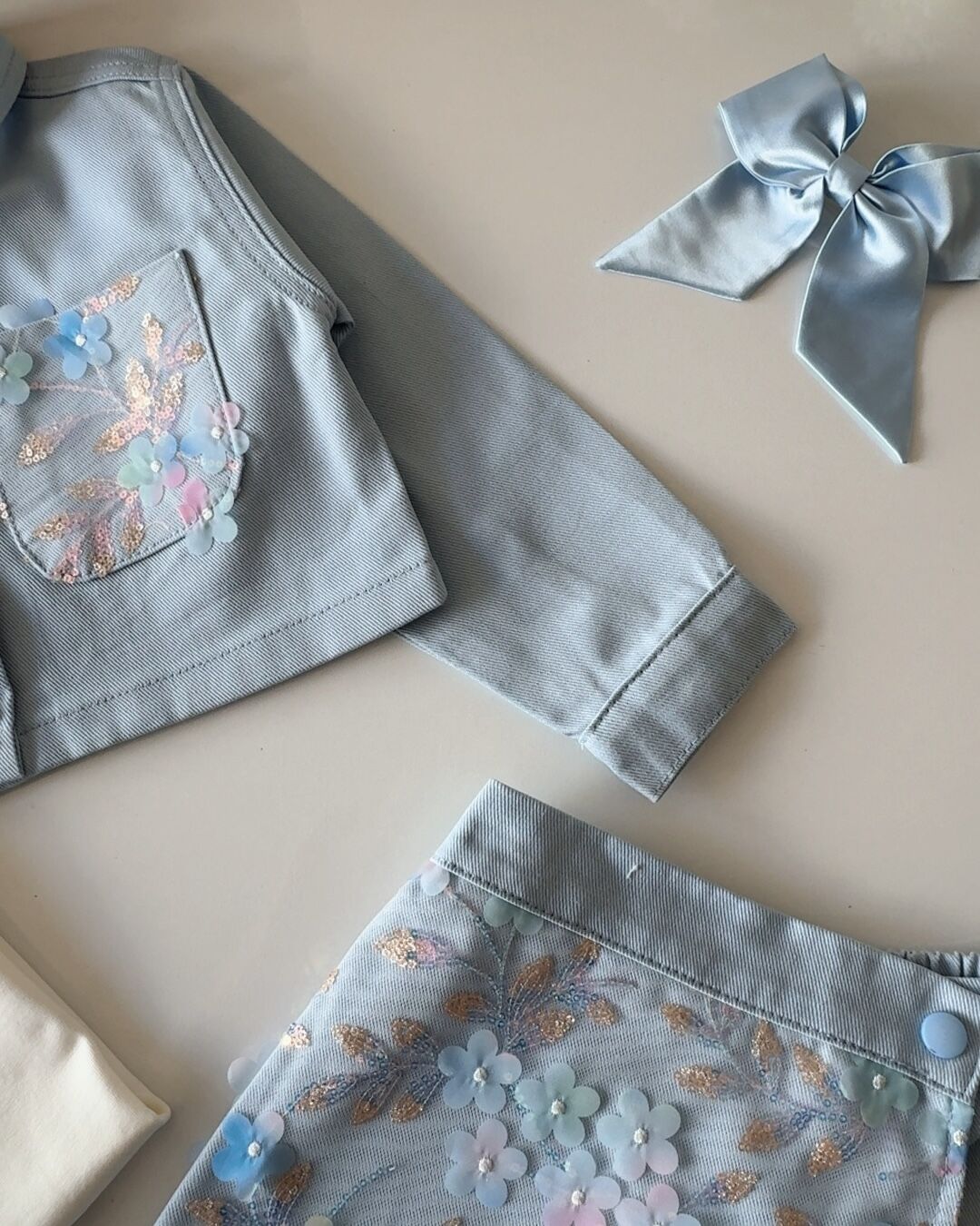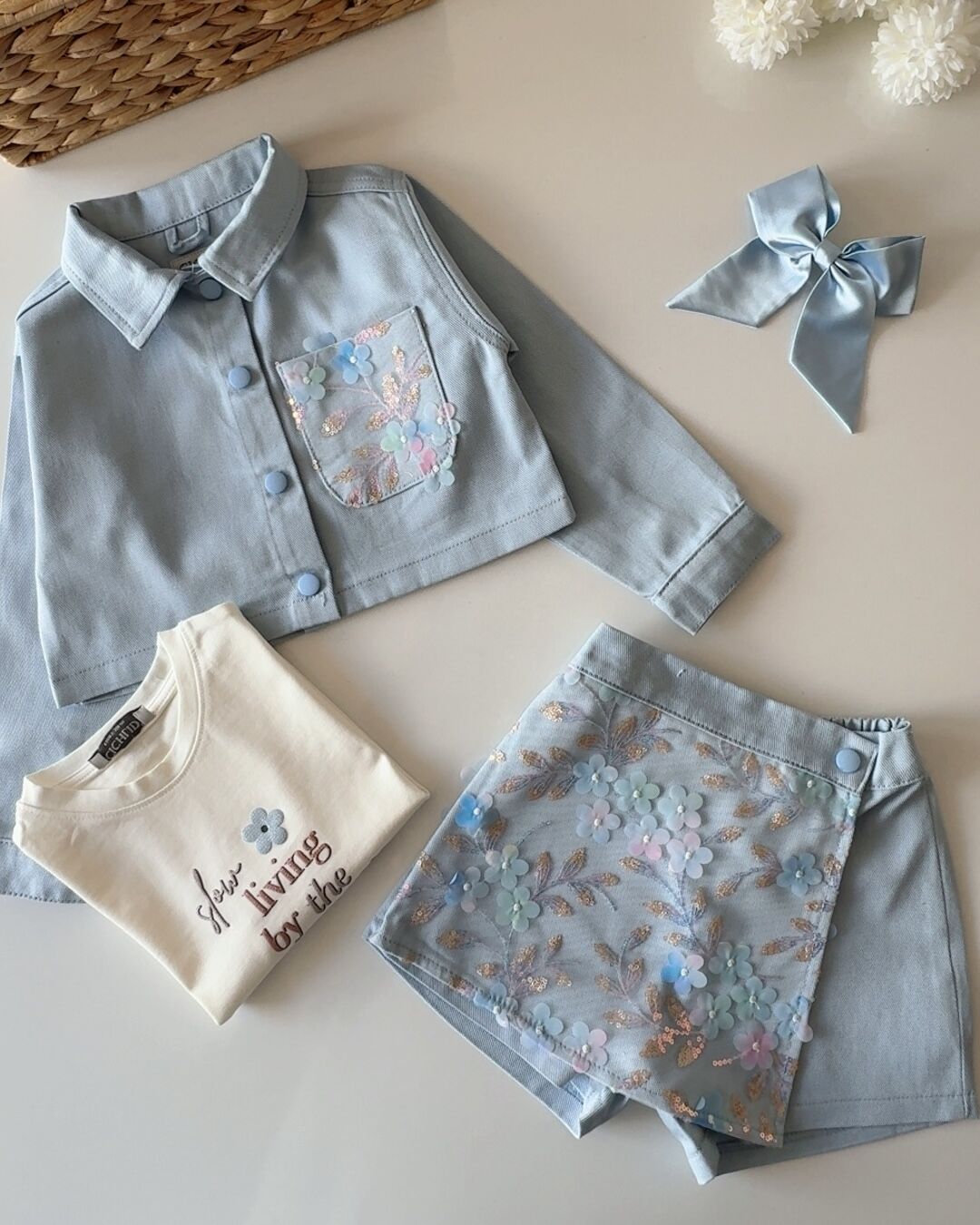 Asarkids Çiçek İşleme Aplikeli 3'lü Ceketli Şort Etekli Takım - Mavi