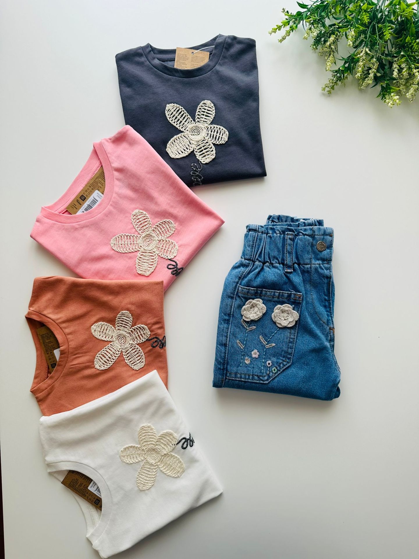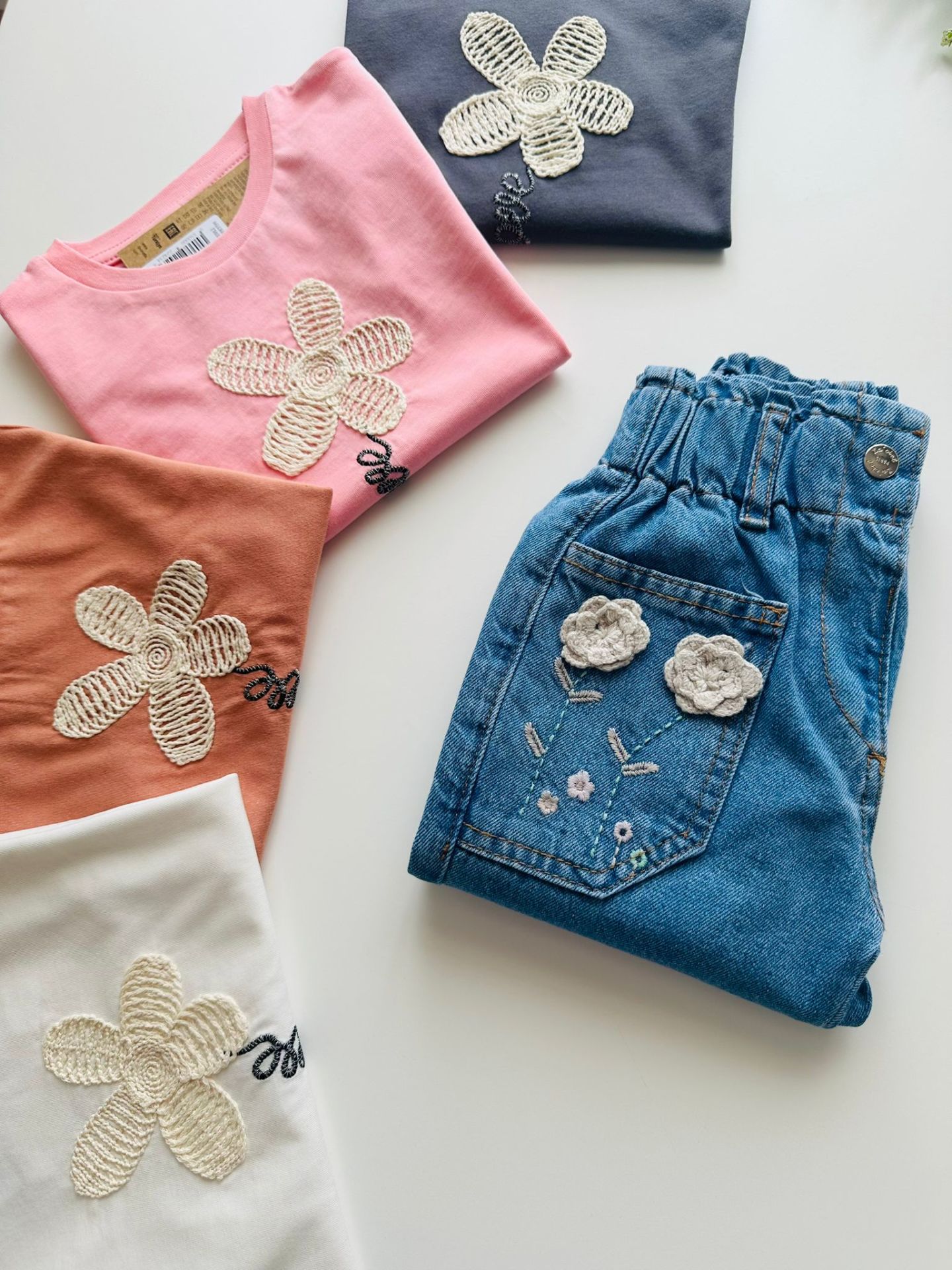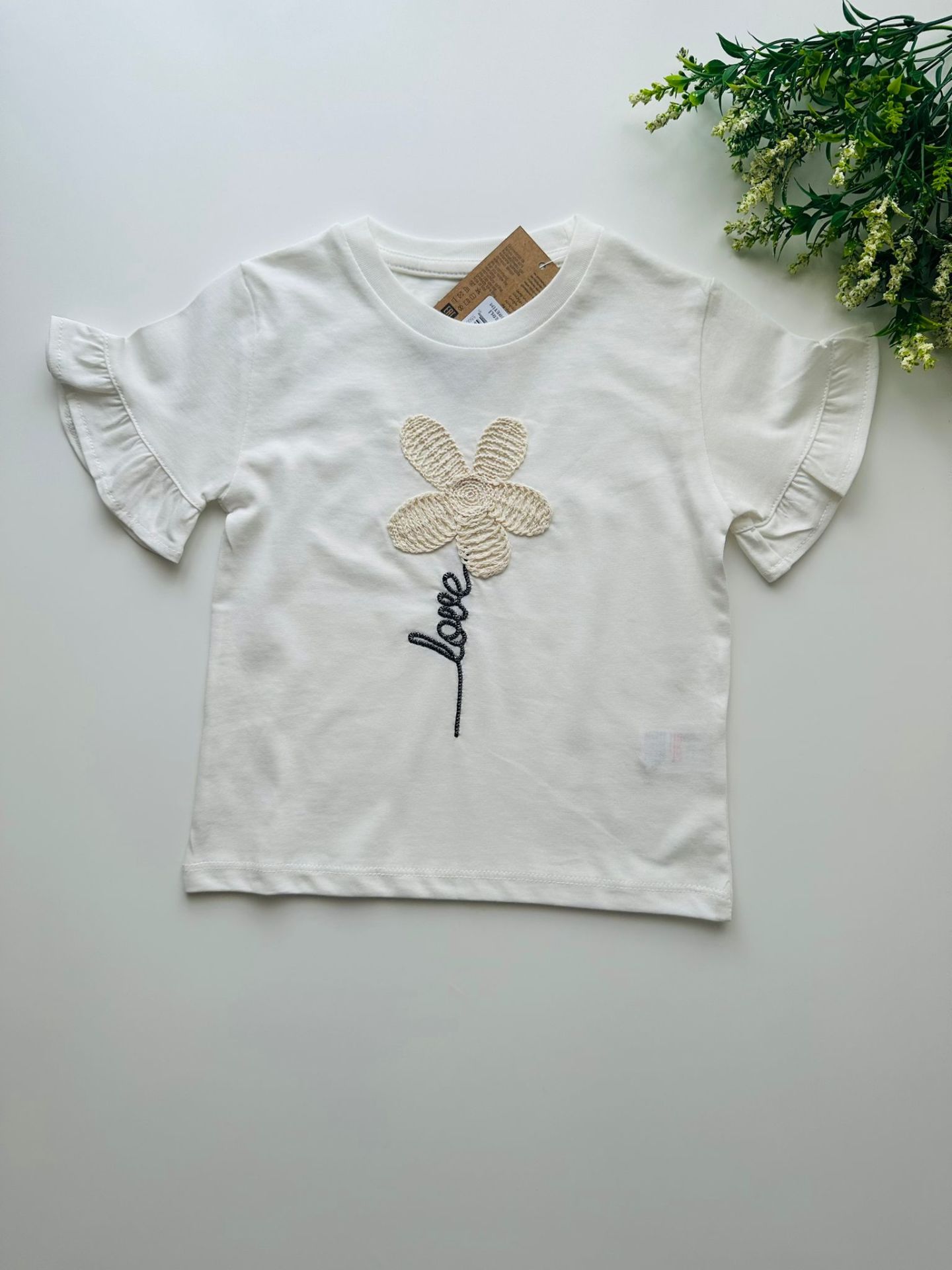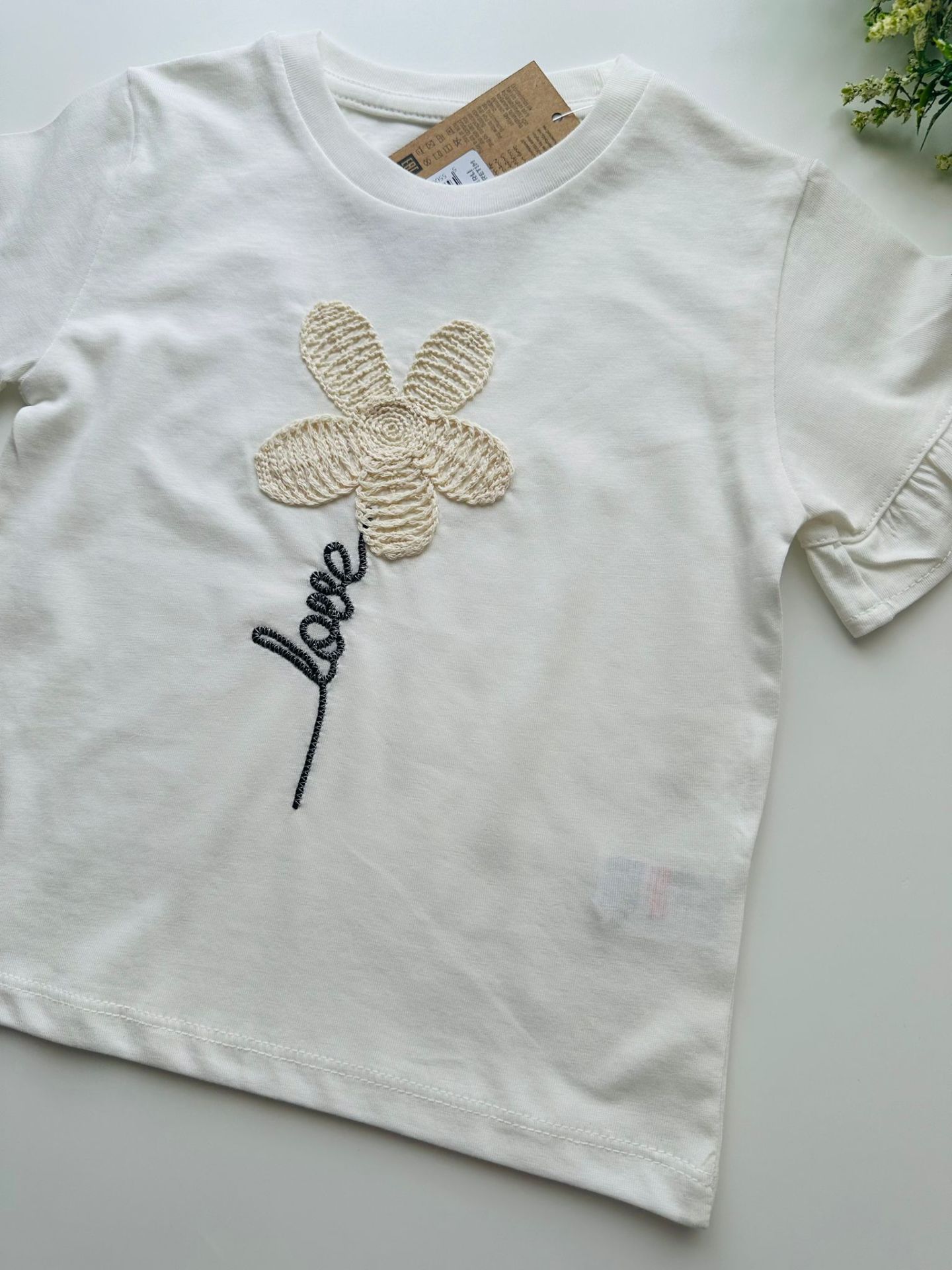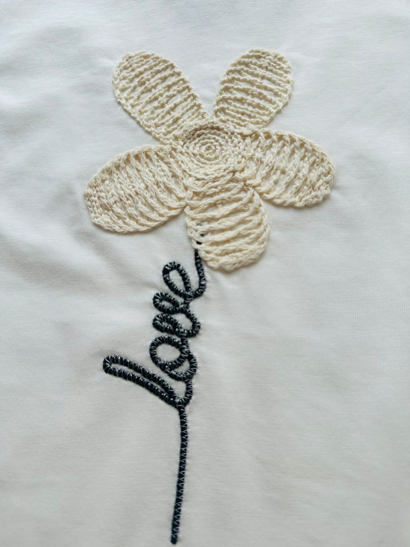 Çiçek Aplikeli Tişört - Beyaz