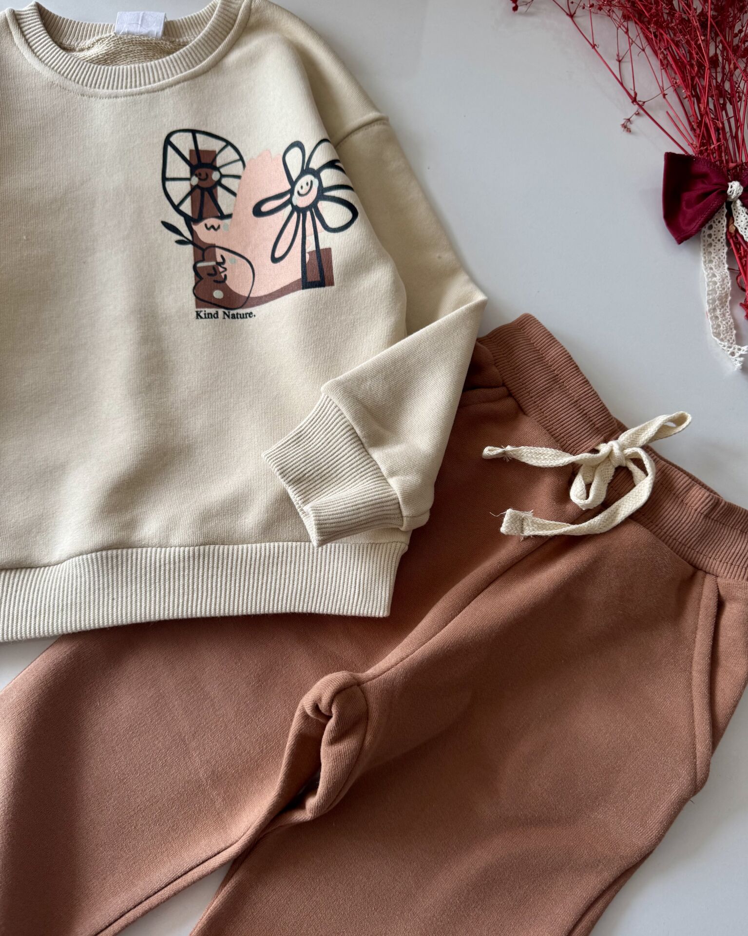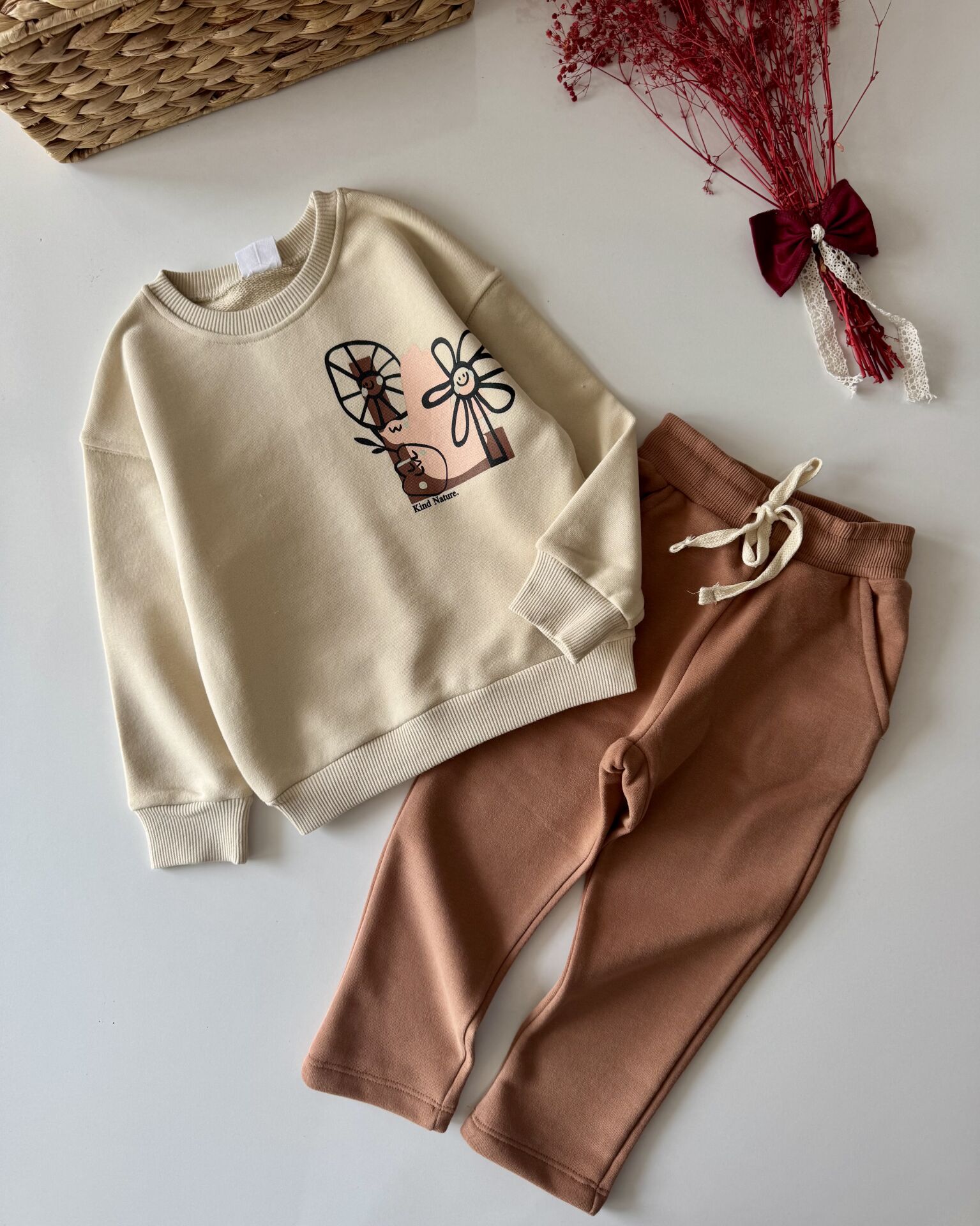 Çiçek Desenli Minimalist Takım - Krem