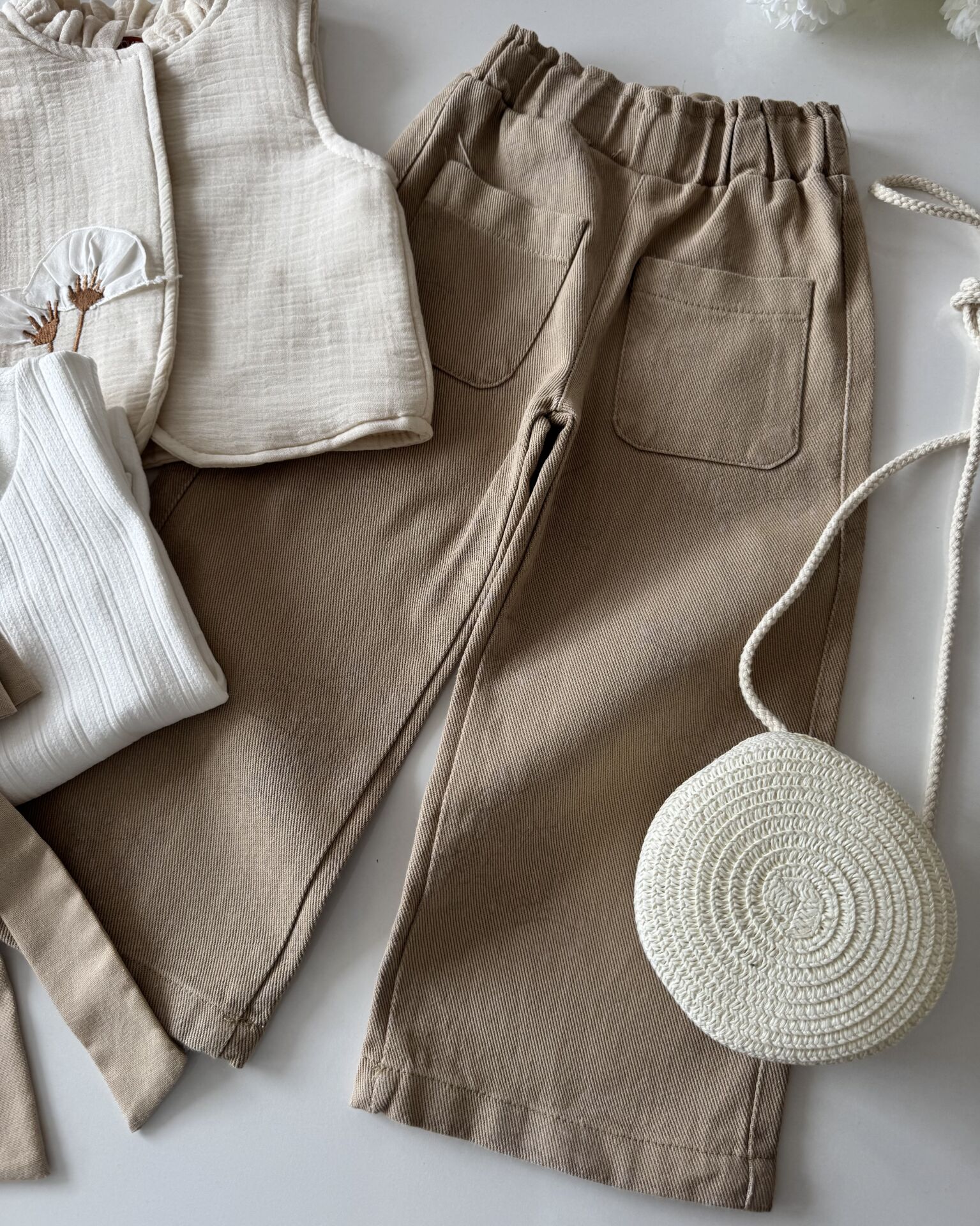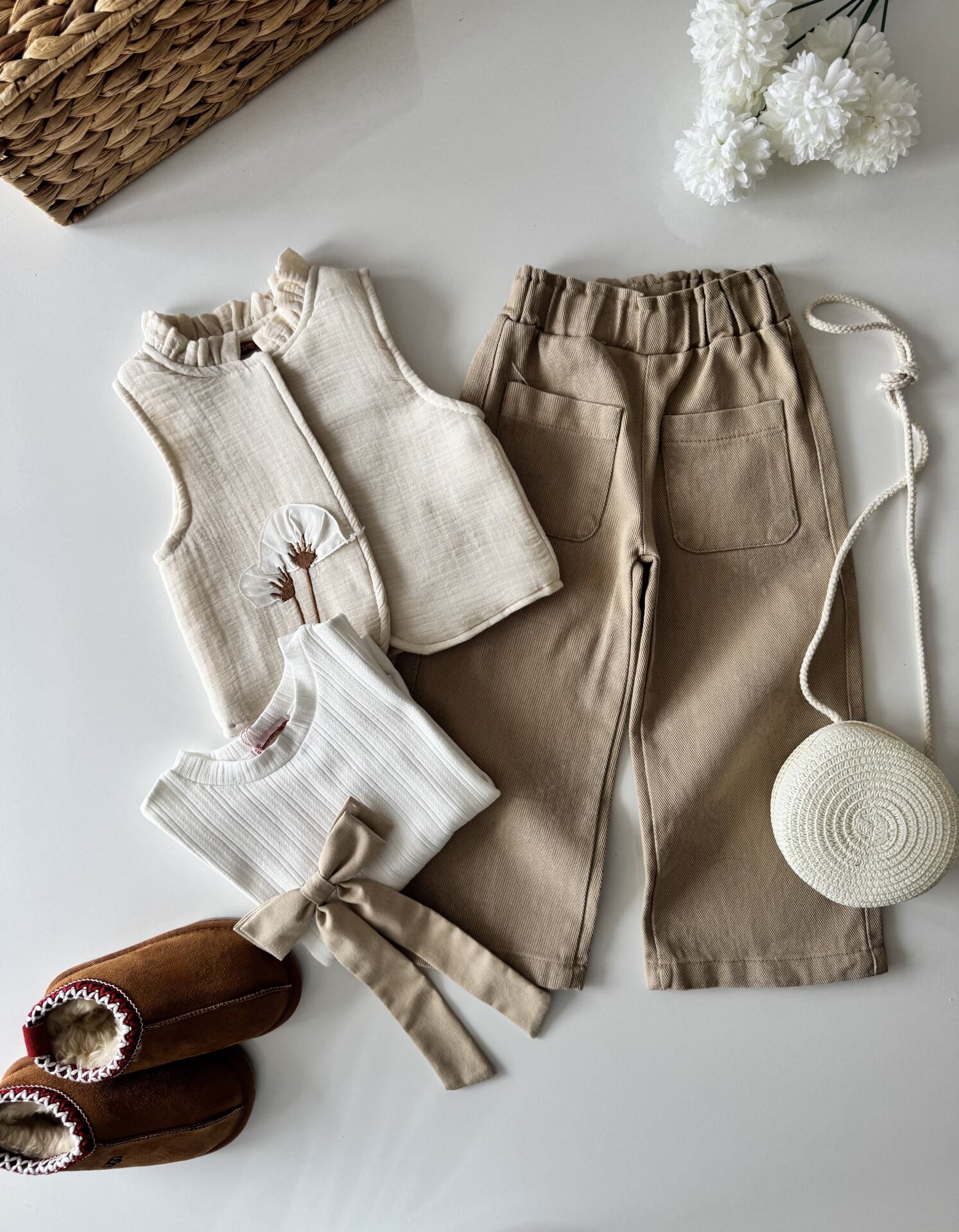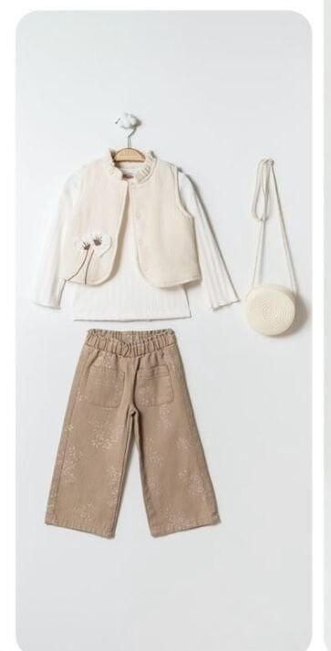 Çiçek İşlemeli Pantolon ve Yelekli 4'lü Set - Krem