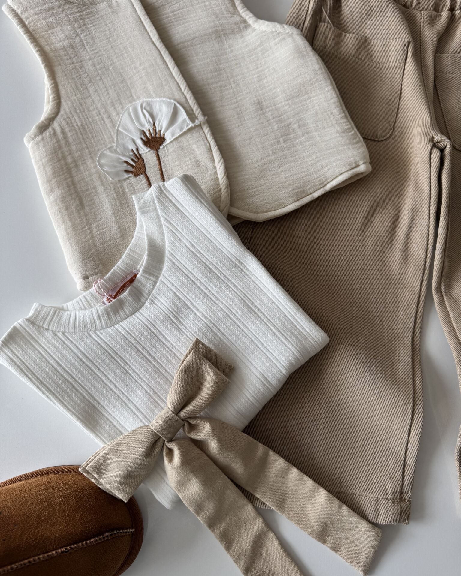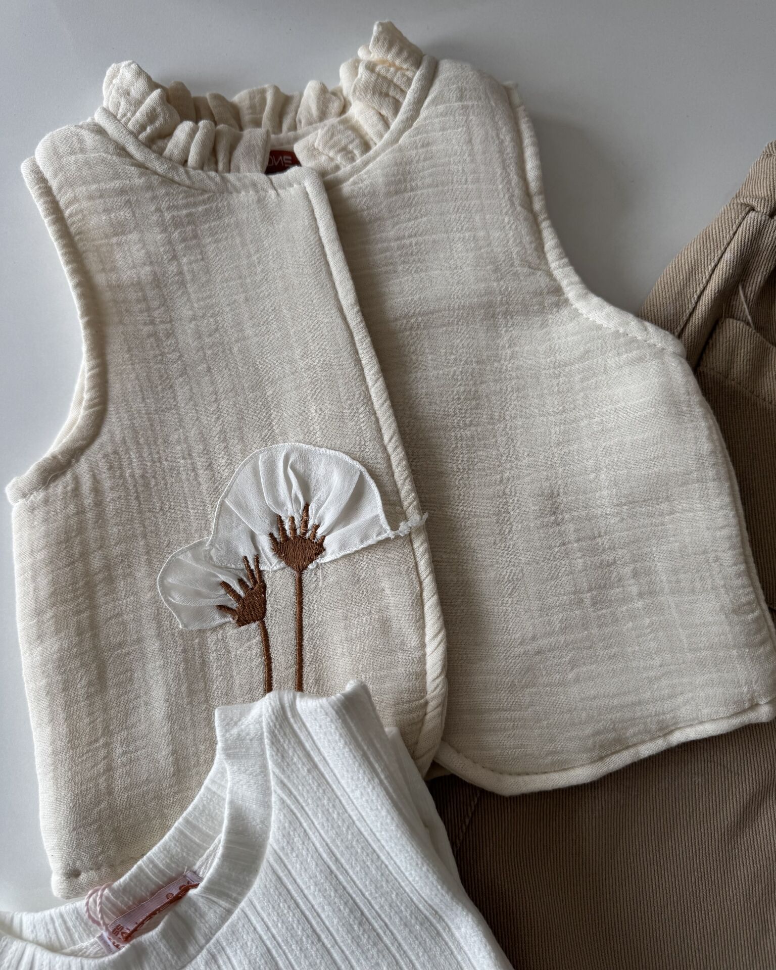 ‣ Yelek Müslin kumaş olup dokuludur. Pantolonda hafif çiçek işlemeleri mevcuttur, Gabardin kumaştır.Penyesi pamuklu kumaştır. Ürünler de pamuk oranı yüksektir.Terletmez, nefes alan kumaş.