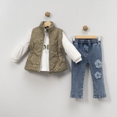 Çiçek İşlemeli Yelekli Pantolonlu 3'lü Set - Yeşil