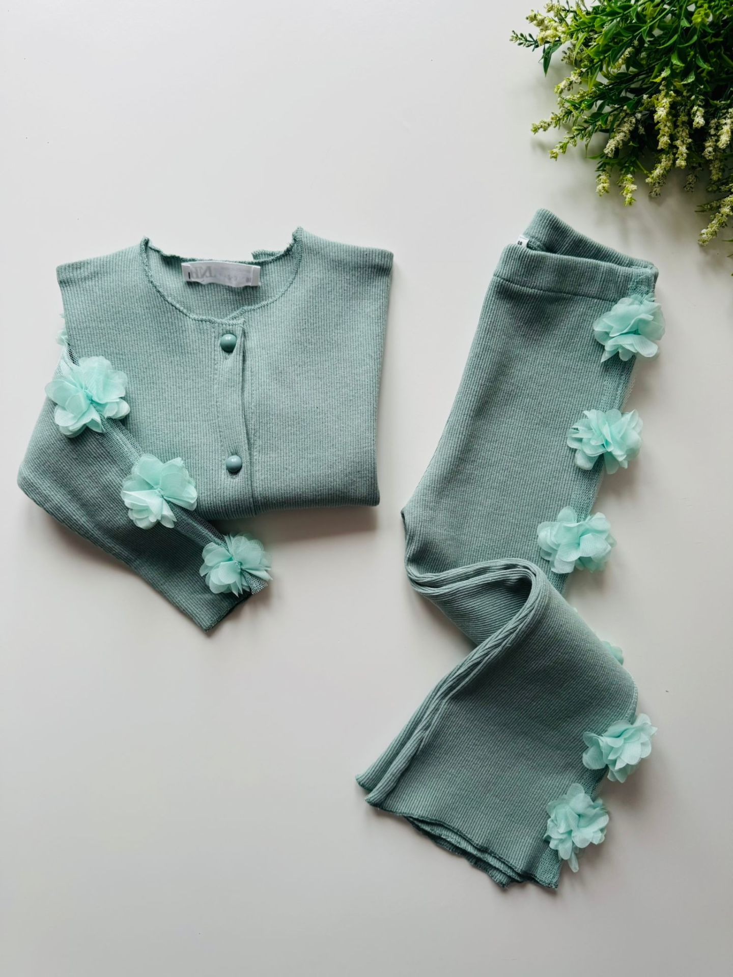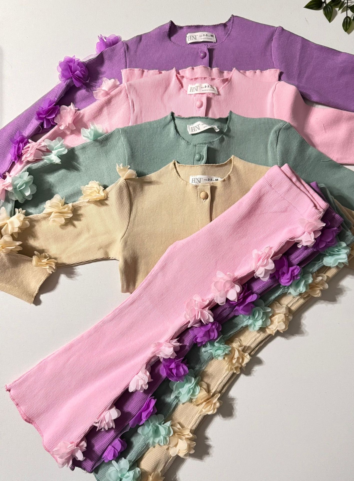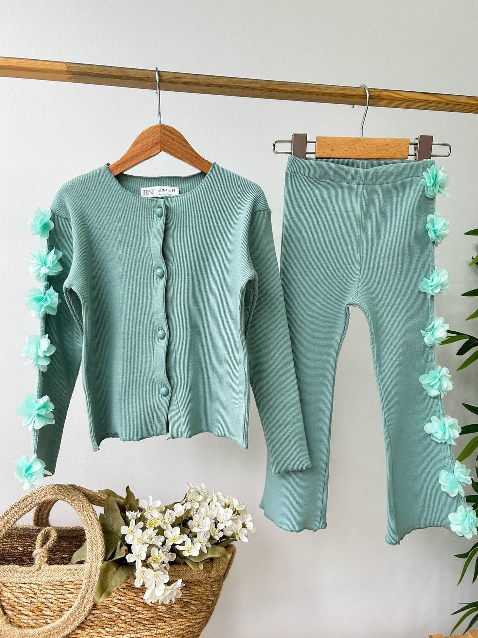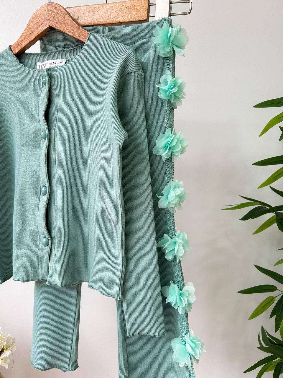Ürün Bilgisi : Tok Kumaşlı Kaşkorse üzerine tek kolda ve alt yanda (tek taraflı) çiçek aplikeli takım Alt hafif bol paça beli tamamen lastikli yumuşacık kumaş.