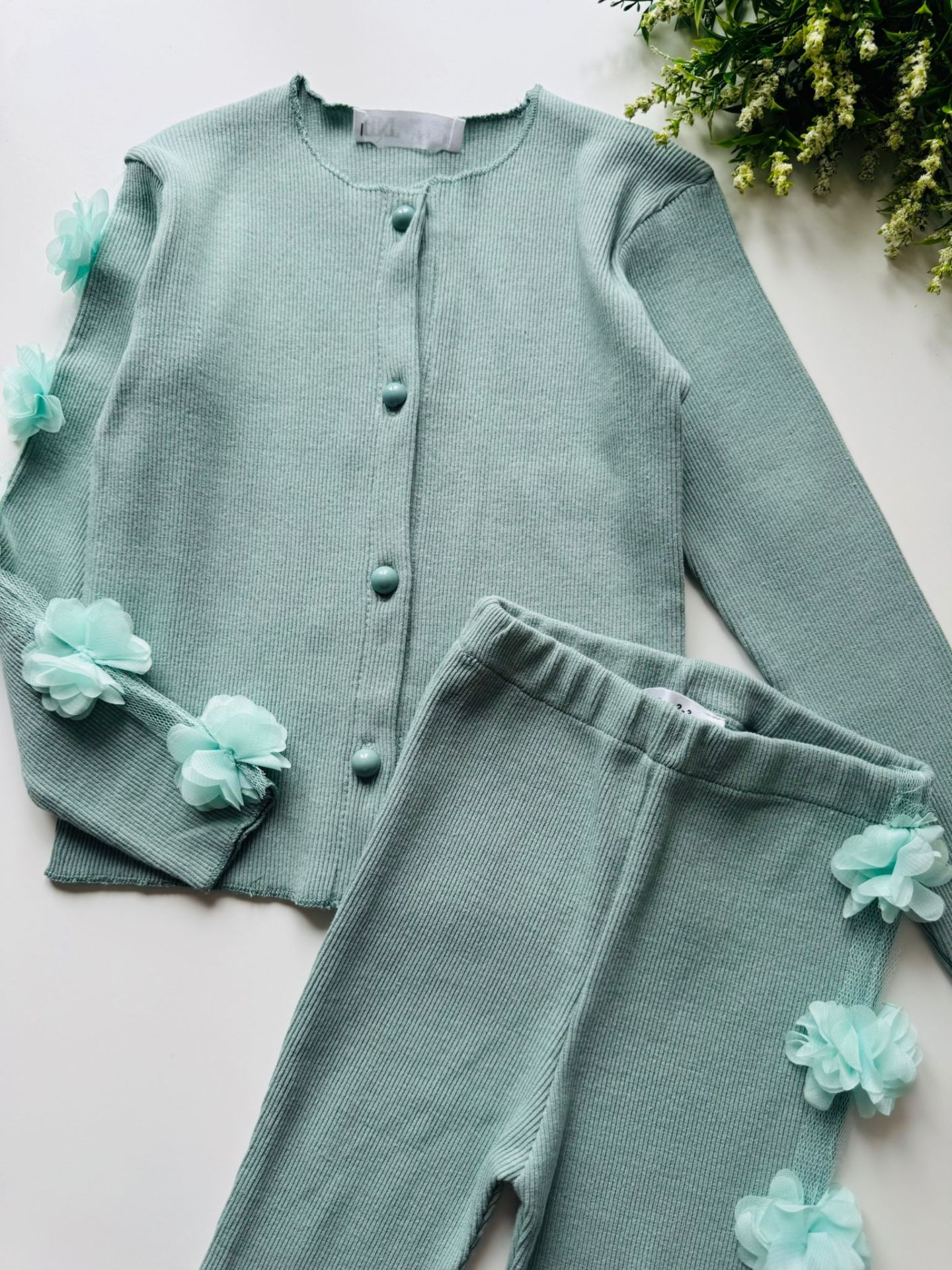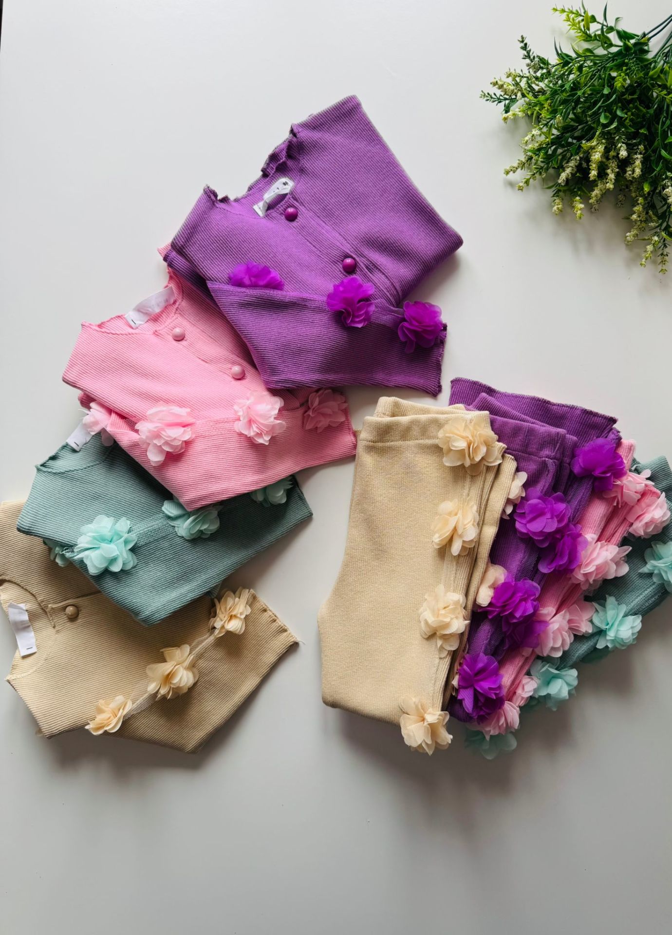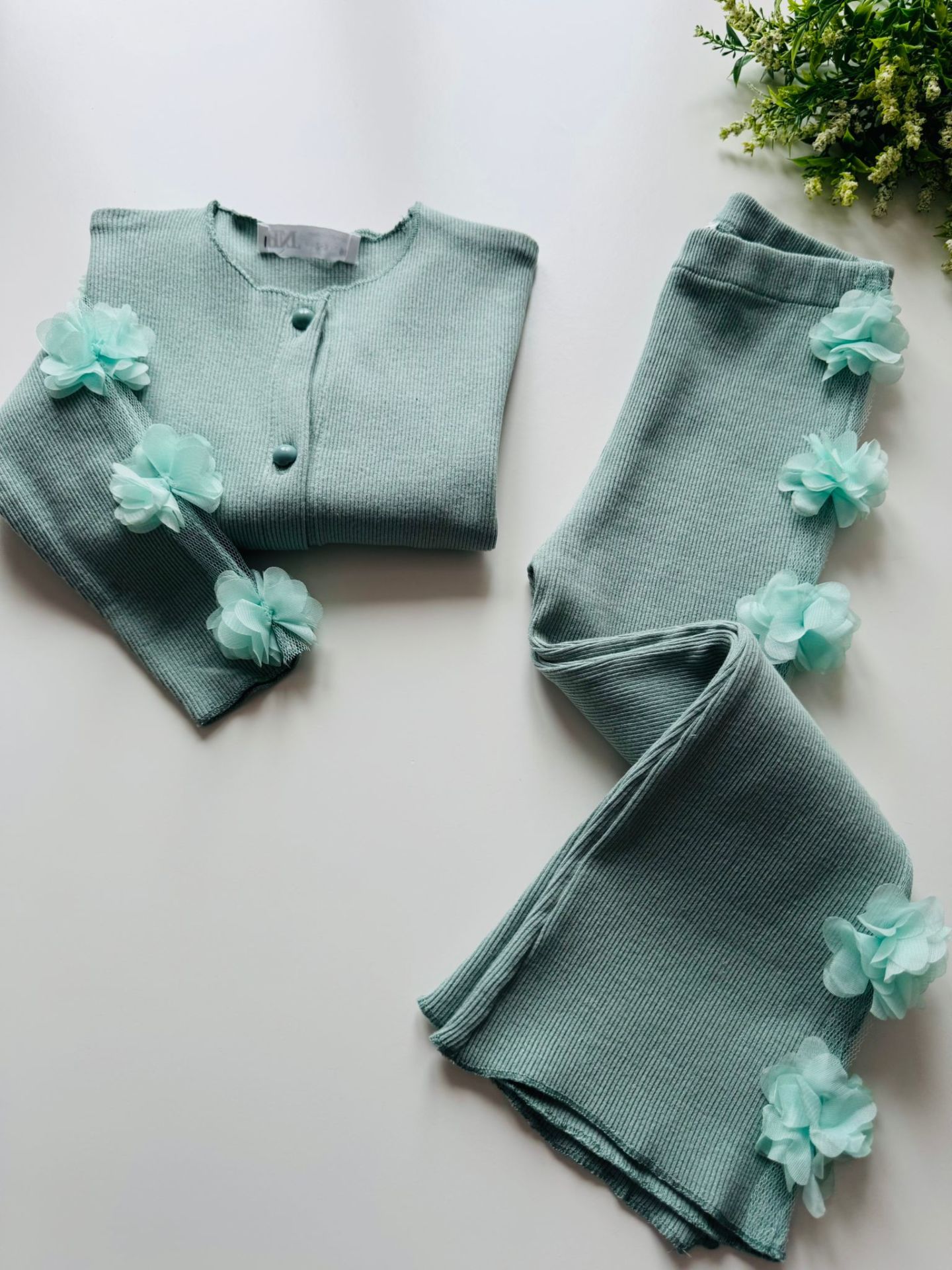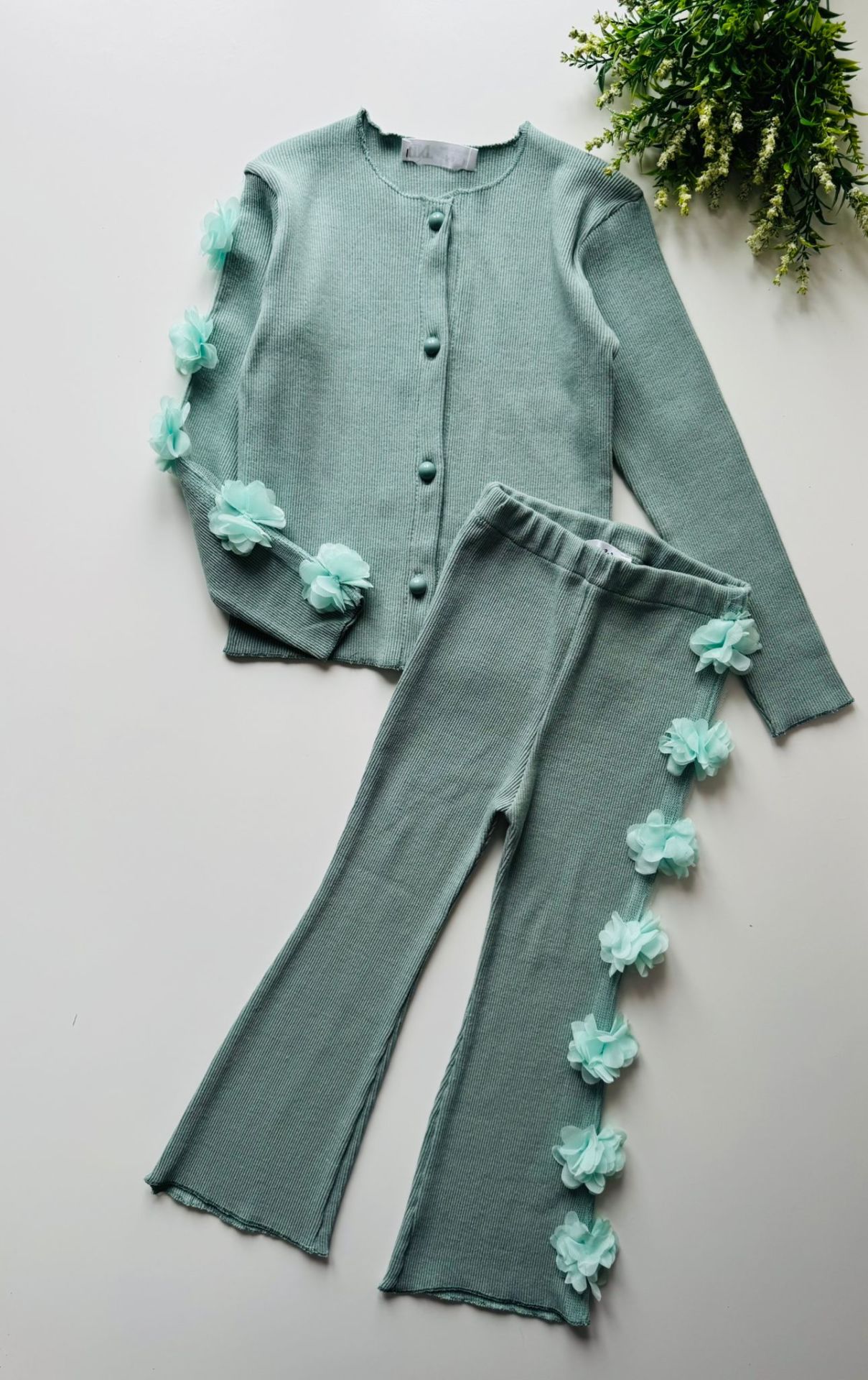 Ürün Bilgisi : Tok Kumaşlı Kaşkorse üzerine tek kolda ve alt yanda (tek taraflı) çiçek aplikeli takım Alt hafif bol paça beli tamamen lastikli yumuşacık kumaş.