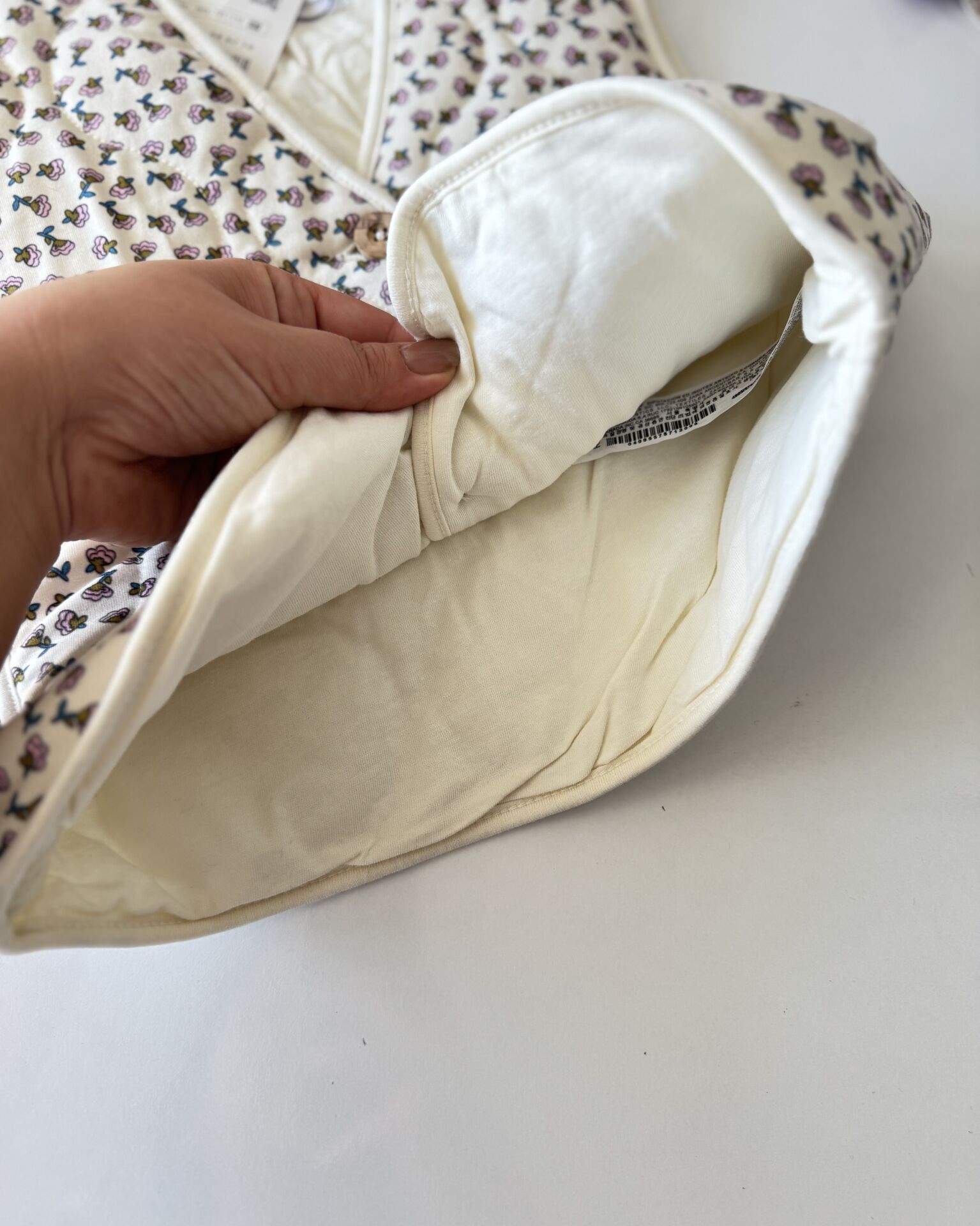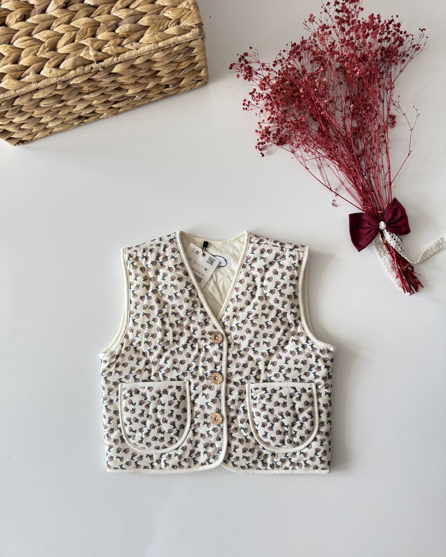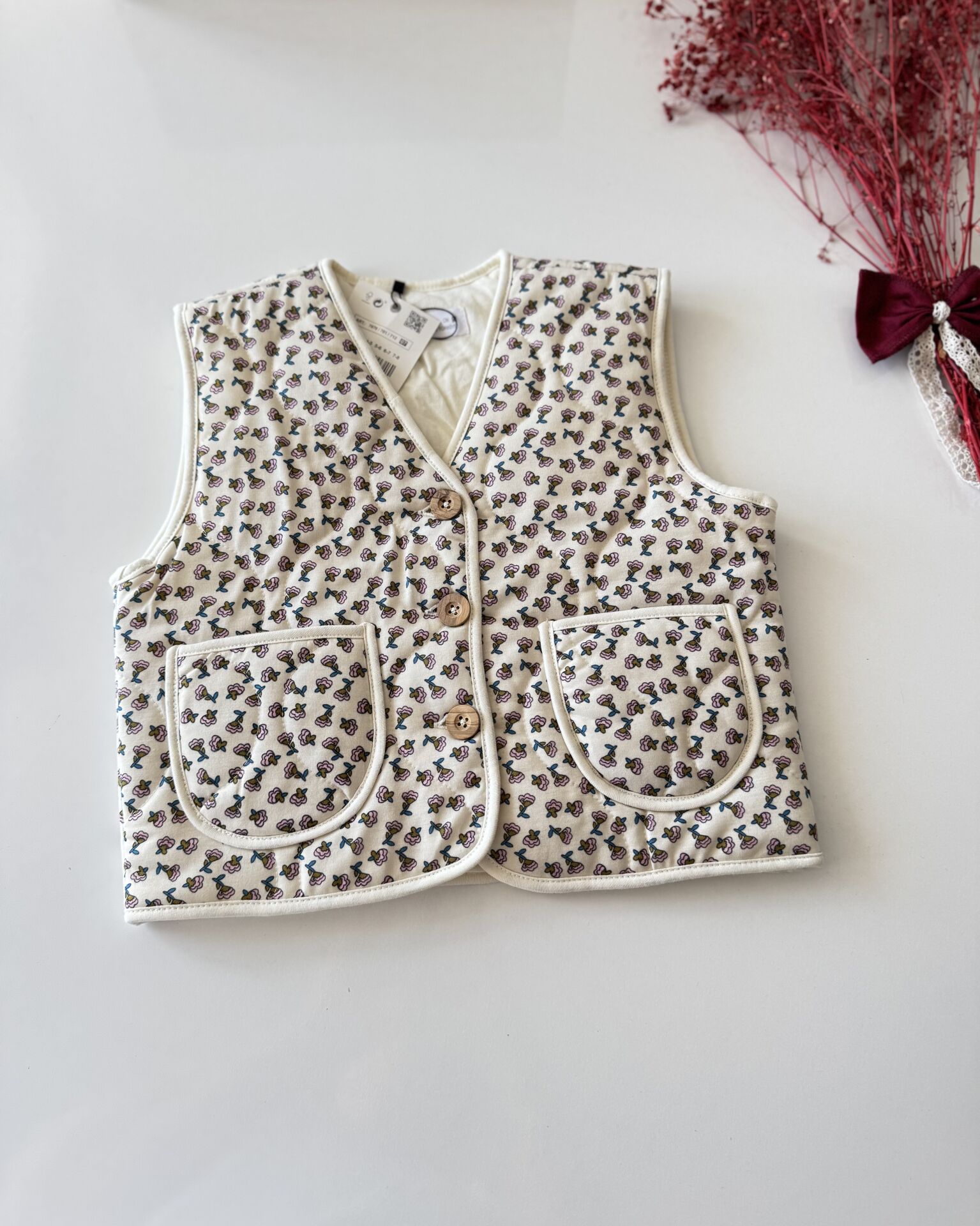 Çiçekli Kapitone Cepli Defne Yelek - Krem