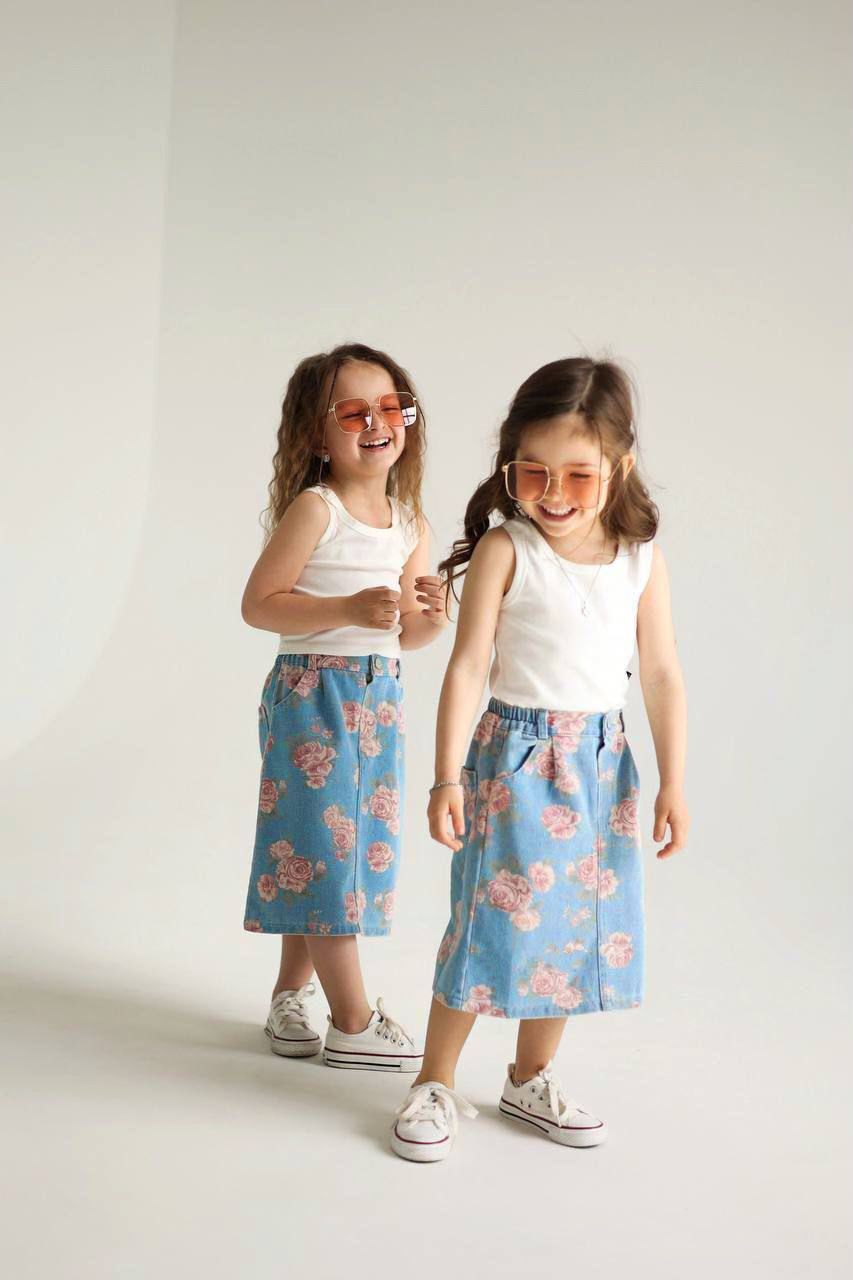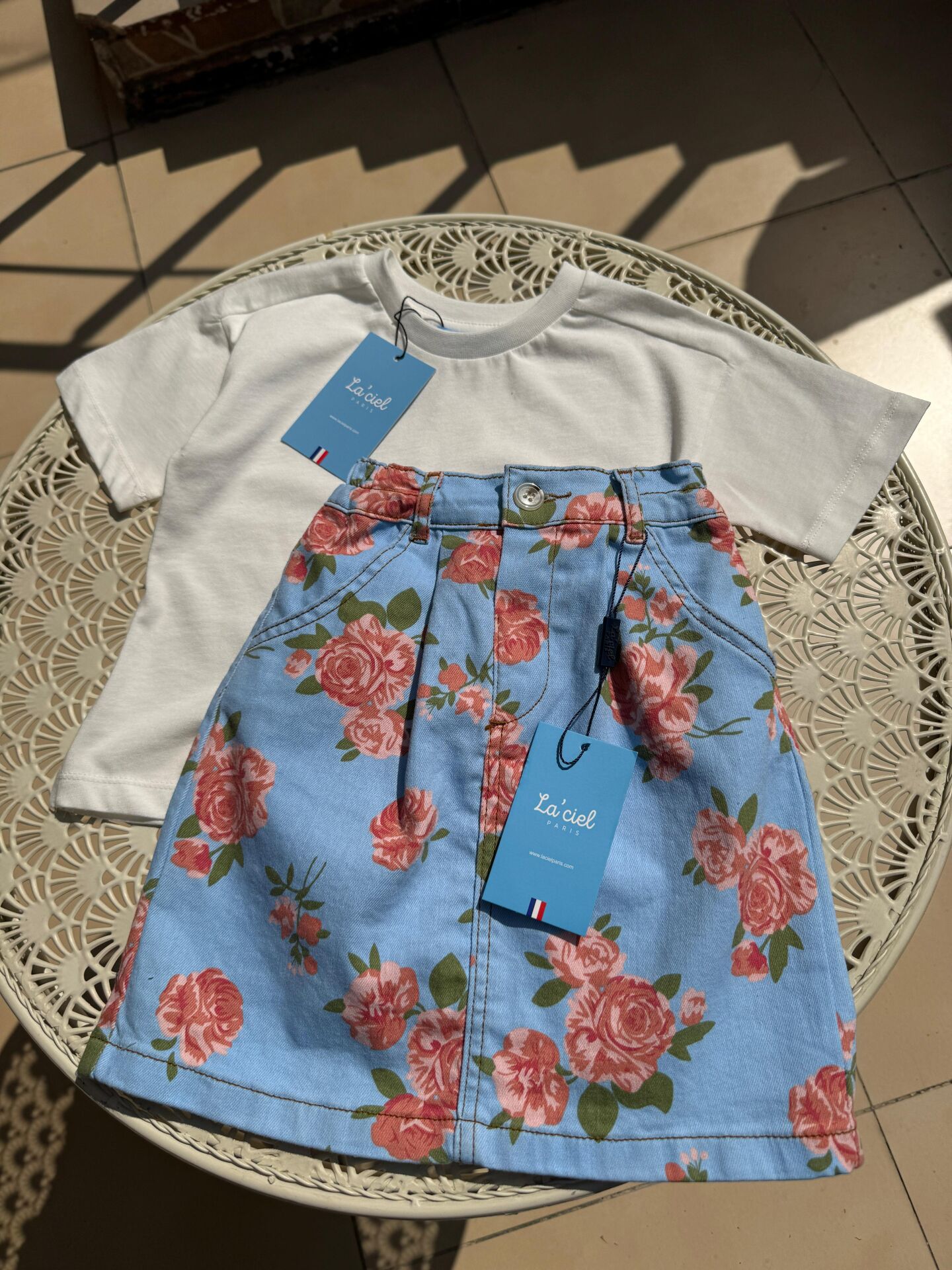 Ürün Bilgisi ; Denim çiçekli midi etek, üstündeki kısa kollu beyaz tişörttür. Sıfır kollu değildir.