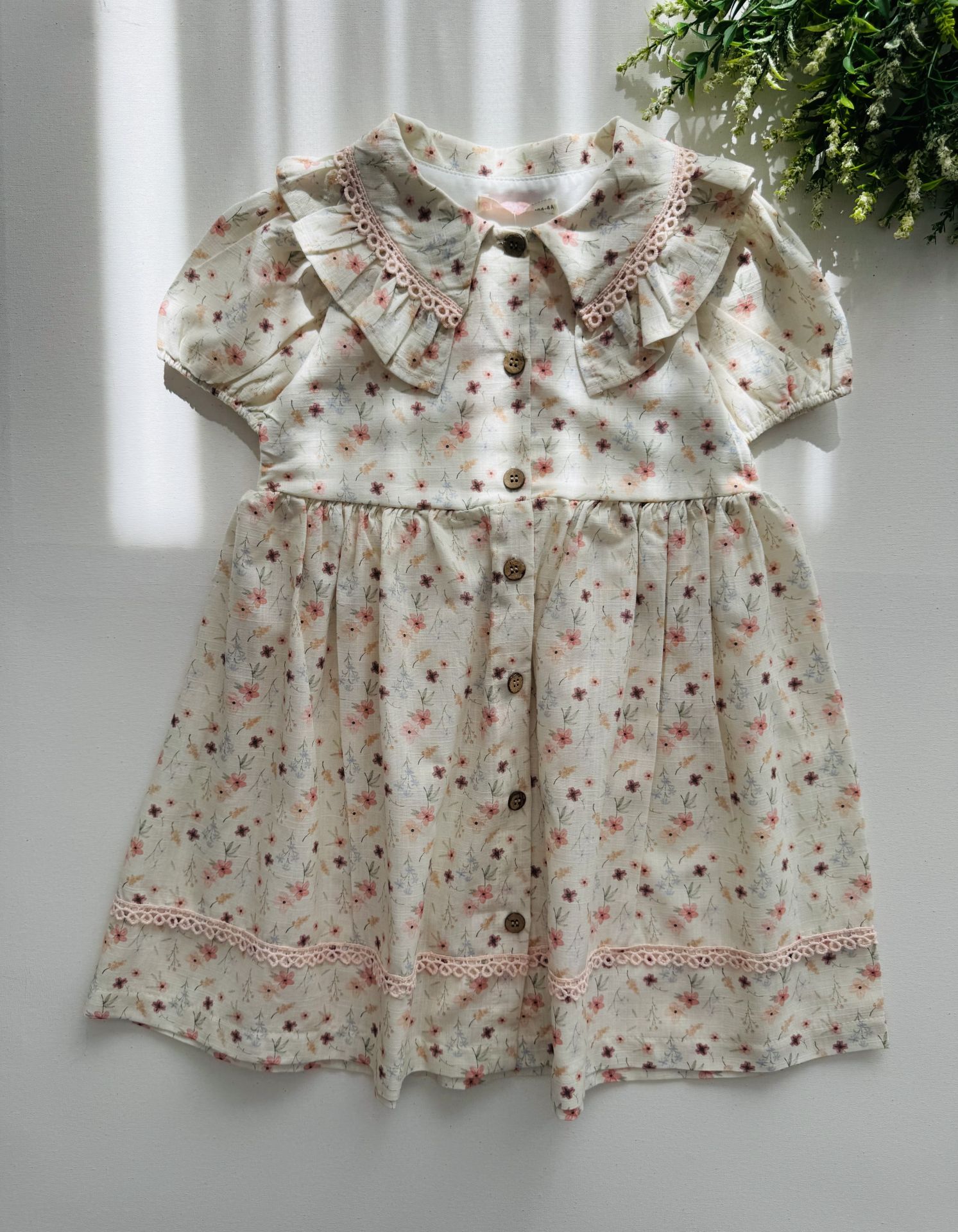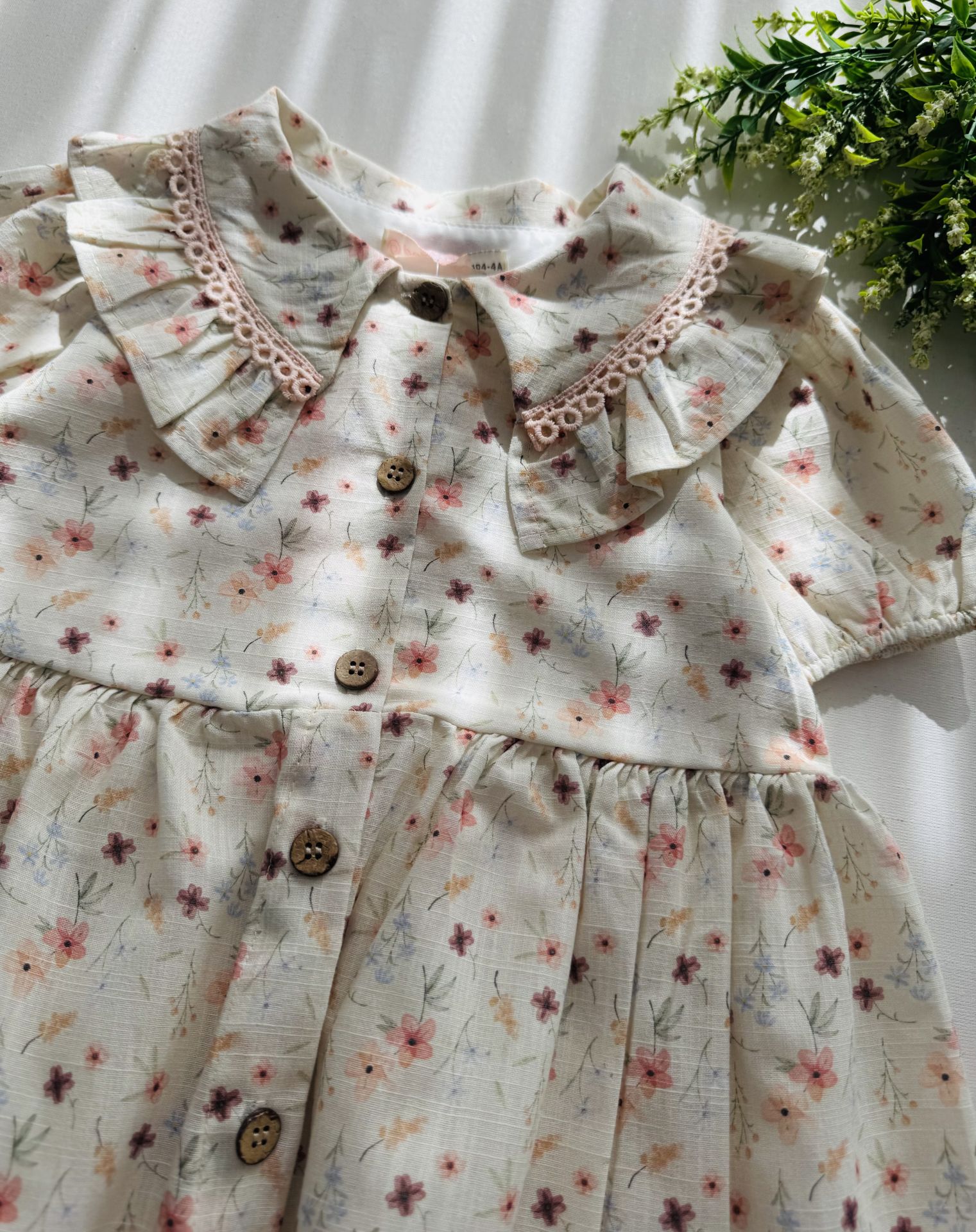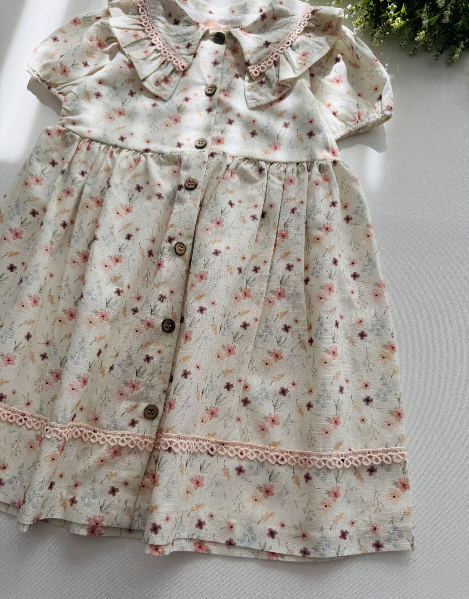 Ürün Bilgisi : Pamuklu keten üzerine çıtır çiçekli minimalist elbise Önü tamamen düğmelidir.
