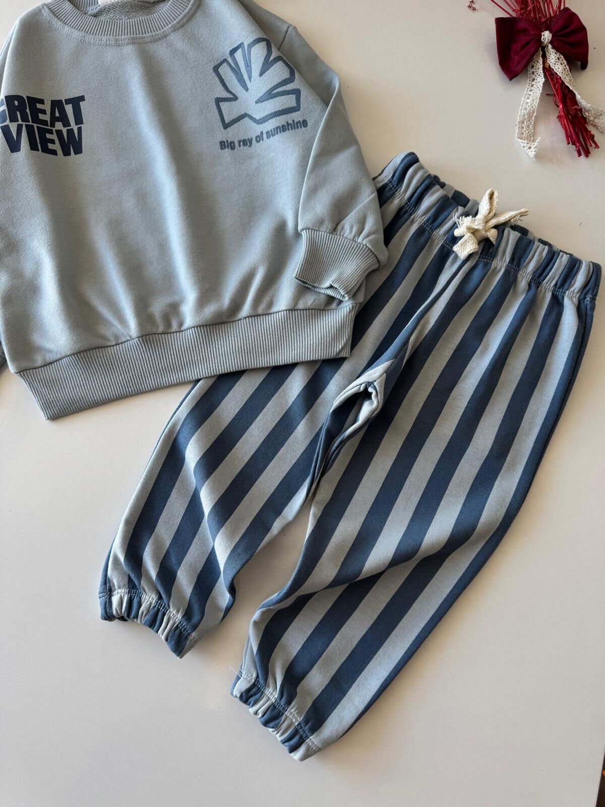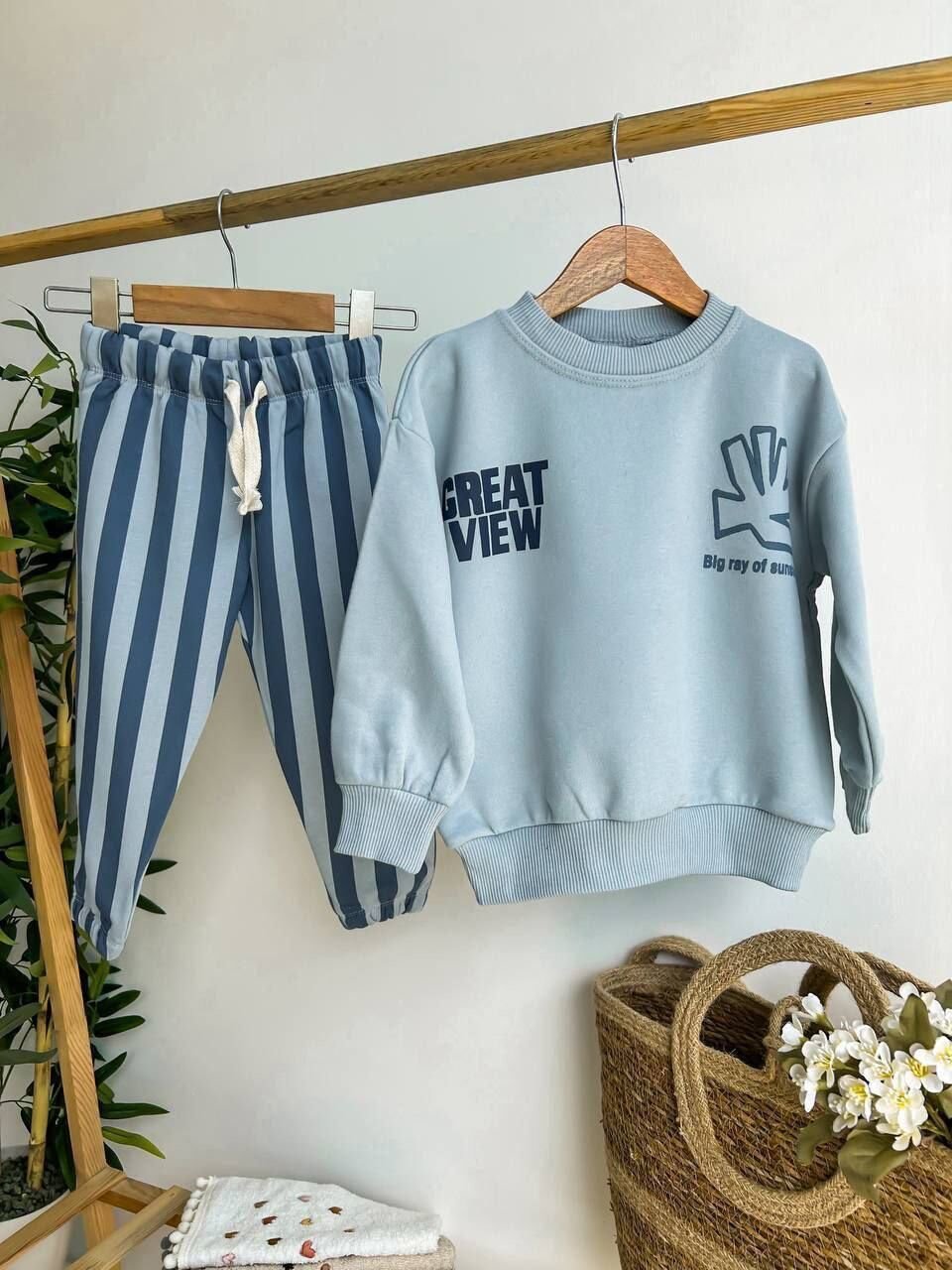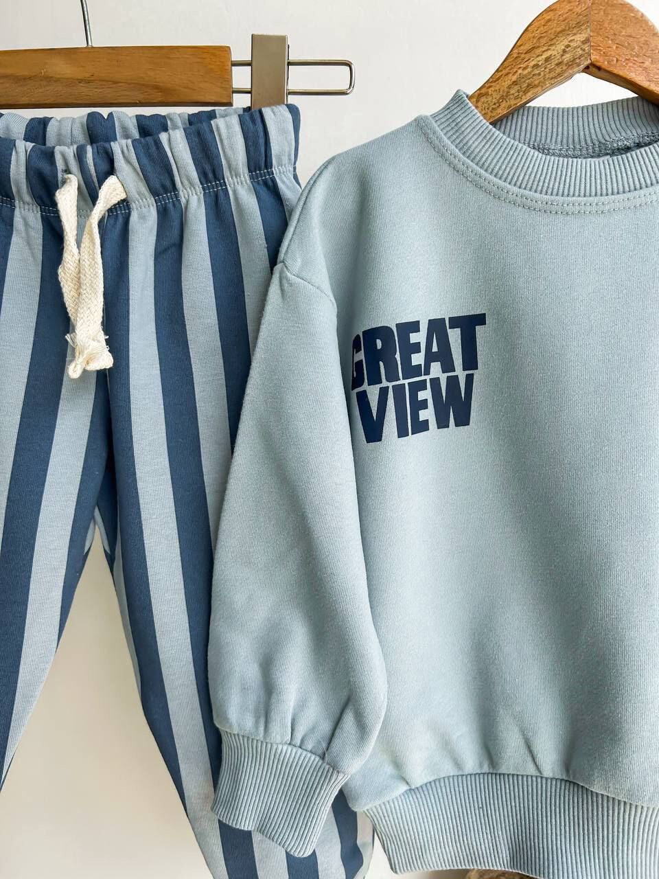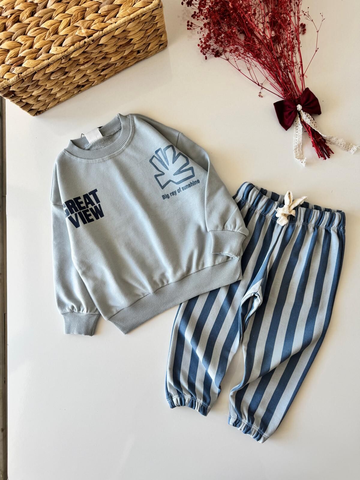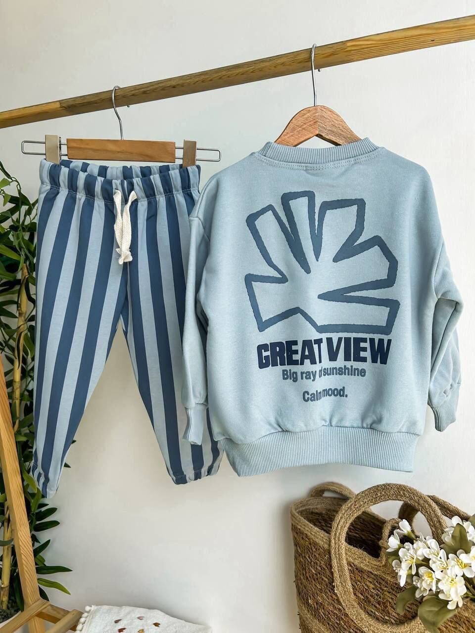 Çizgili Pantolonlu Sloganlı Takım - Mavi