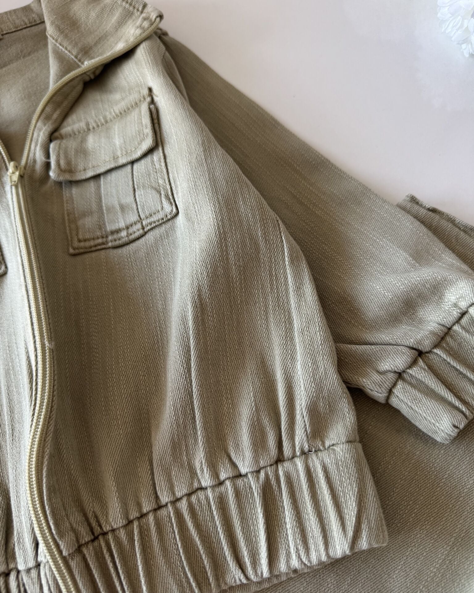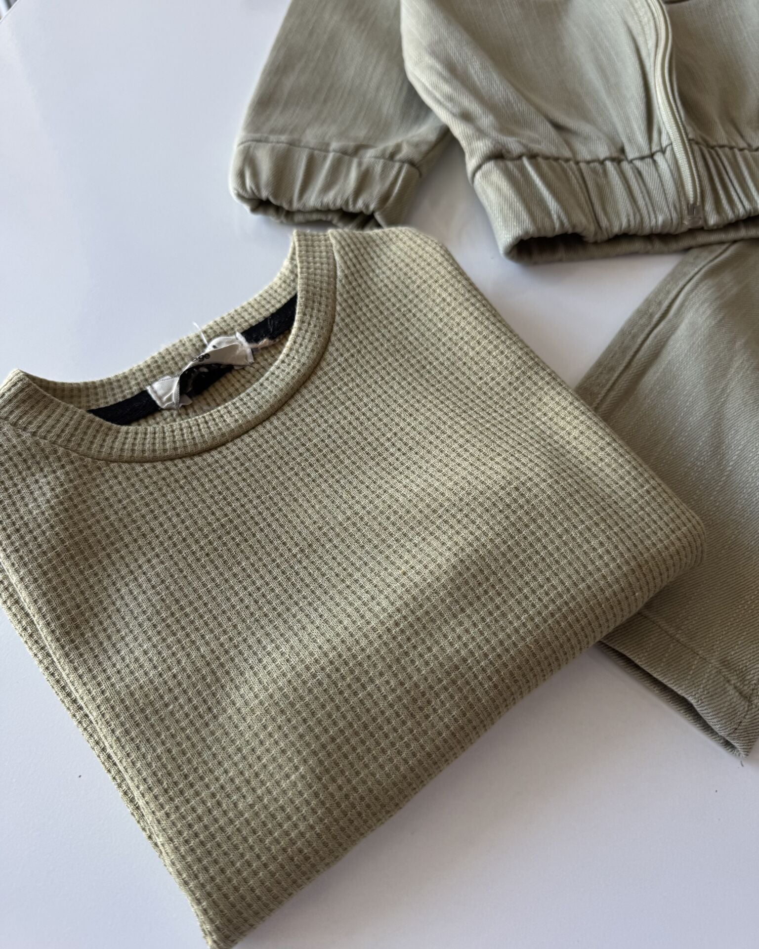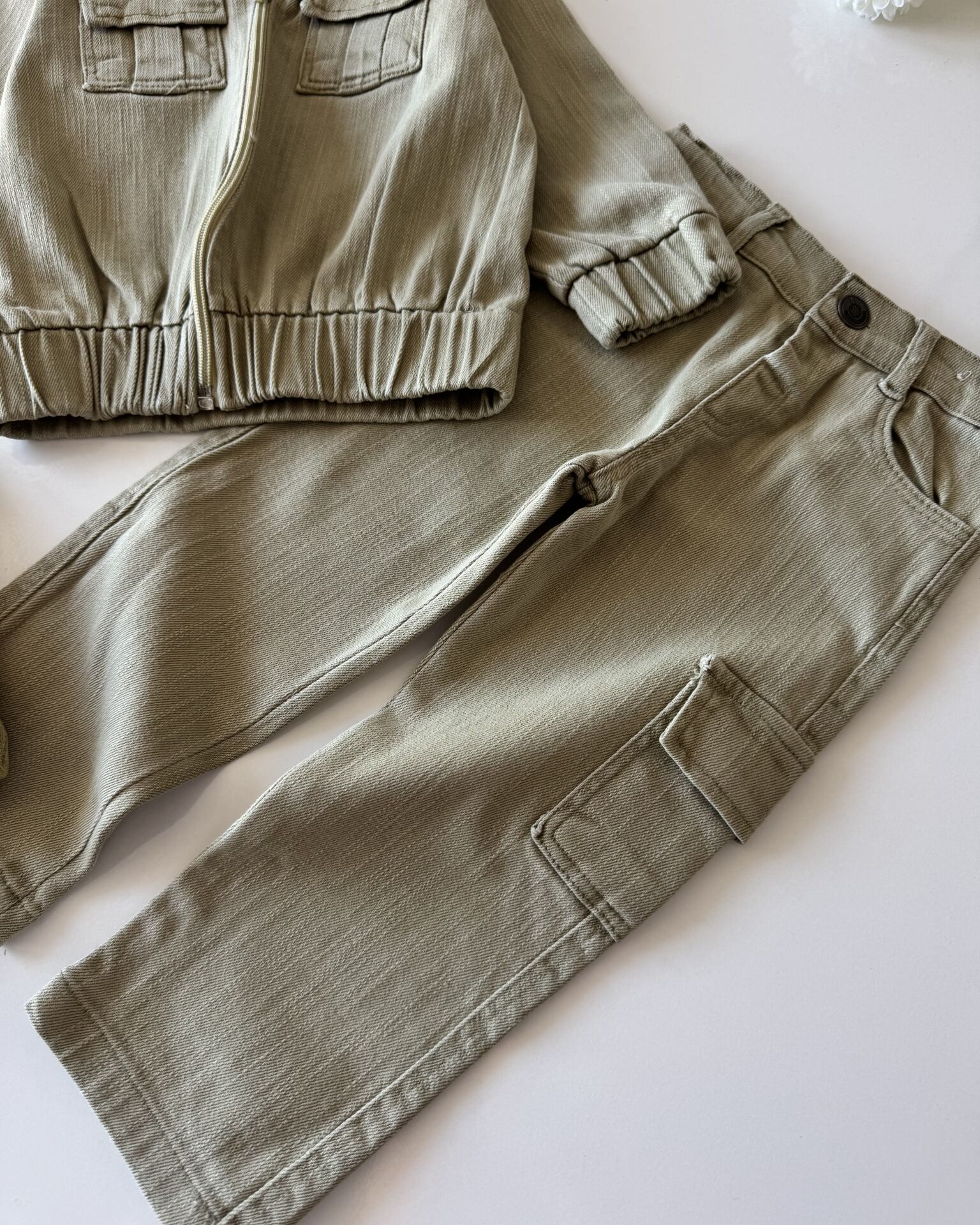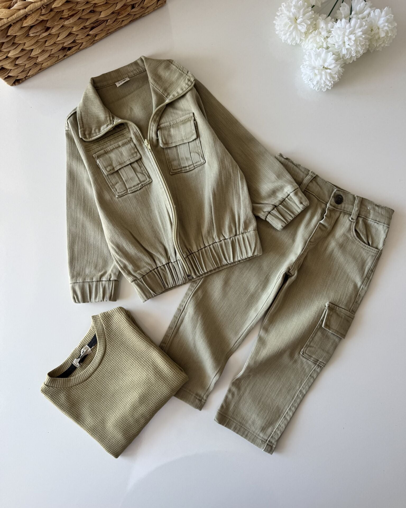Denim Ceketli 3'lü Pantolonlu Set - Yağ Yeşili