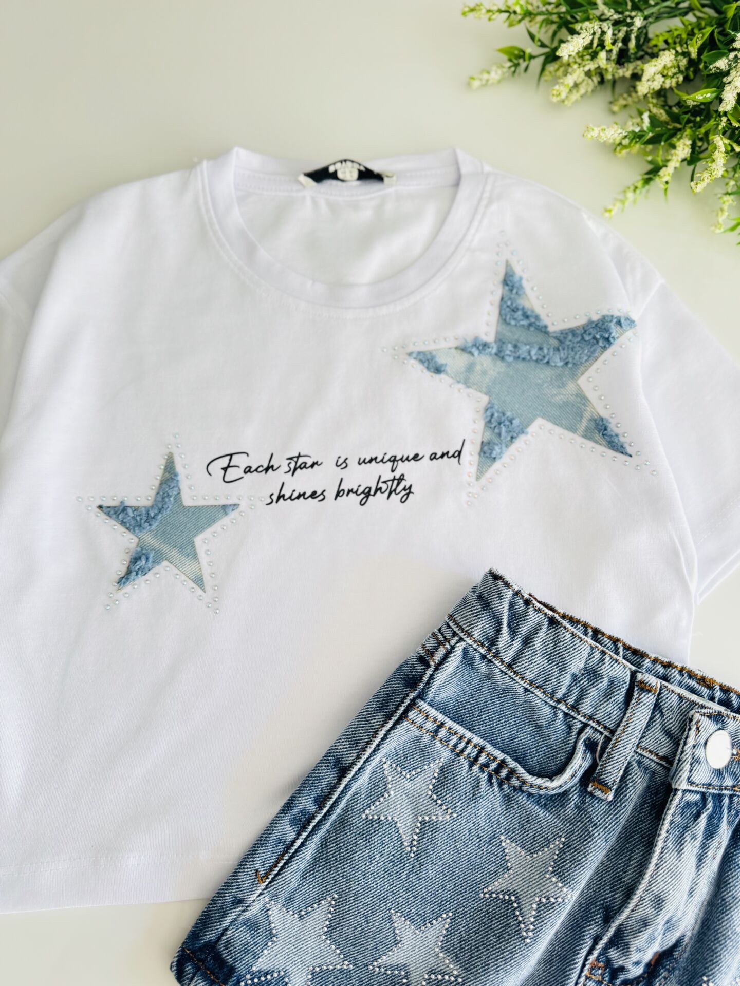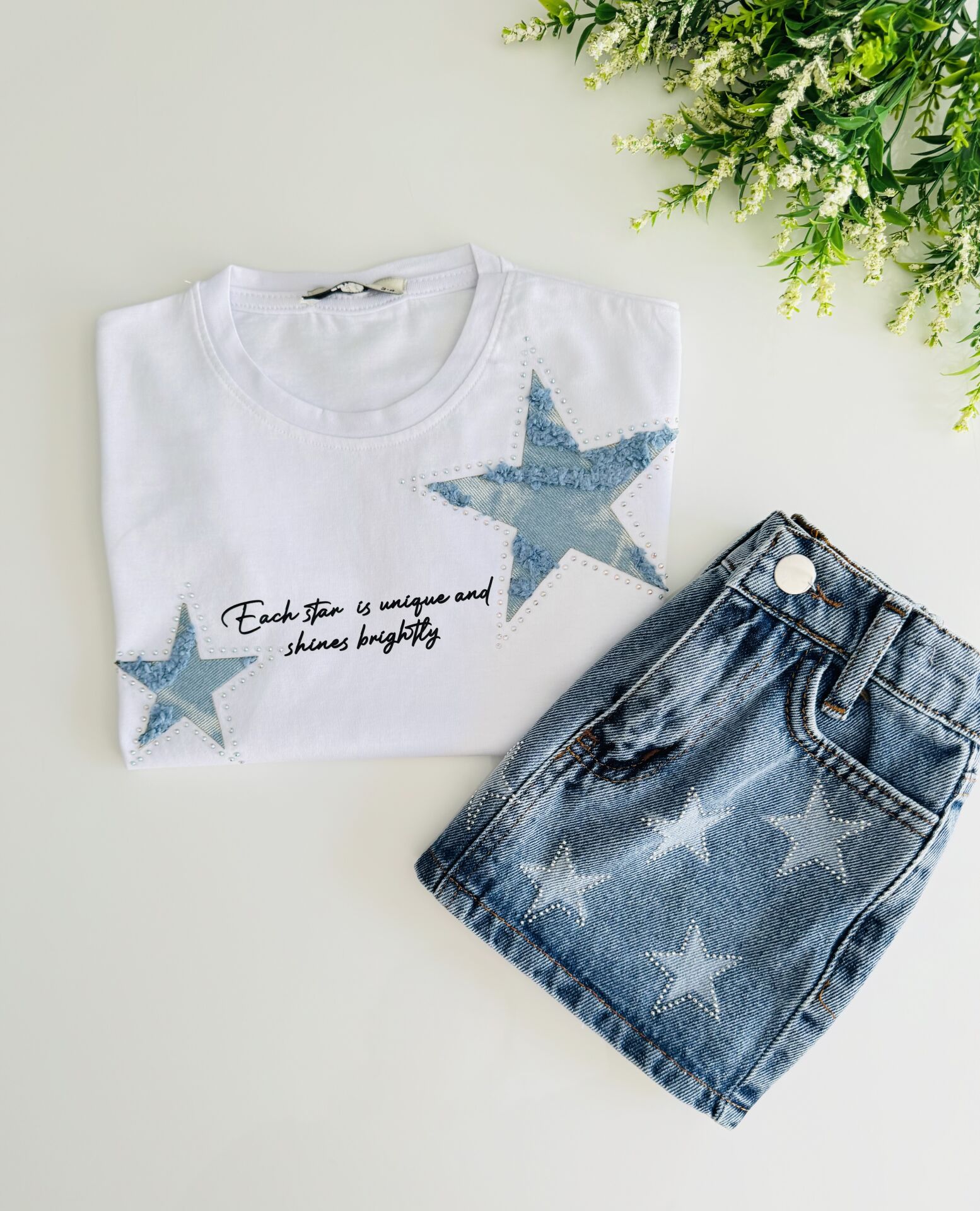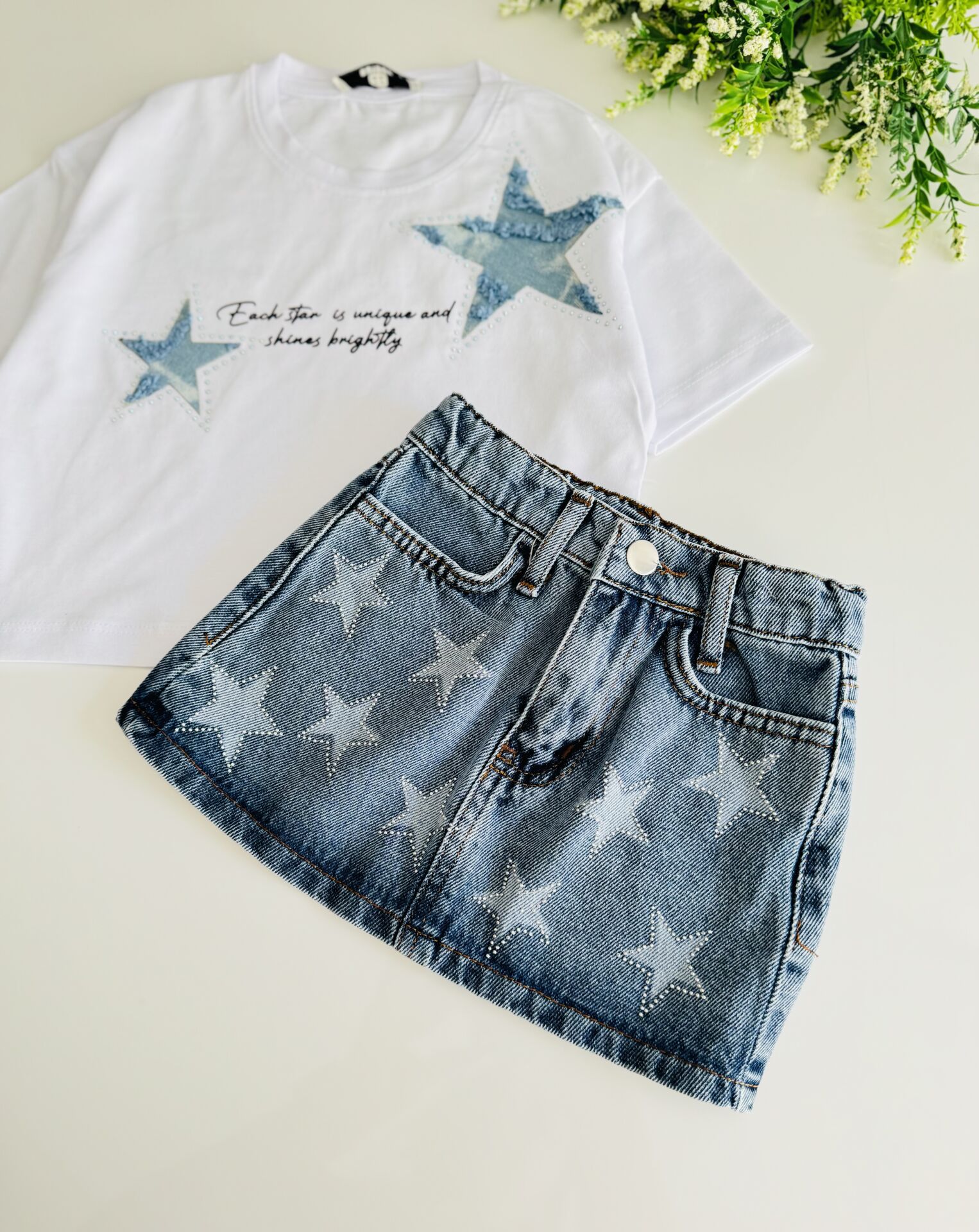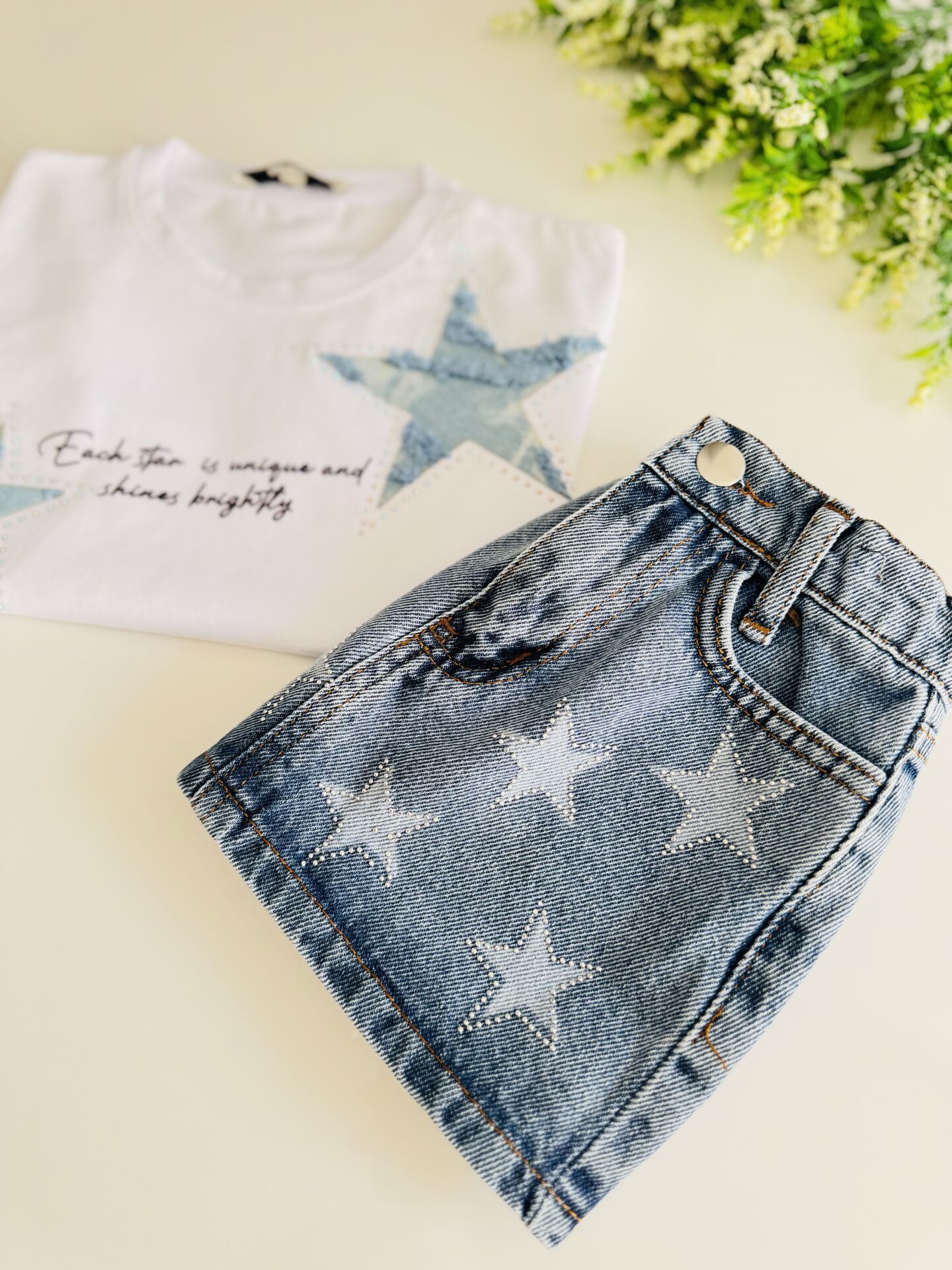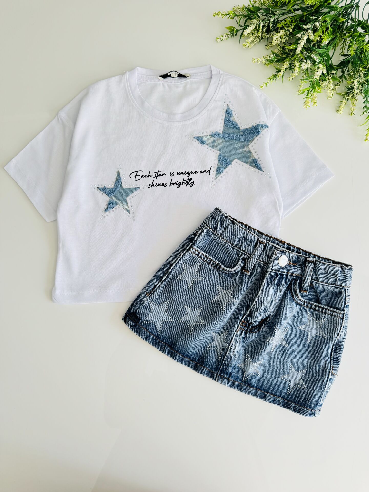 Ürün Bilgisi : Yıldız taşlı denim etekli hafif crop takım