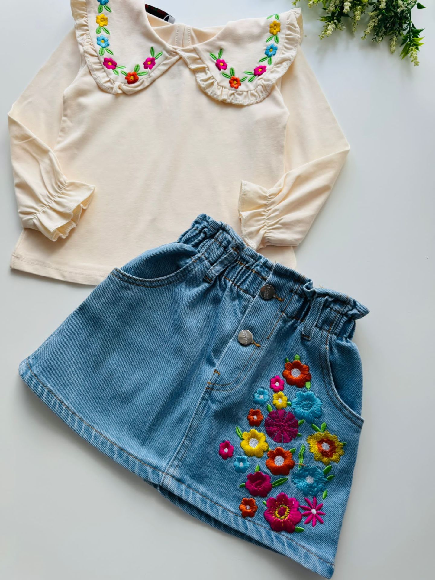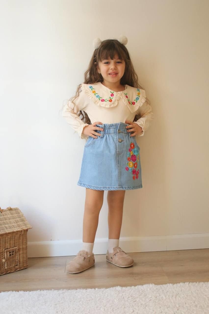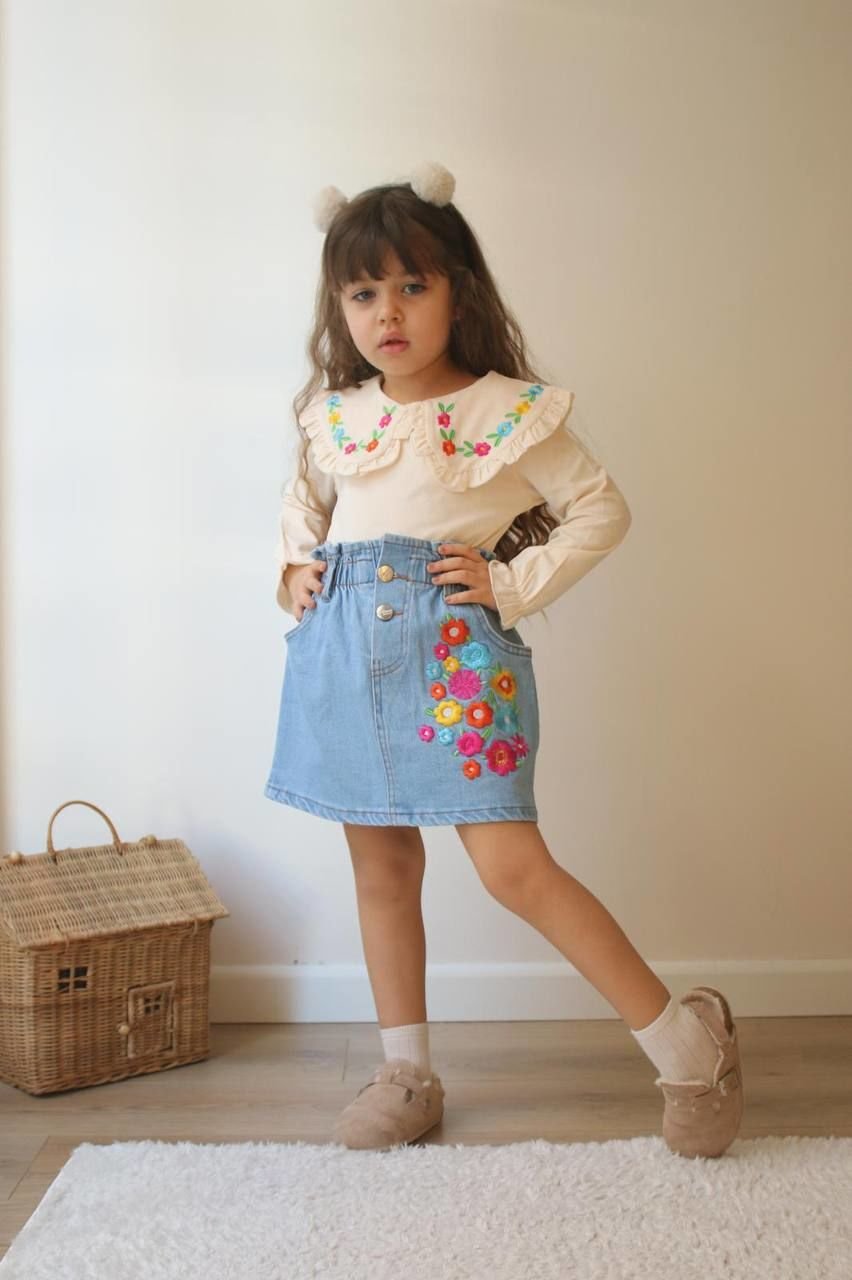 Ürün Bilgisi : Üst 2 iplik kumaş , yakası nakışlı.. Alt nakışlı beli büzgülü denim etek