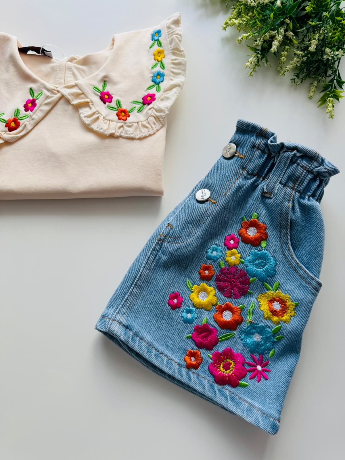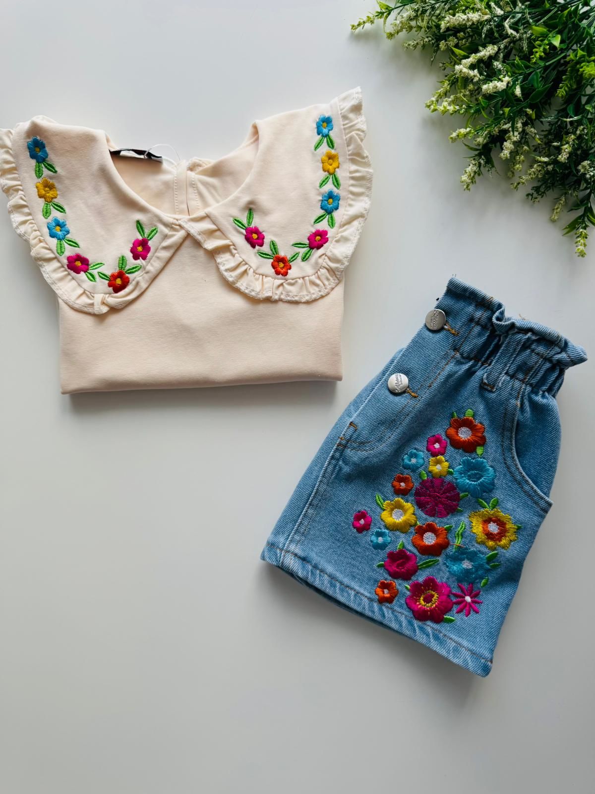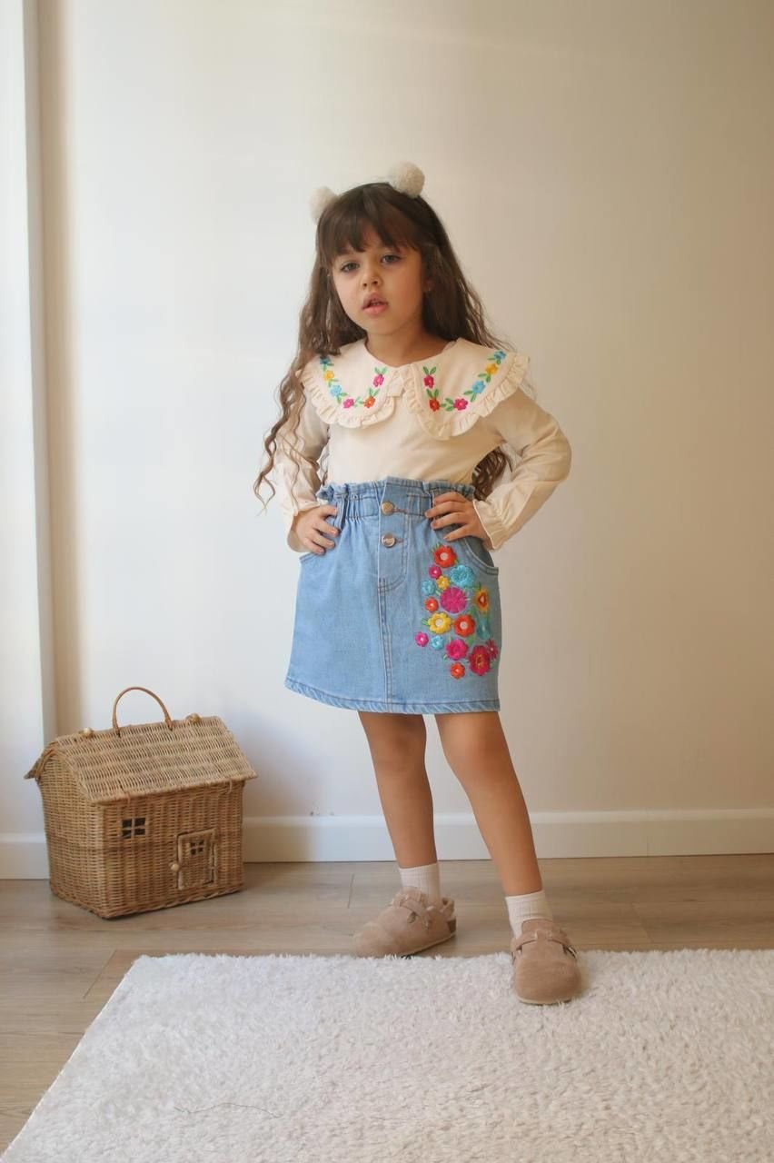 Ürün Bilgisi : Üst 2 iplik kumaş , yakası nakışlı.. Alt nakışlı beli büzgülü denim etek