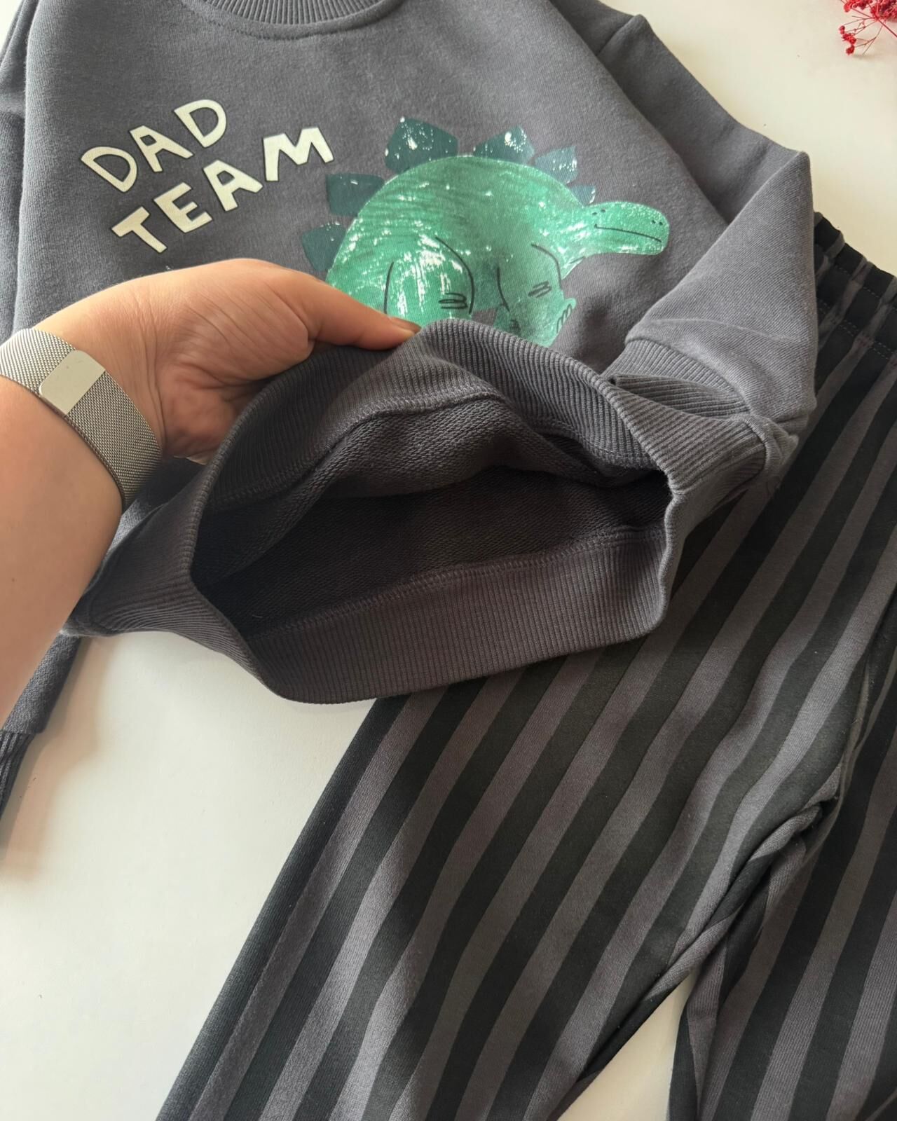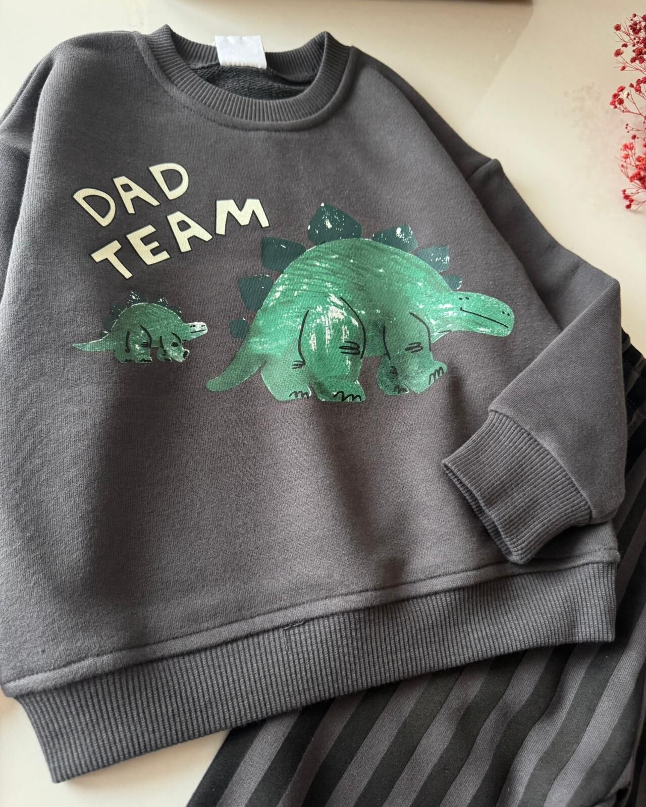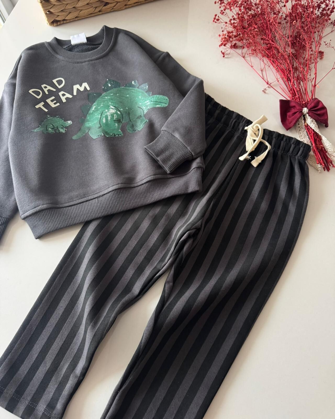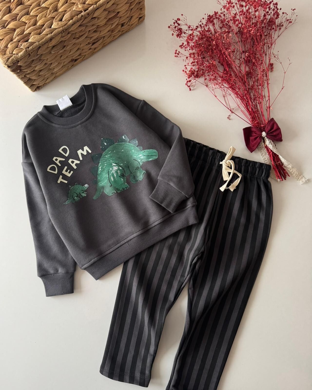 Dinozor Baskılı Çizgili Pantolonlu Takım - Füme