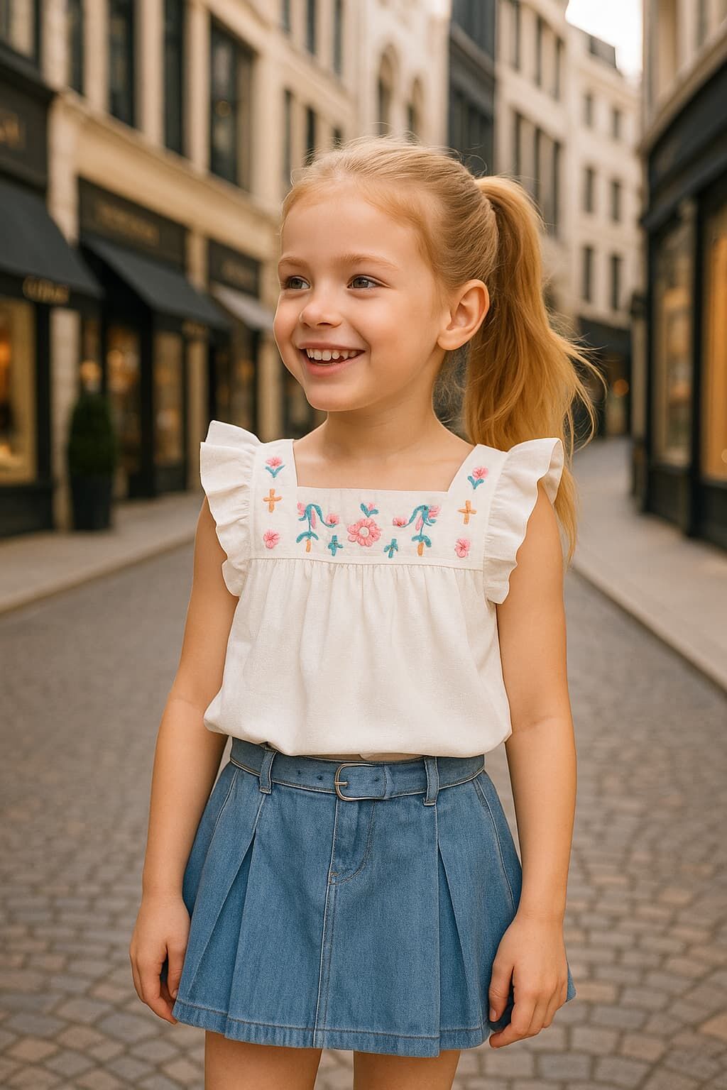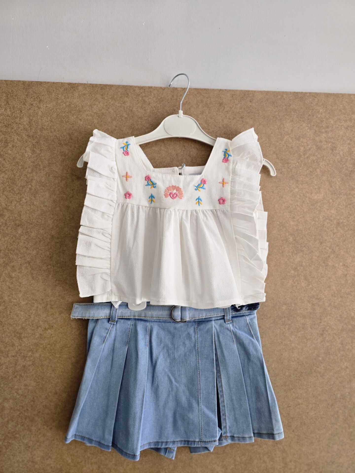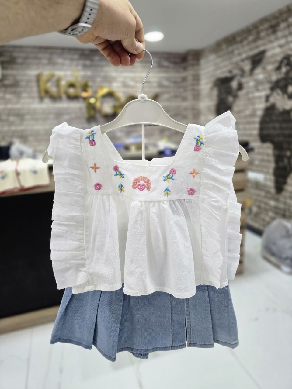 Fırfır Kollu Çiçekli Şort Etekli Defne Takım - Beyaz