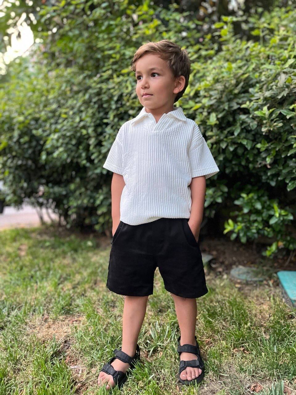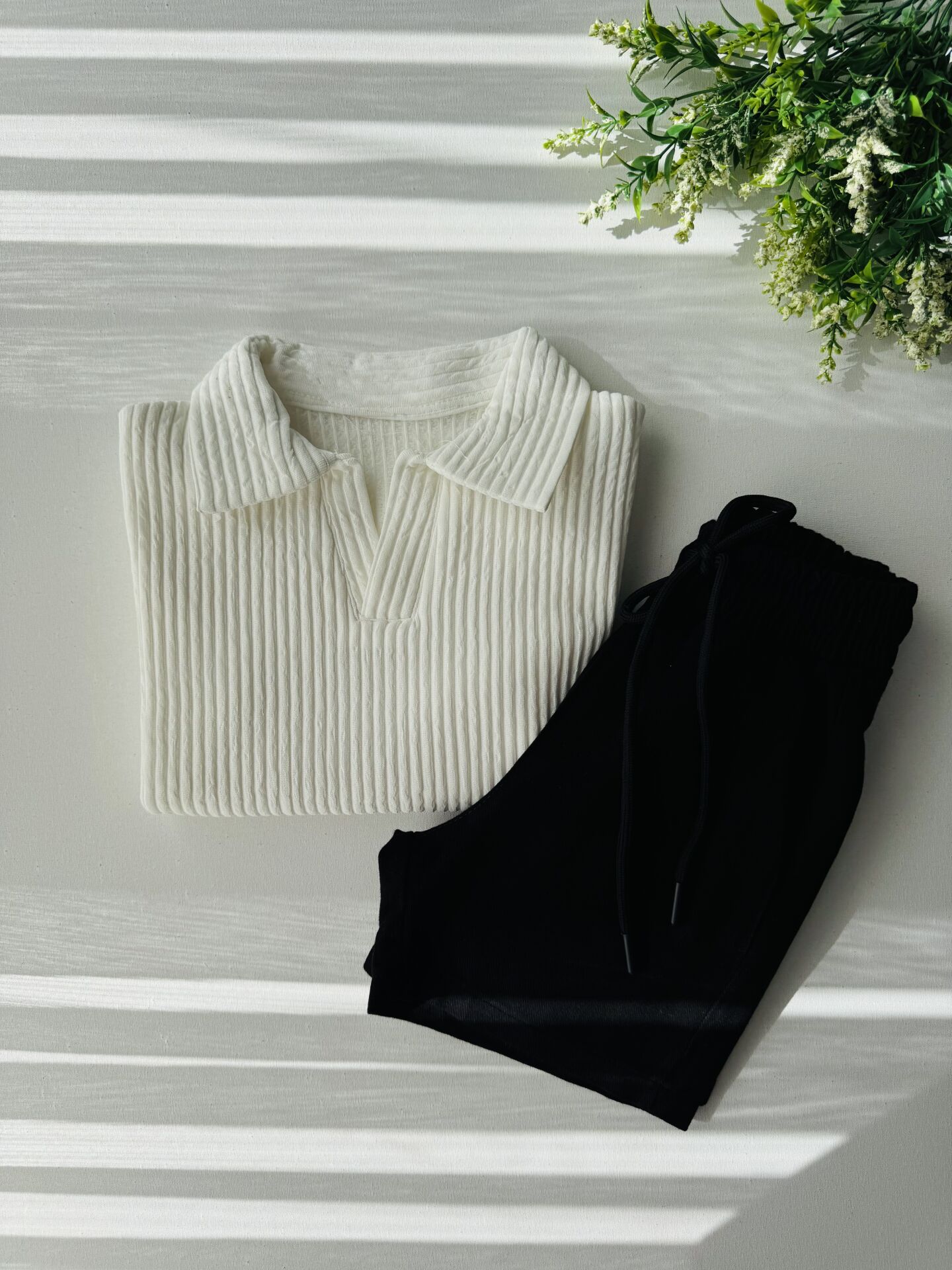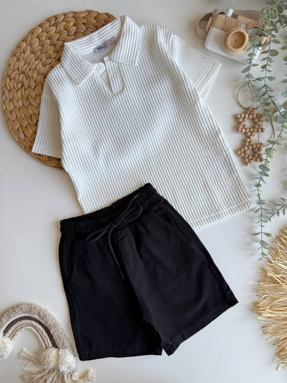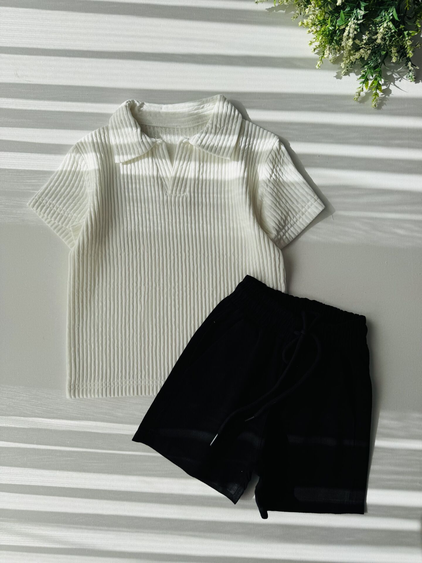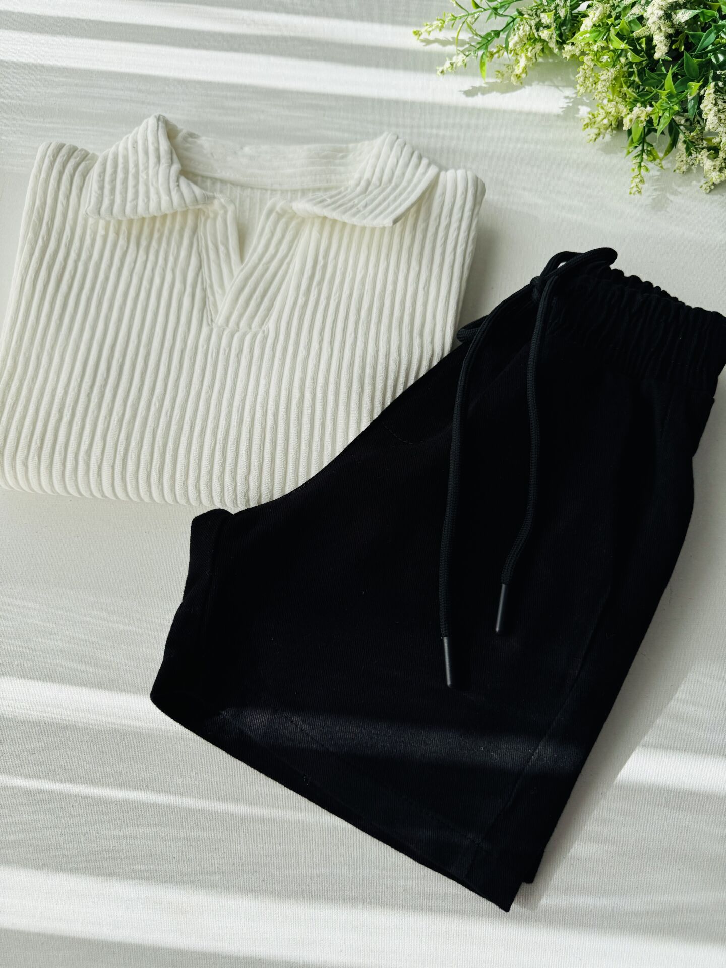 Fitilli Tişört Keten Şort Miraç Takım - Siyah Beyaz