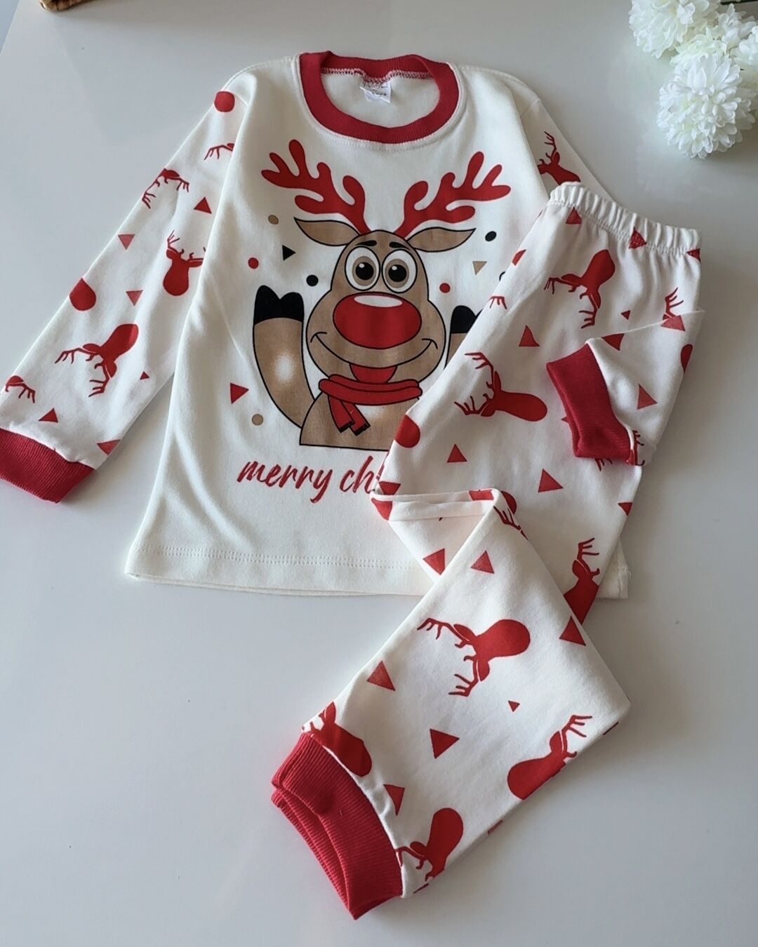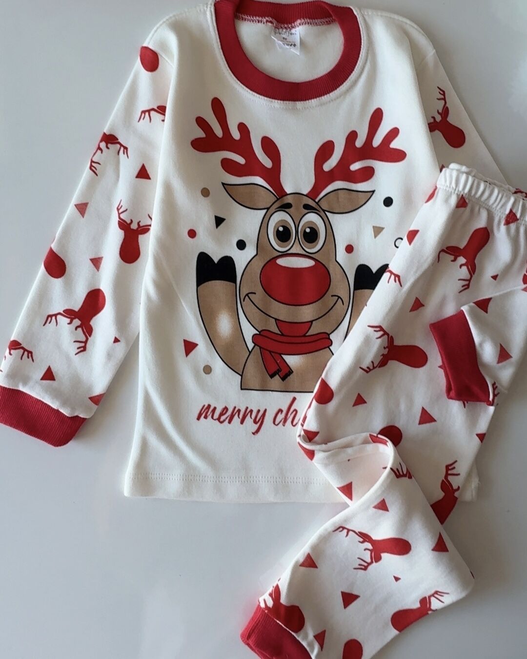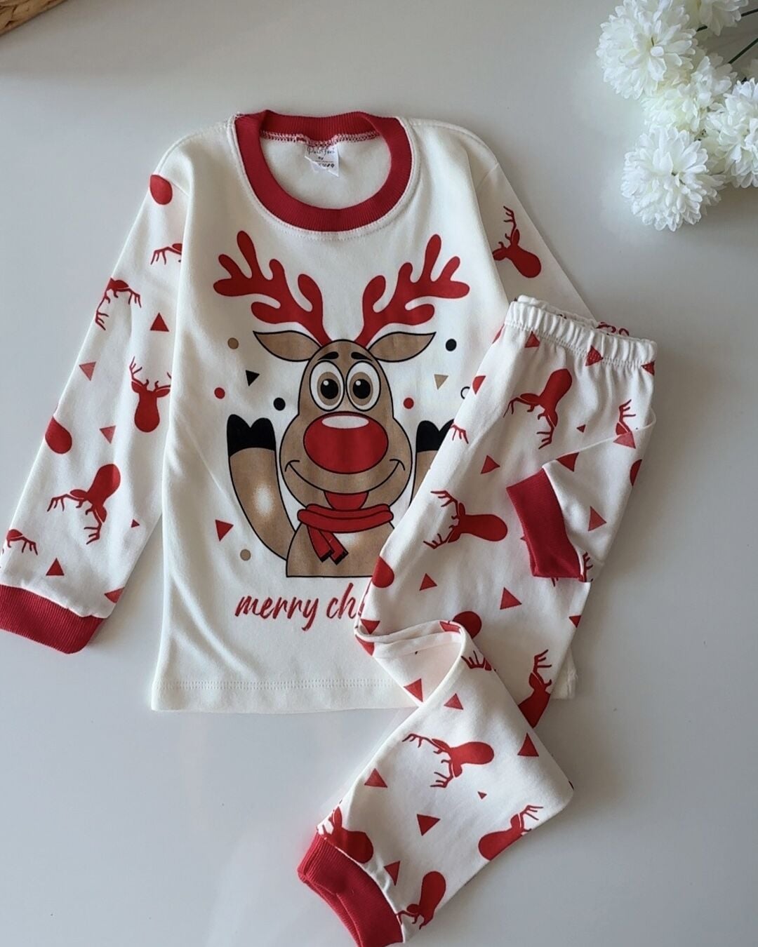 Geyik Baskılı Yeni Yıl Pijama Takımı - Beyaz